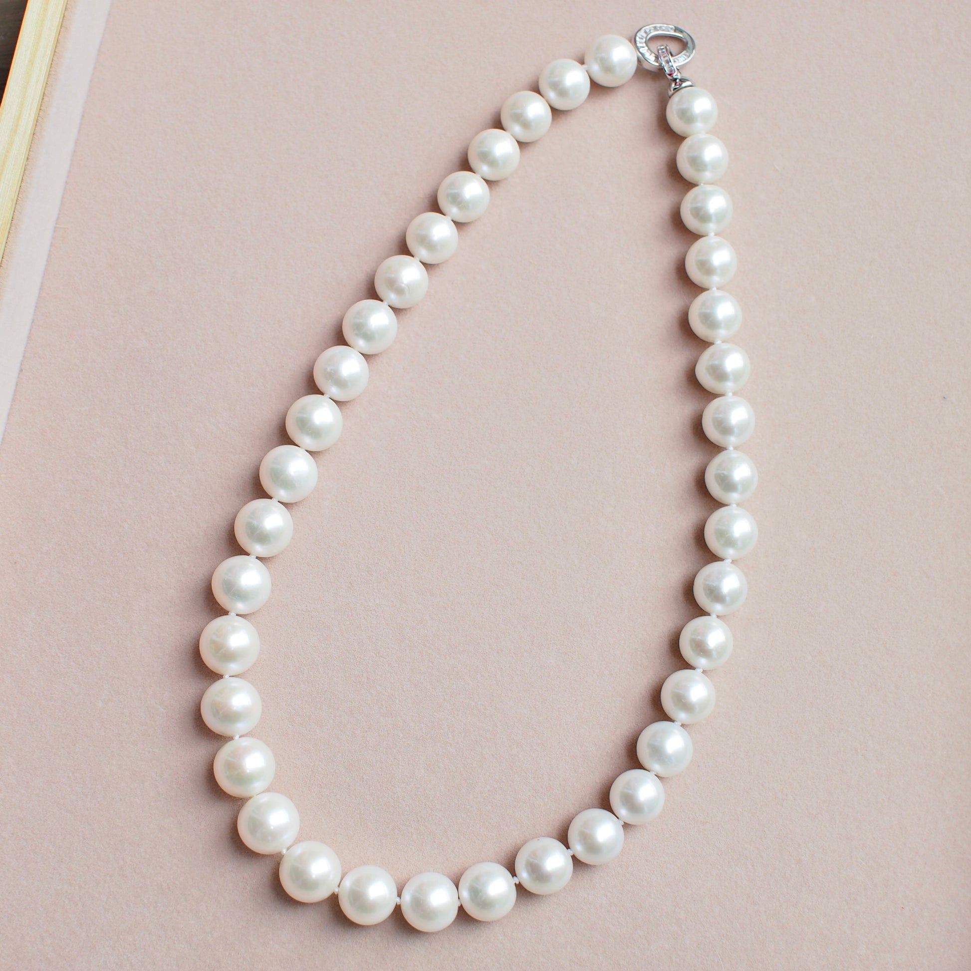 This 10–12mm freshwater pearl necklace carries a cool overtone and luminous lustre — calm, refined, and timeless.