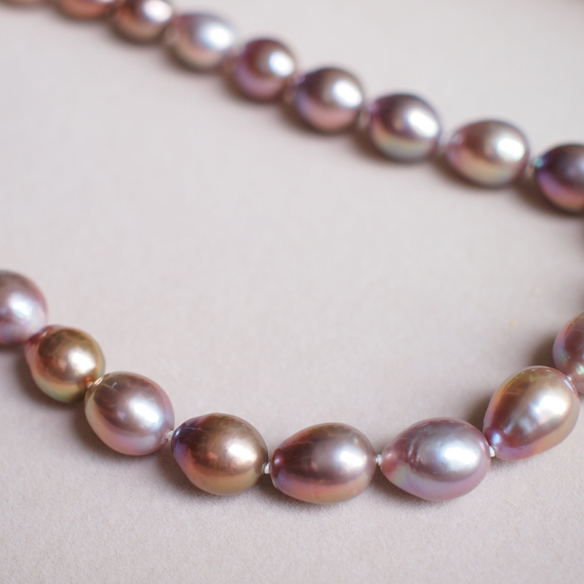 These Edison pearls are a massive 14-16mm. What makes them special isn't just the size, but the depth of their color—that complex, metallic depth. They carry a rich palette of dusty rose, champagne, and lavender-bronze that shifts with every movement.