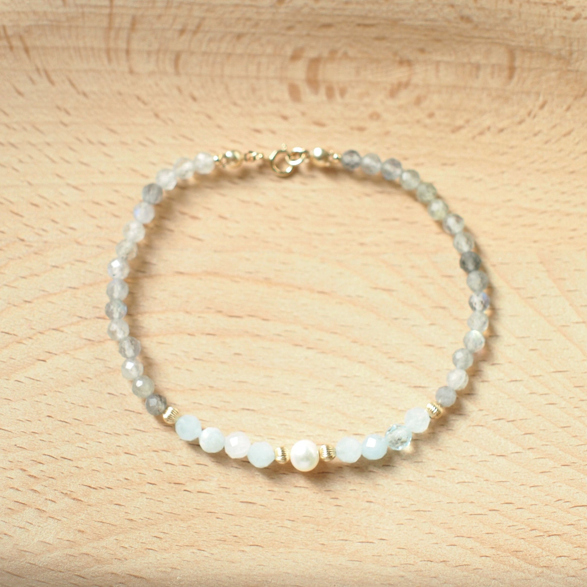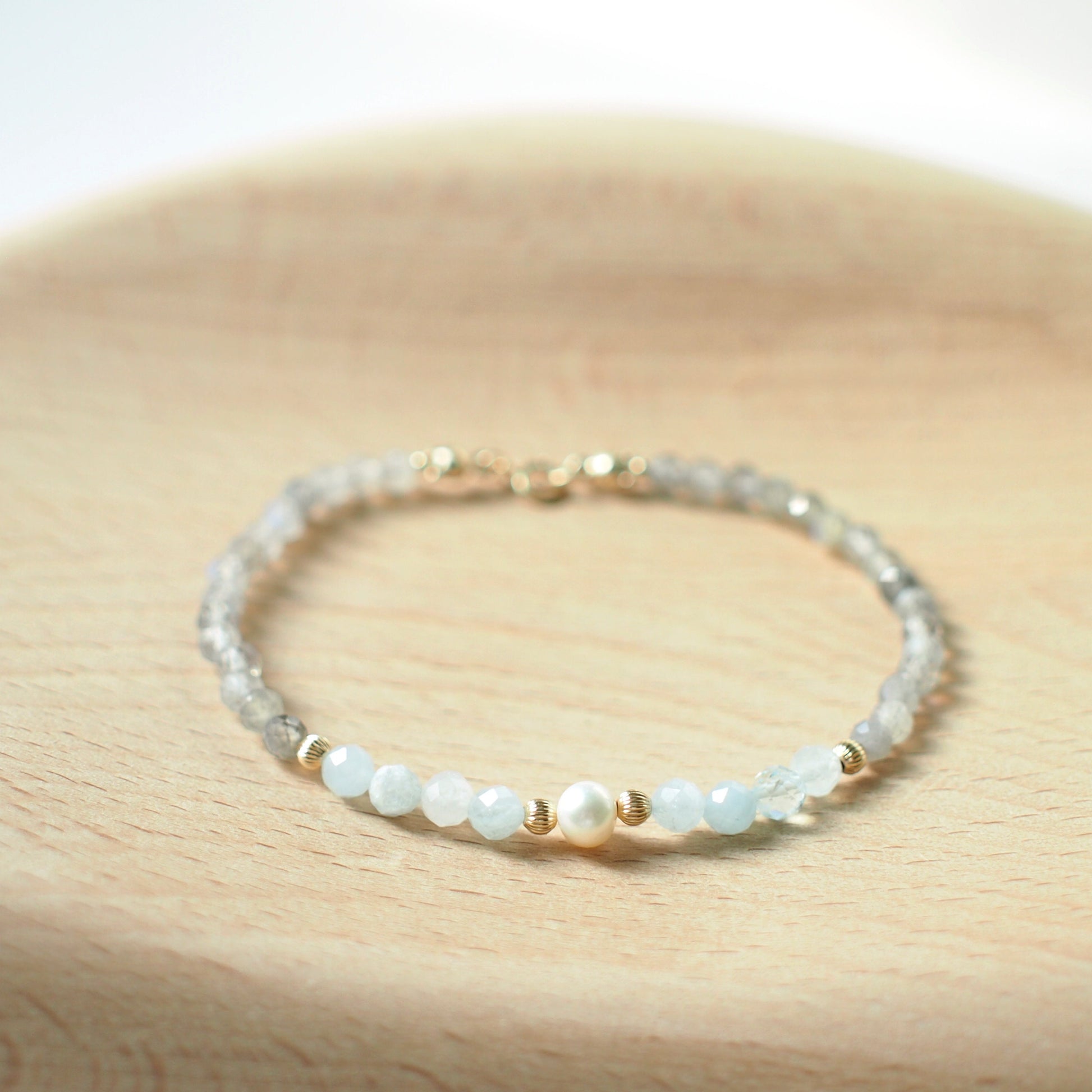 Aquamarine x Labradorite Bracelet // Pearl Charm // Dainty // 14K Gold-filled