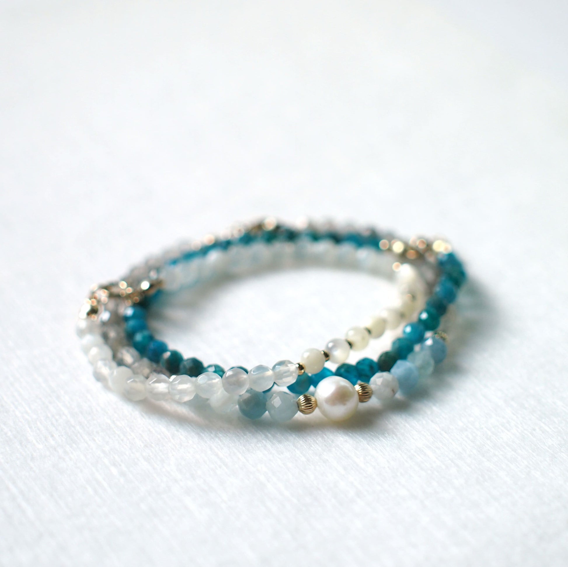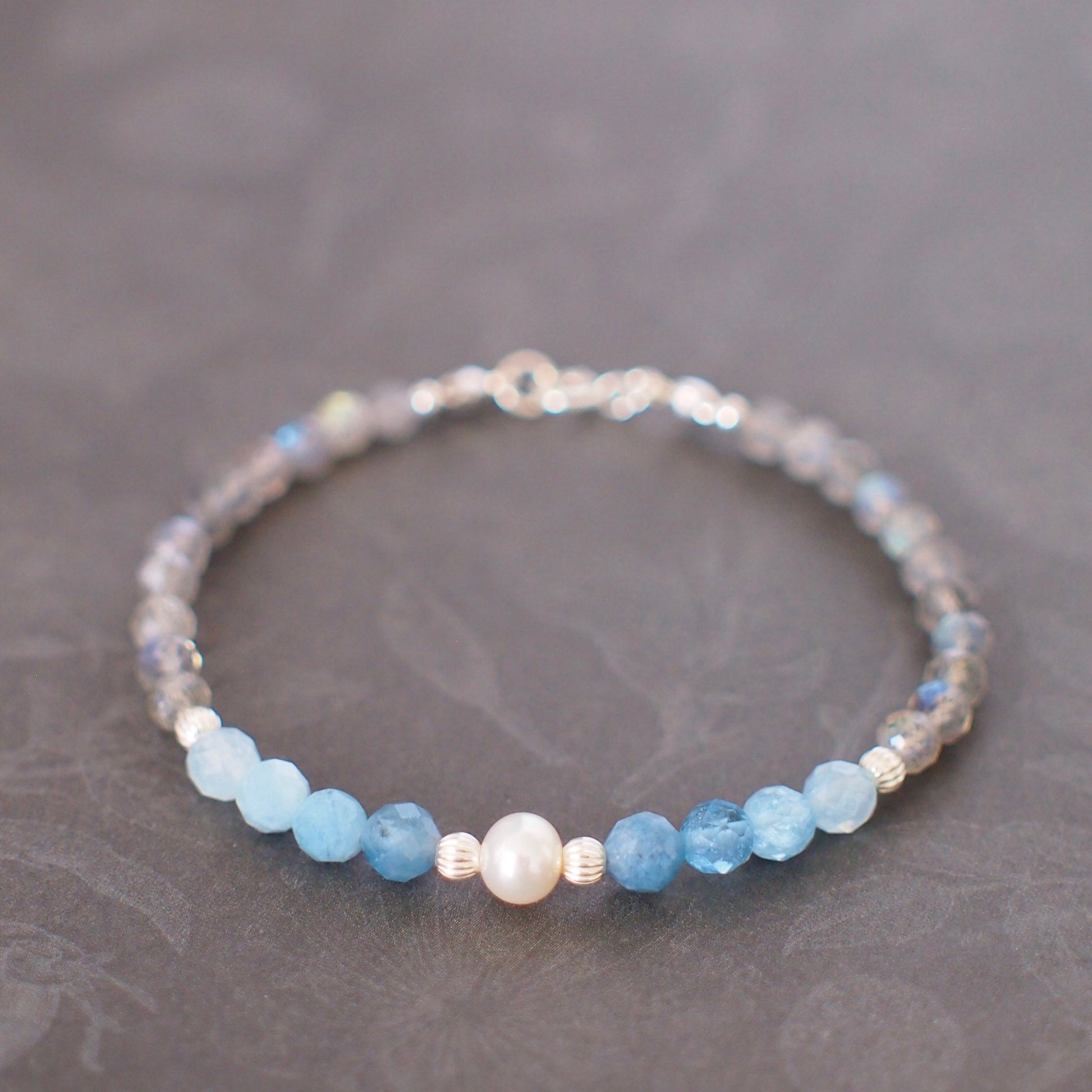 Dainty, feminine and classy. This lovely bracelet combines the beauty of faceted aquamarine in baby blue tone and faceted labradorite with a tint a blue in reflection, and a round fresh water pearl featured as a charm. A very refreshing and sweet combination that could stack elegantly with other bracelets or bangles.