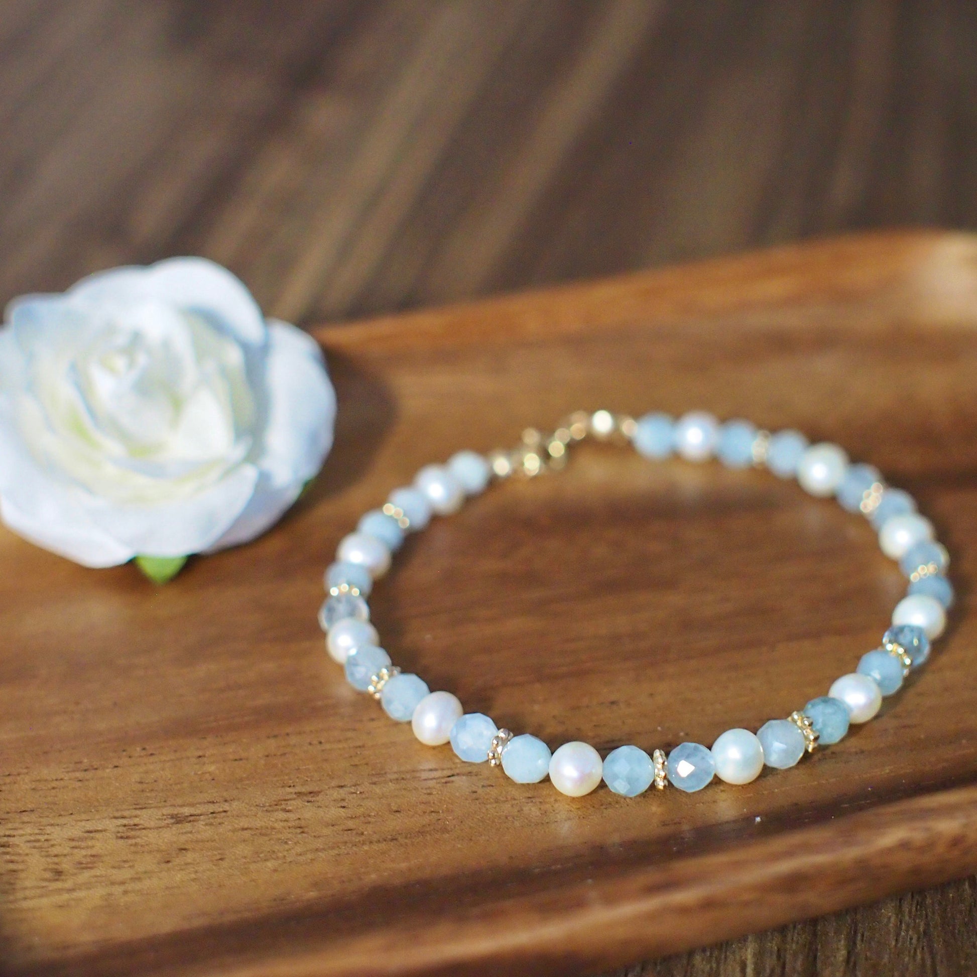Dainty, feminine and sweet. This beautiful bracelet combines faceted, sparkly baby blue aquamarine and white fresh water pearls. The two go incredibly well with each other. It looks tasteful and sweet. This dainty bracelet could stack elegantly with other bracelets or bangles.