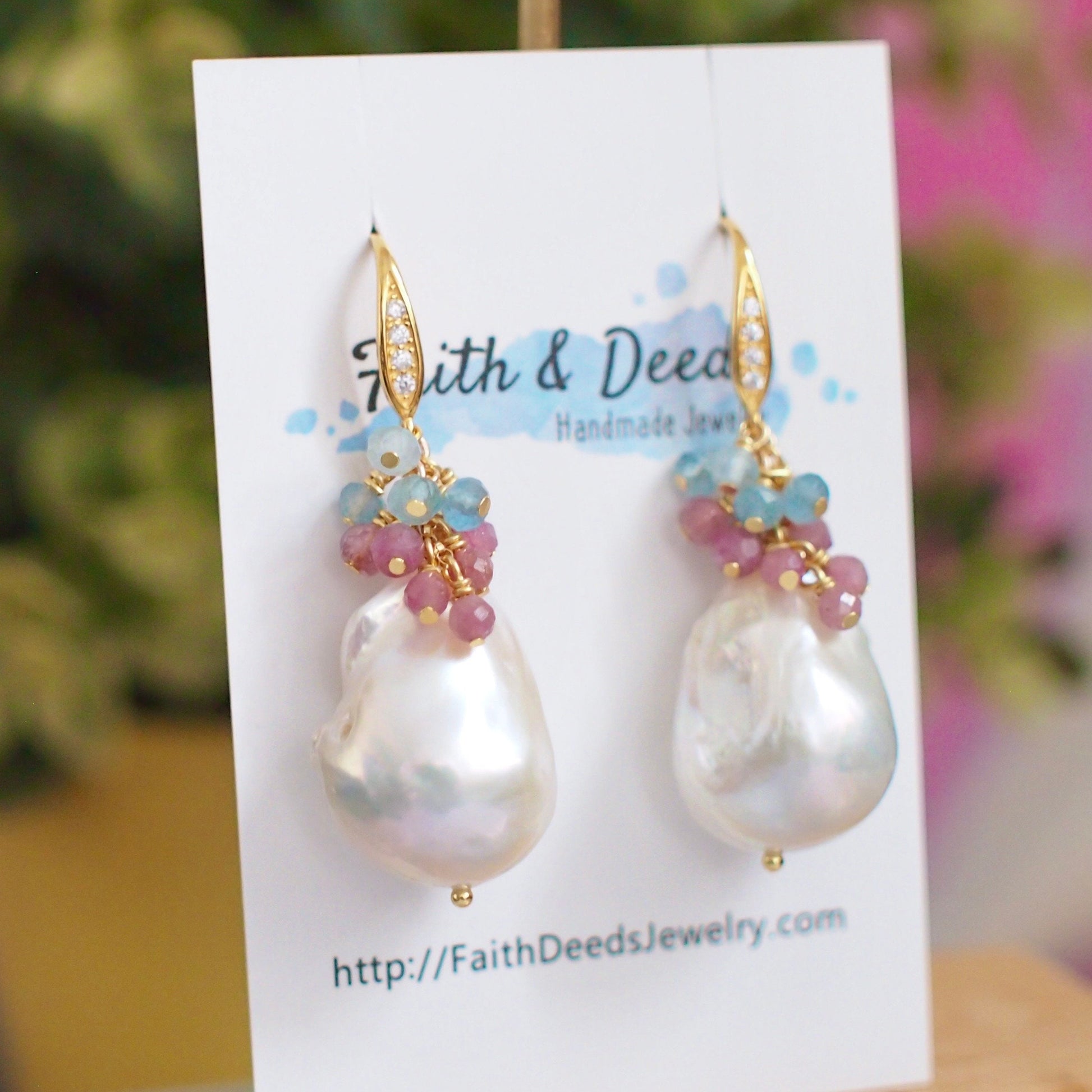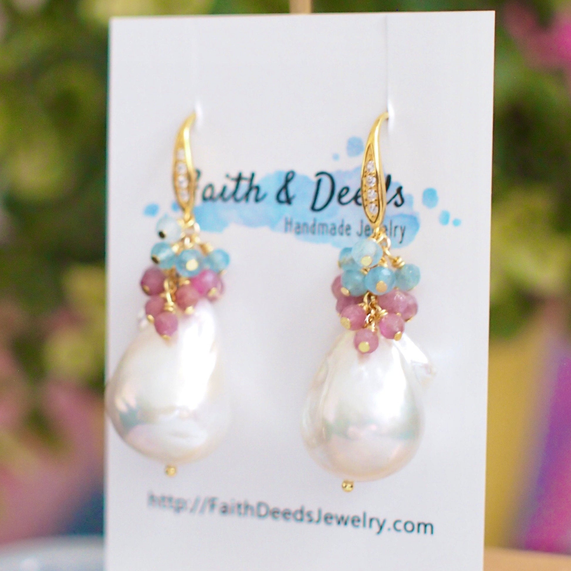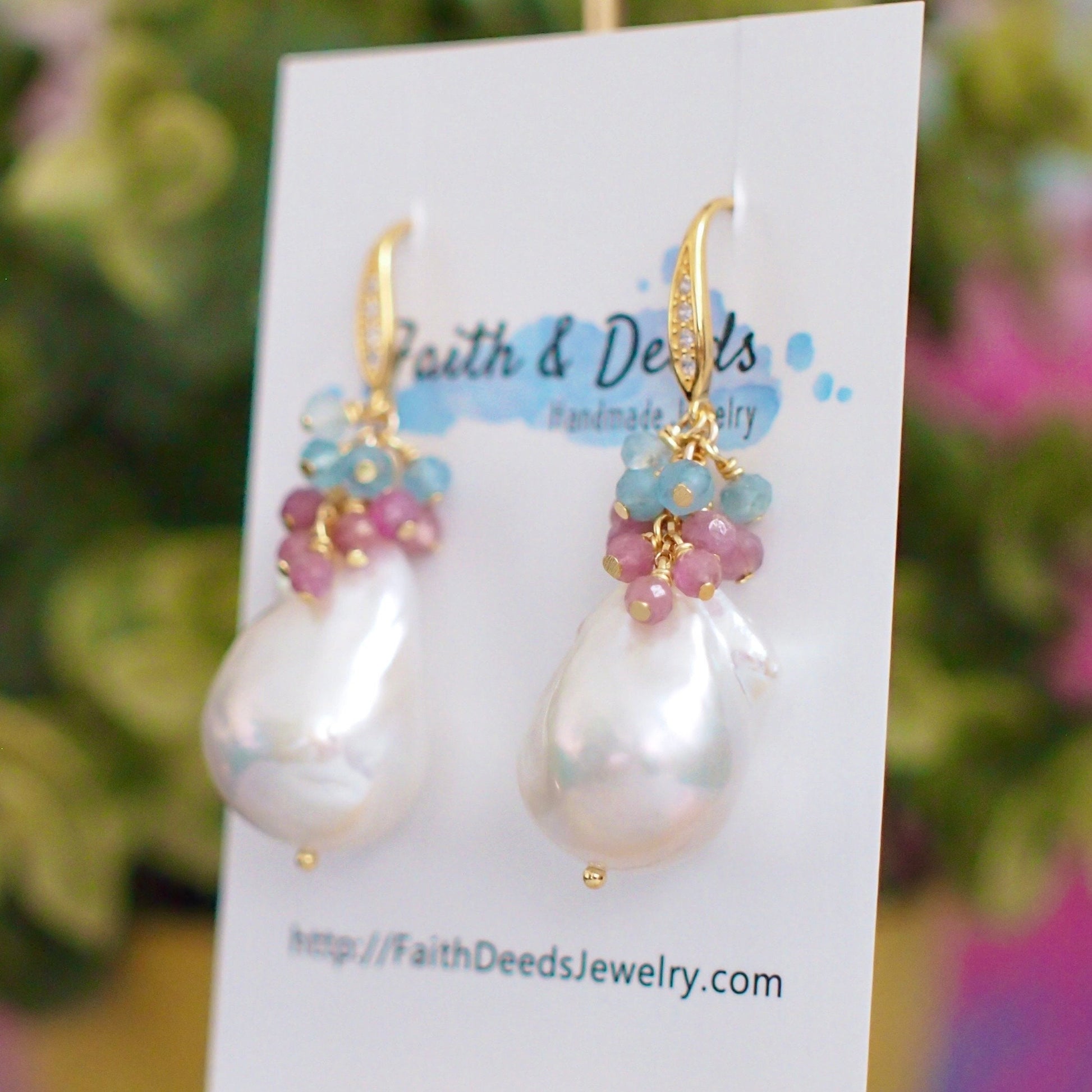 Baroque Pearl Earrings // Statement Earrings // Gems Cluster // Pink Tourmaline x Aquamarine // 14K Gold-filled