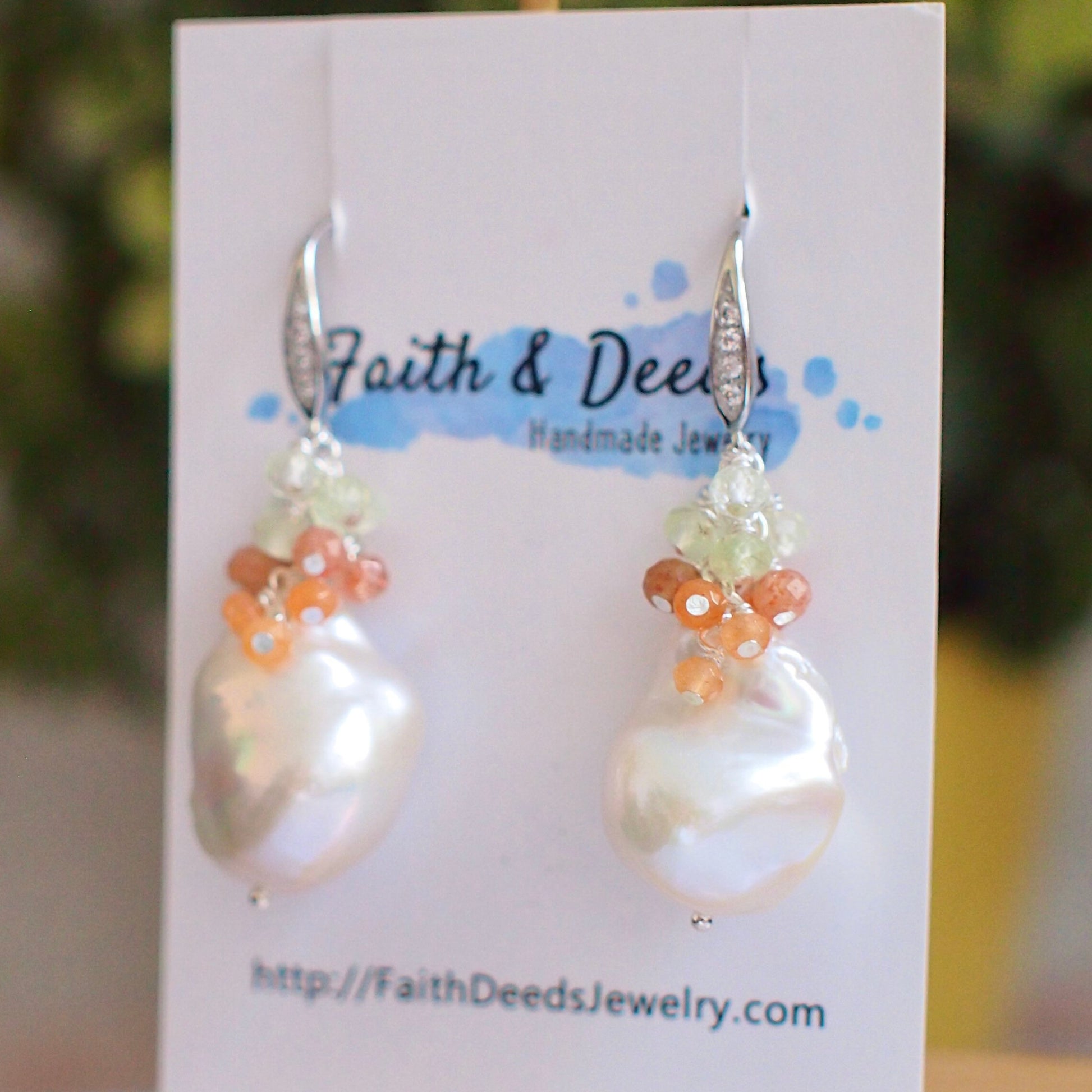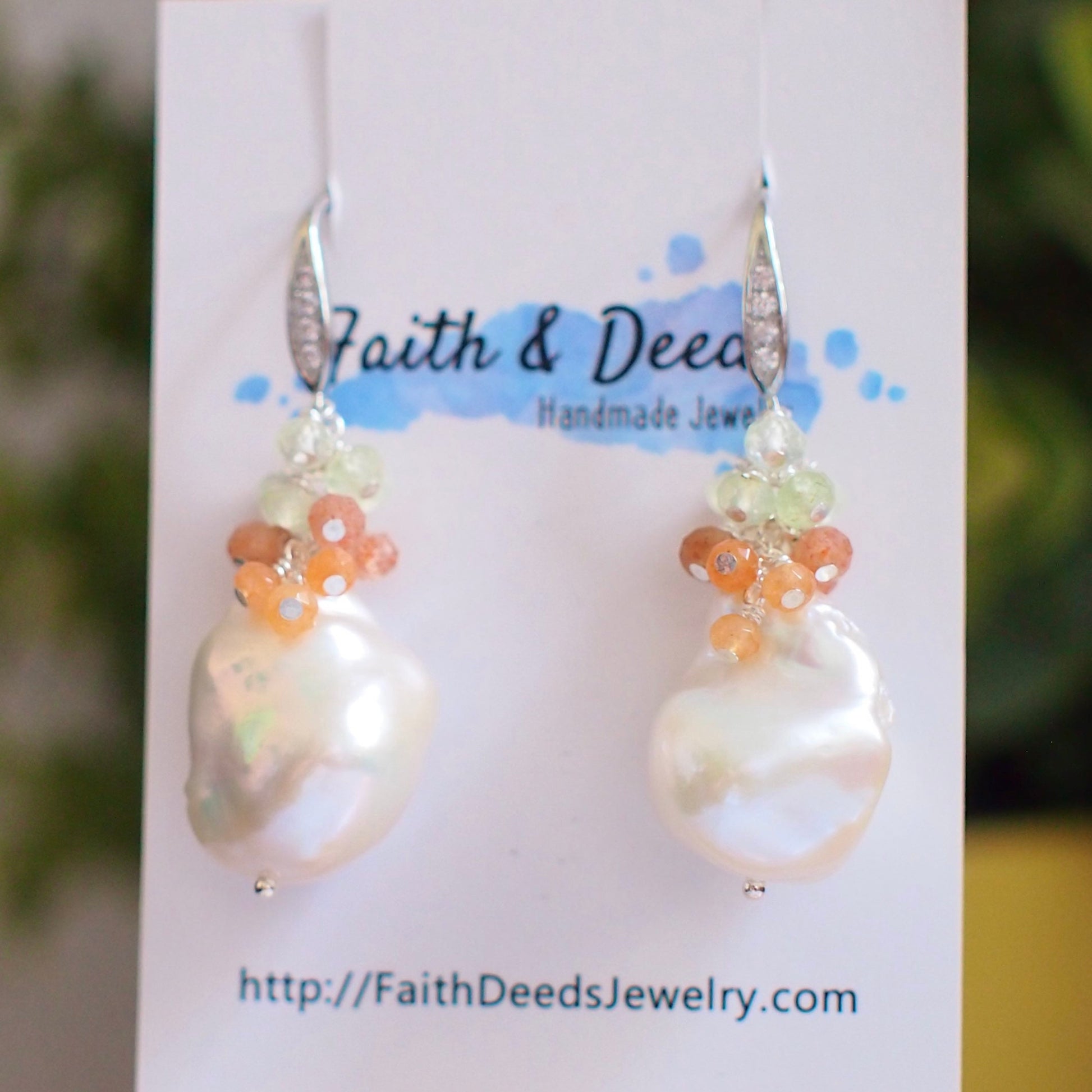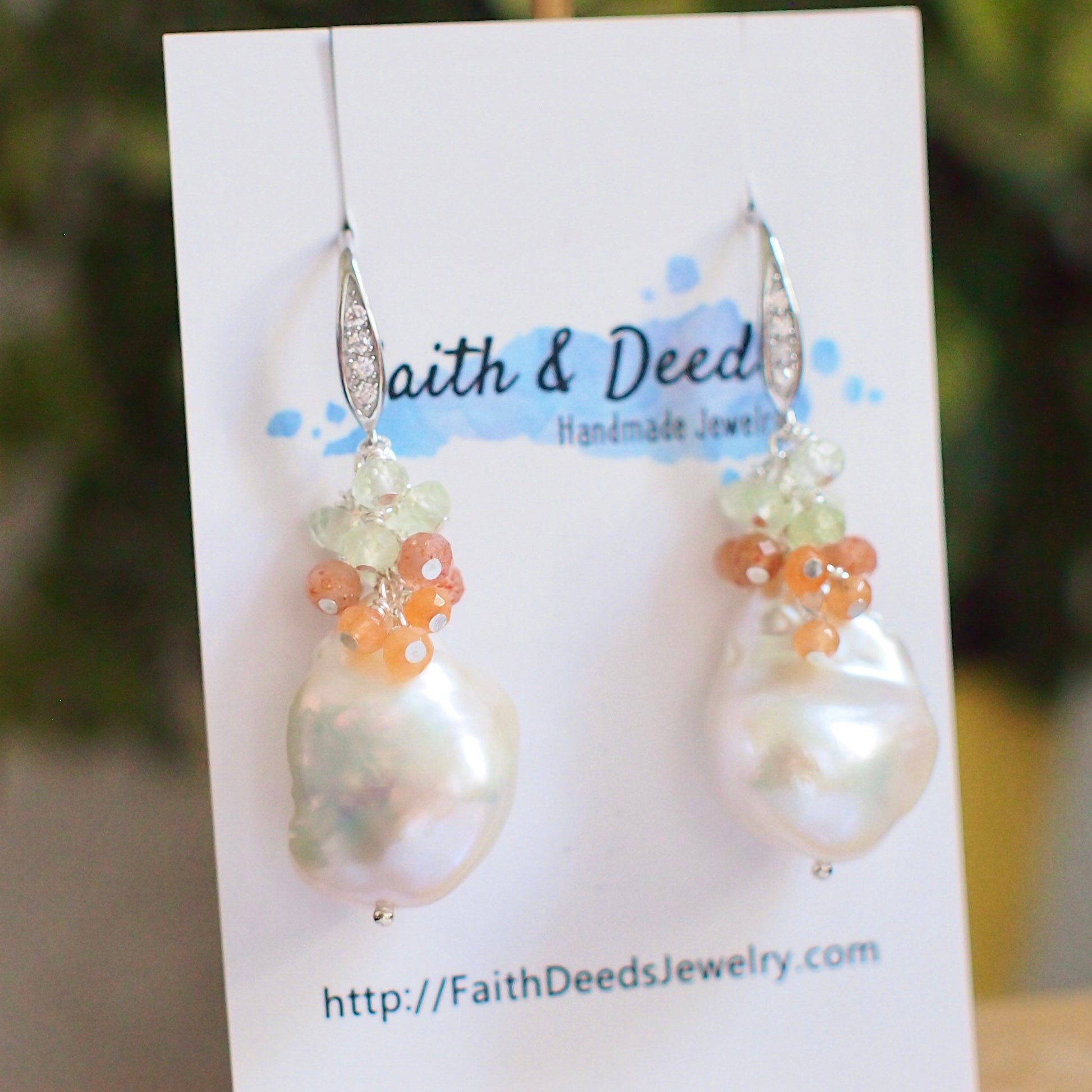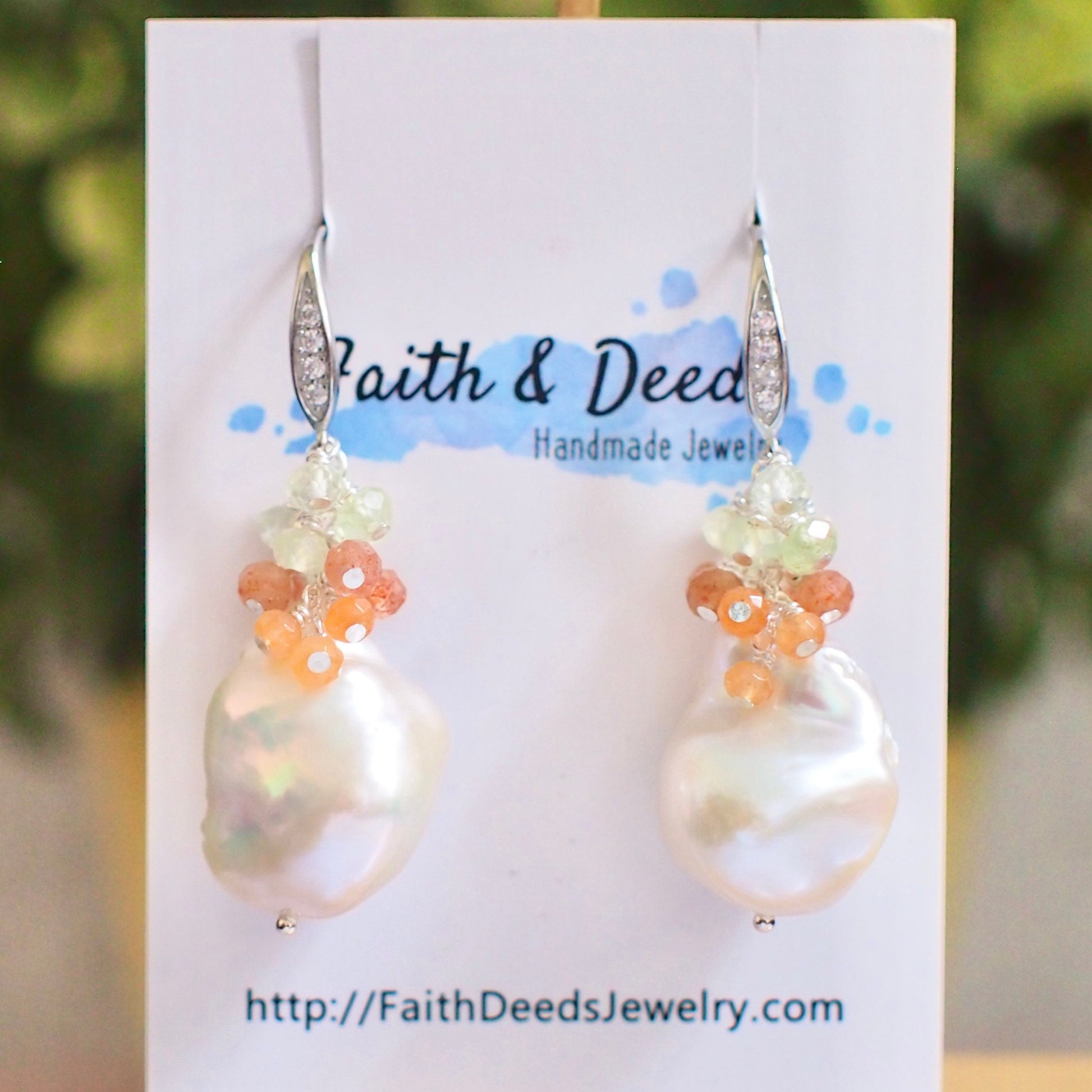 Baroque Pearl Earrings // Statement Earrings // Gems Cluster // Sunstone x Prehnite // 925 Sterling Silver
