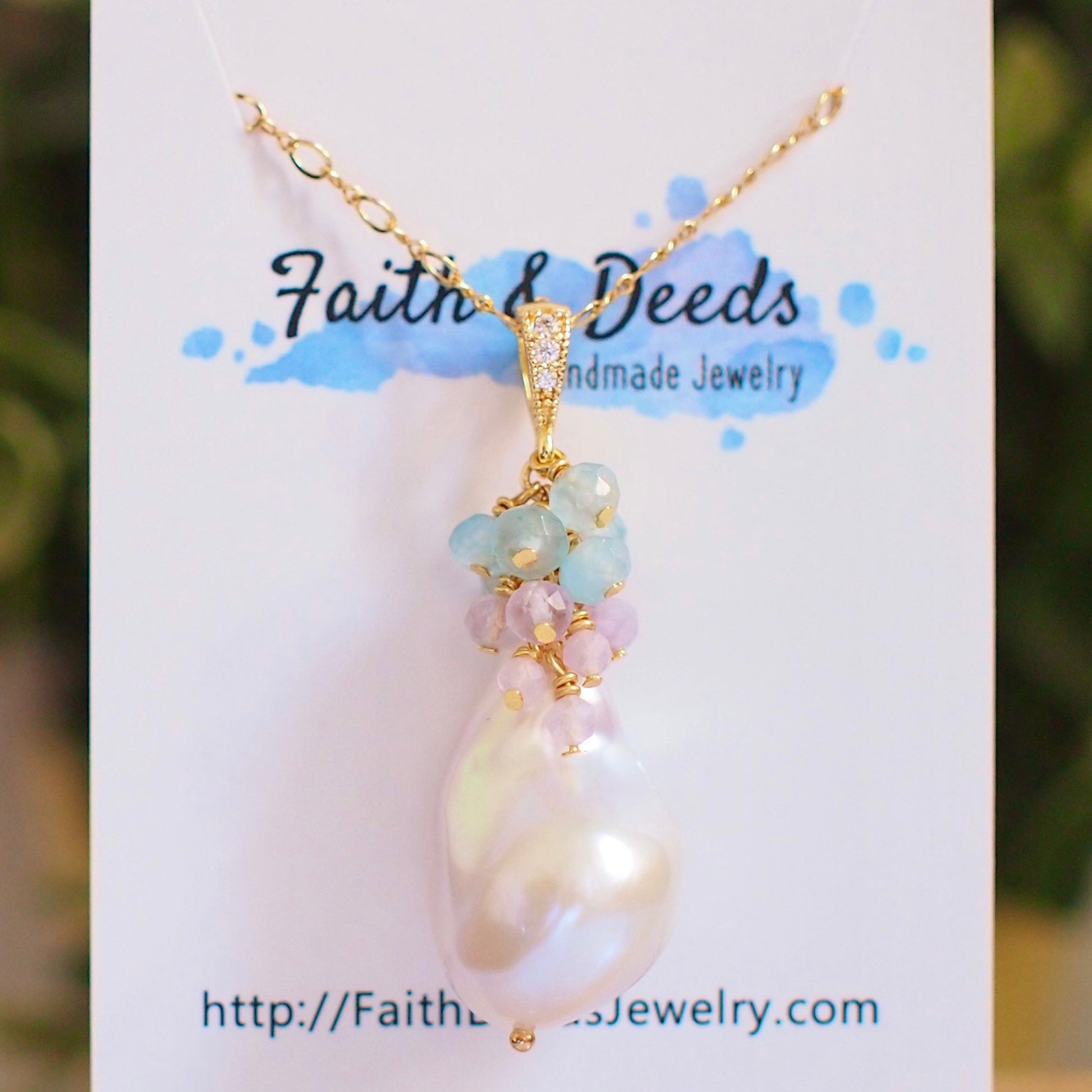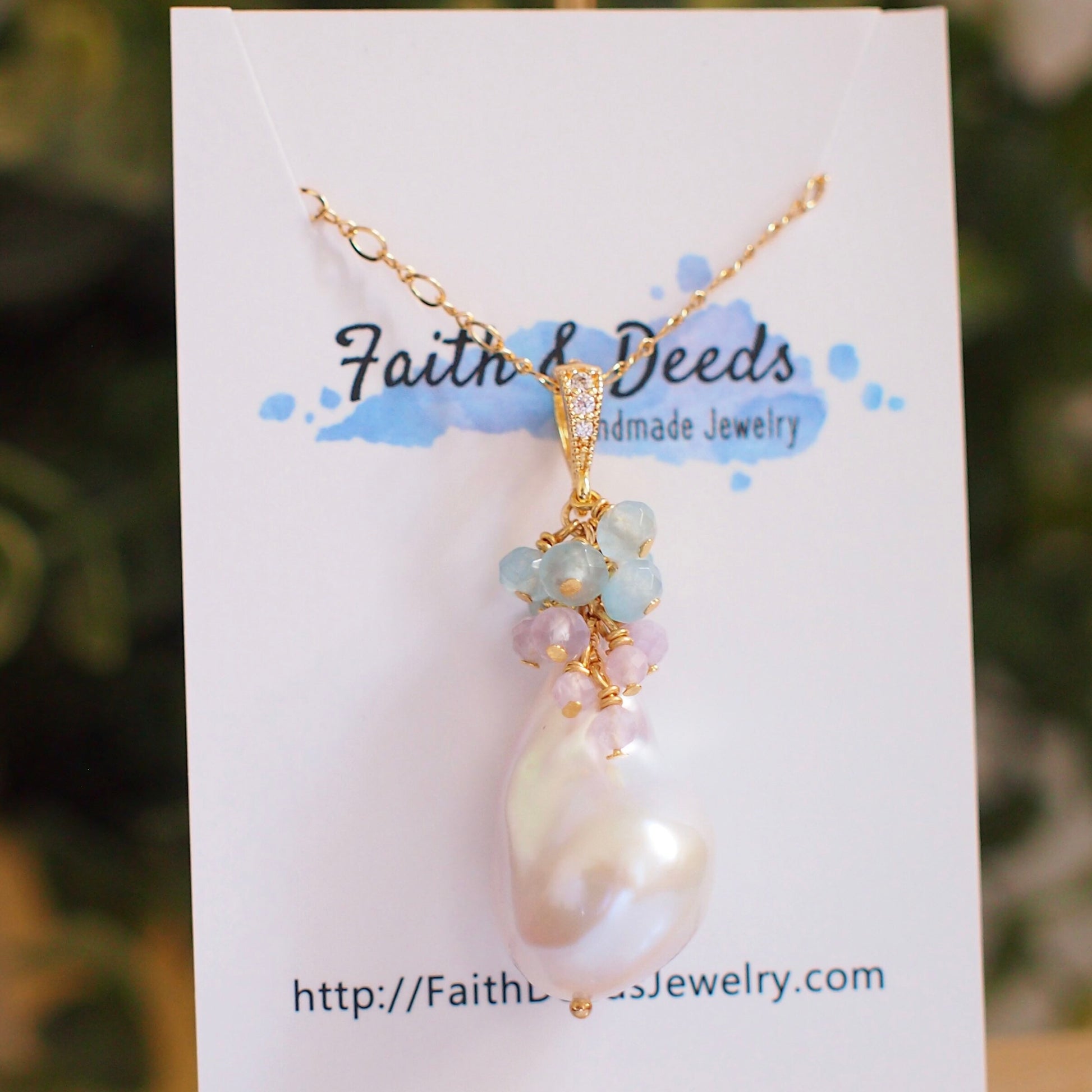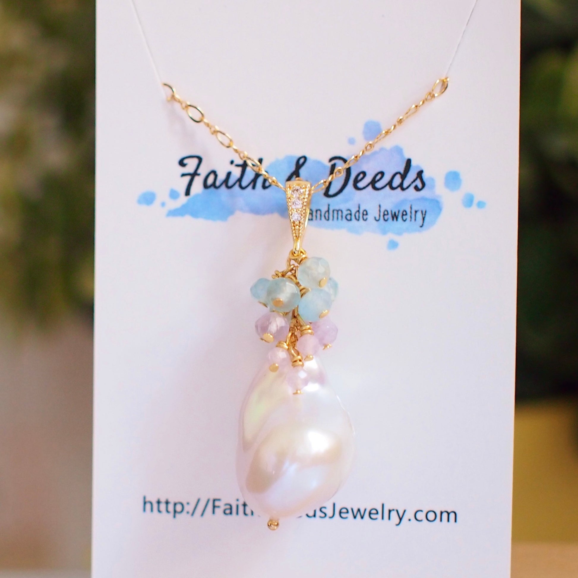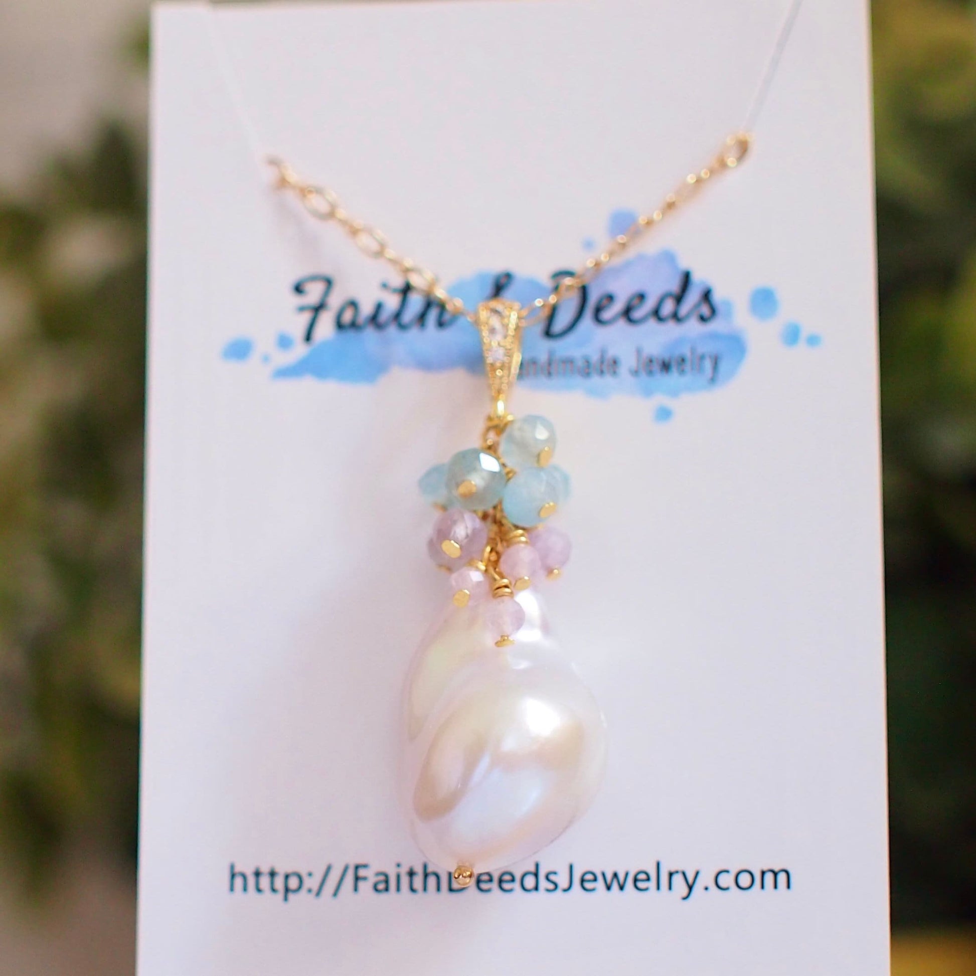 Baroque Pearl Pendant // Flameball Pearl // Long Statement Necklace // Amethyst x Chalcedony // 14K Gold-filled