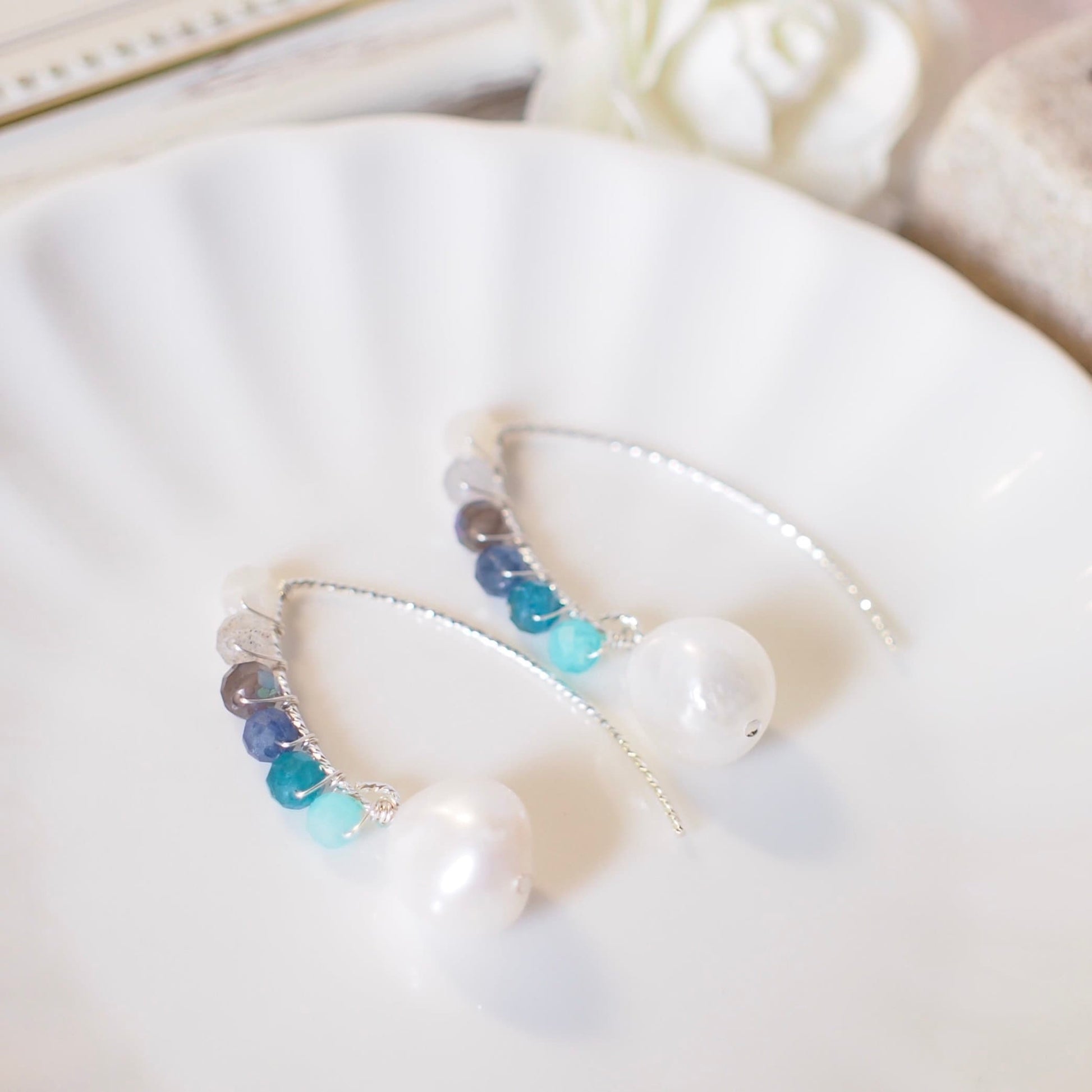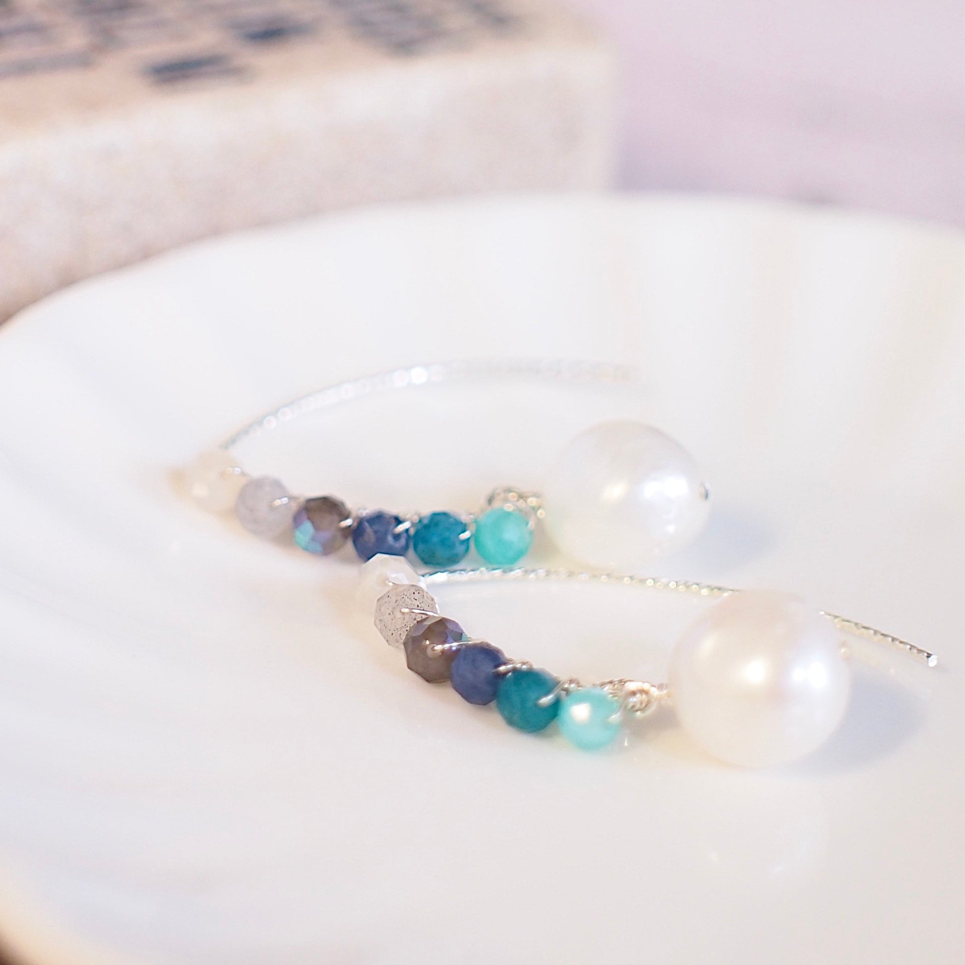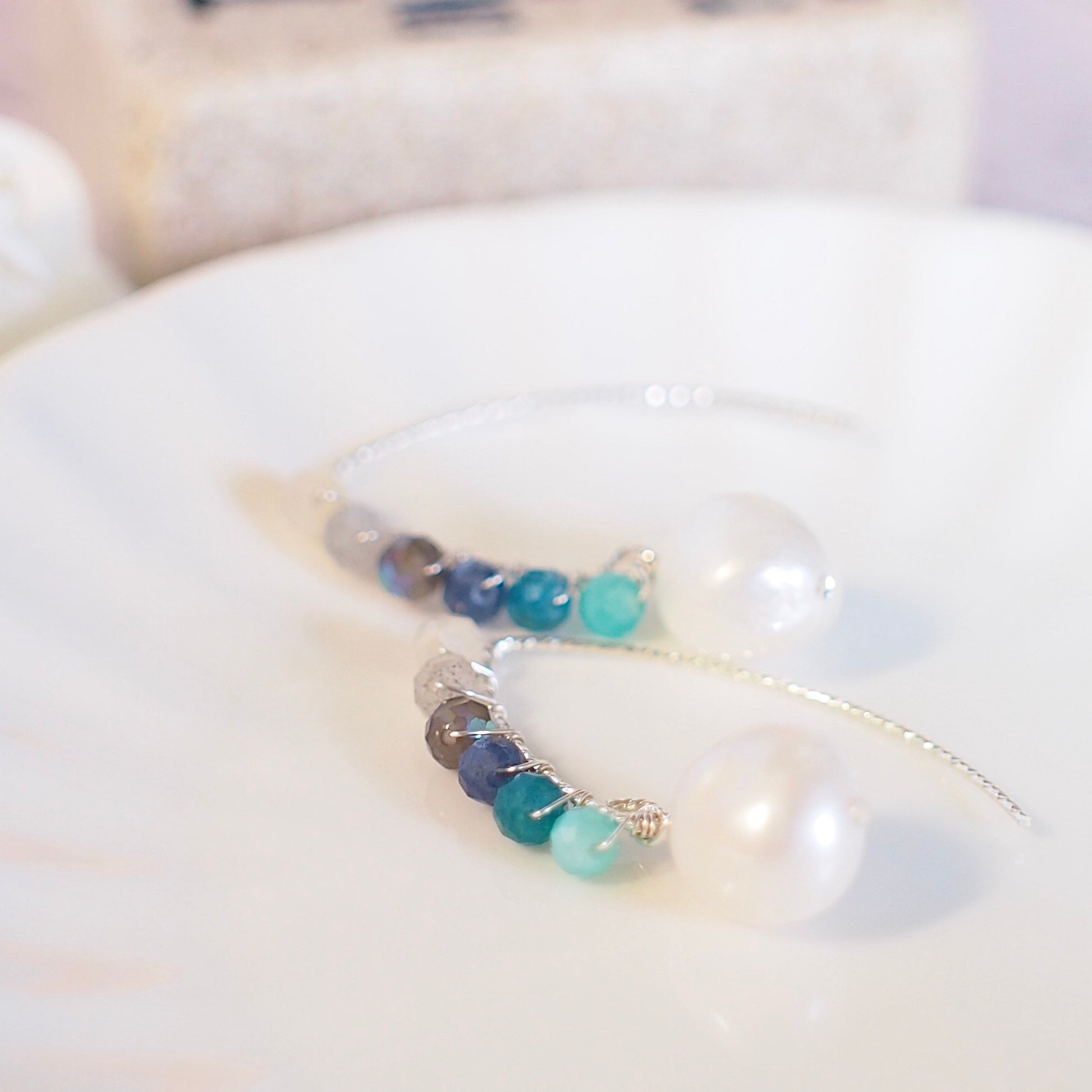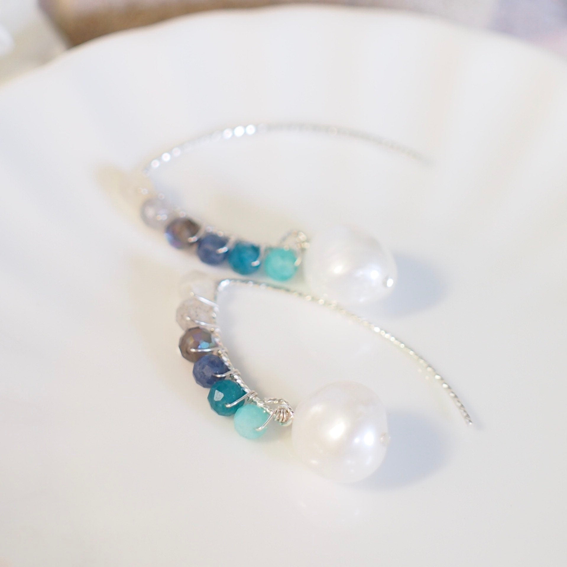 These gorgeous earrings are made with baroque pearls in white colour dangling on big 925 sterling silver earwires with faceted gems wrapped around in ombre style. Those are white moonstones, gray quartz, labradorite, blue sapphire, apatite and amazonite. A very stunning and chic combination with the pearls.