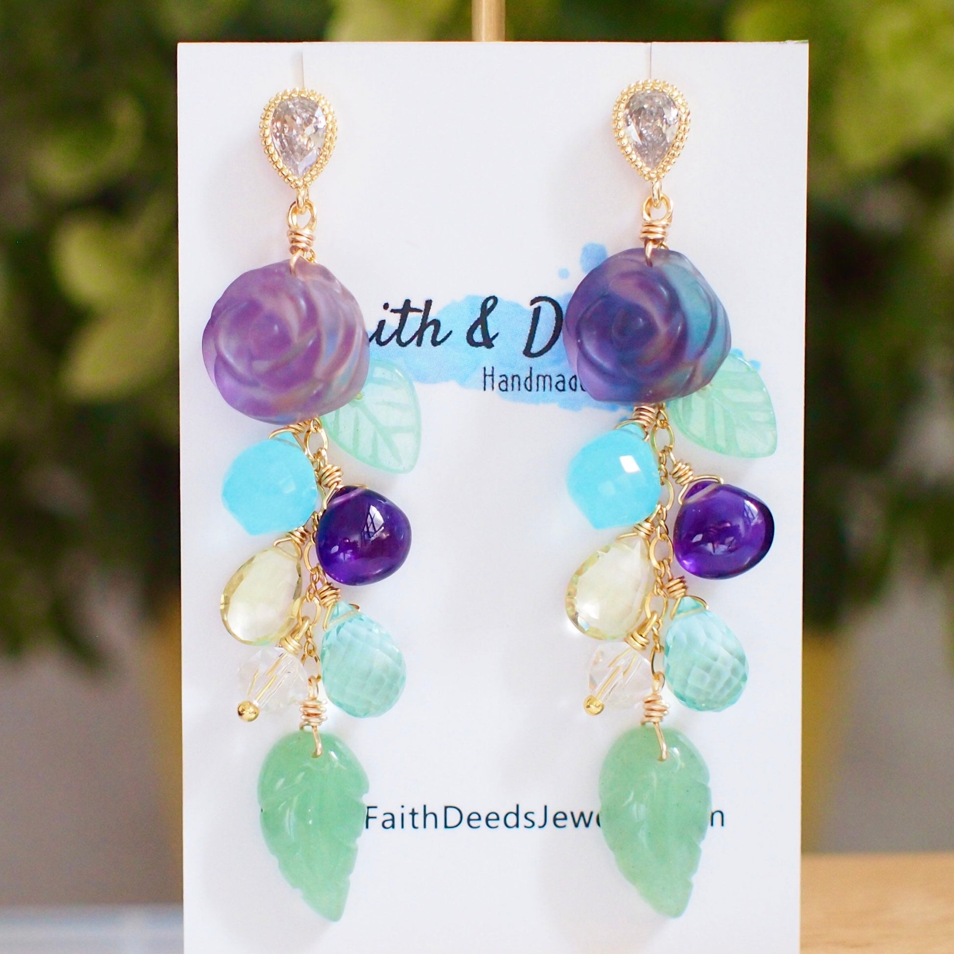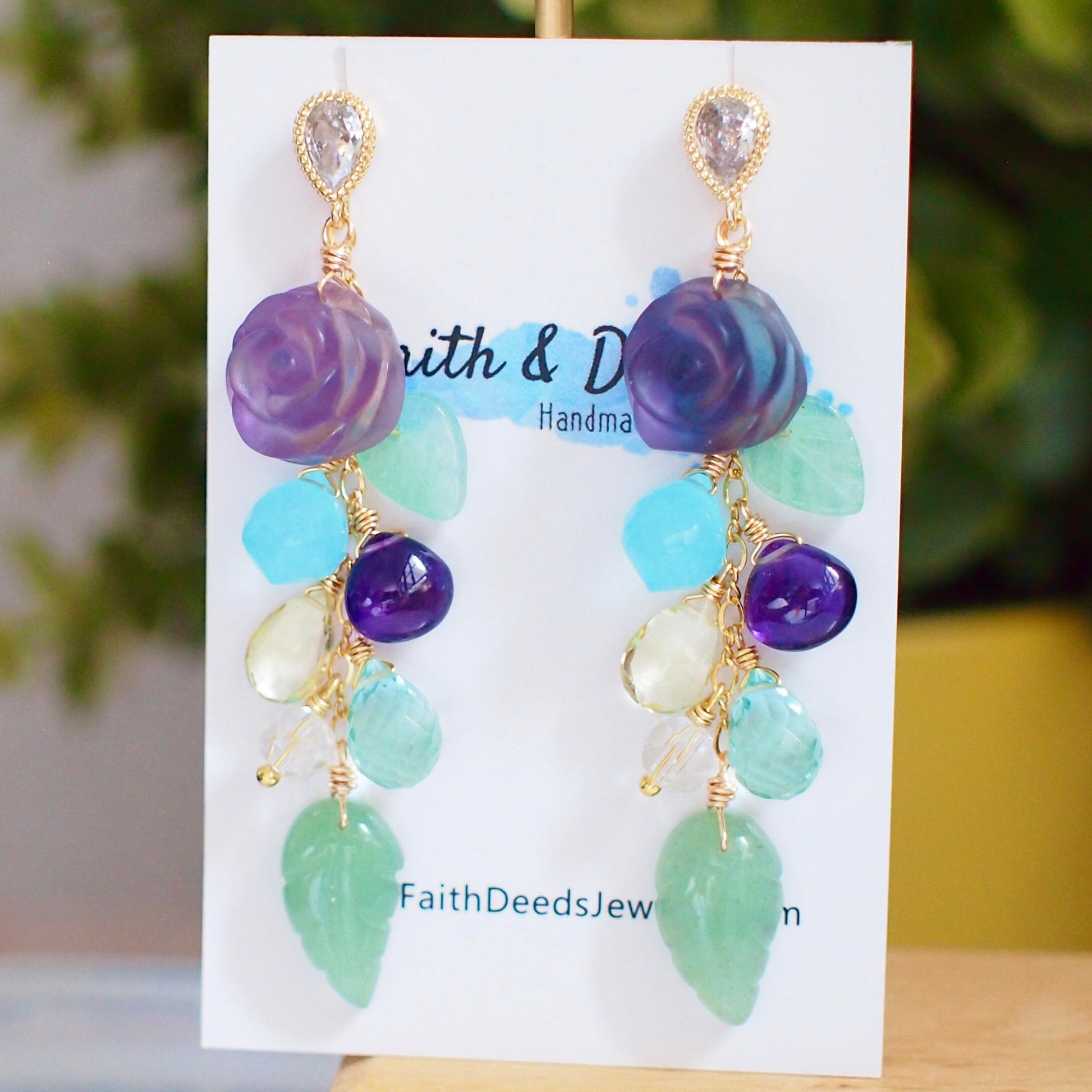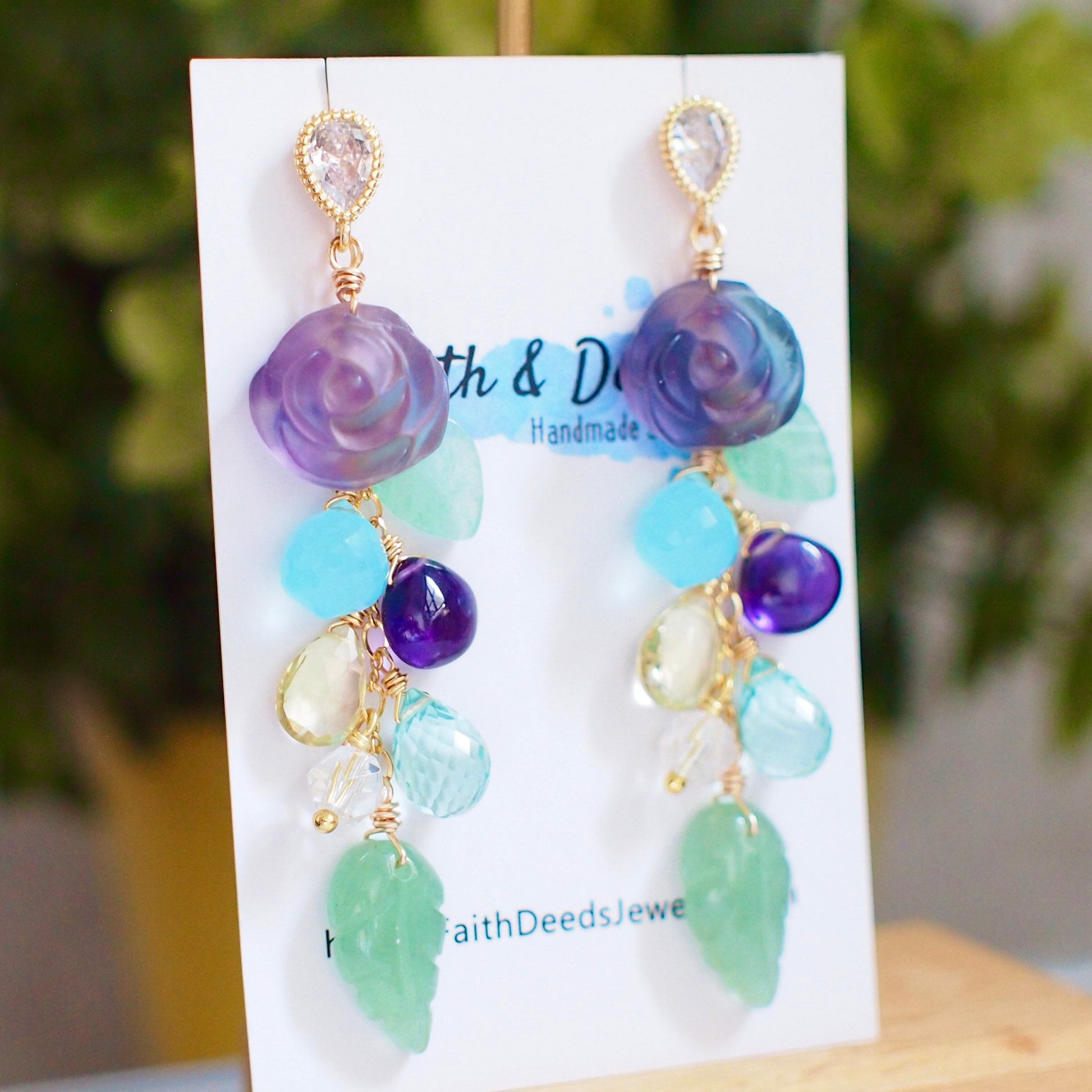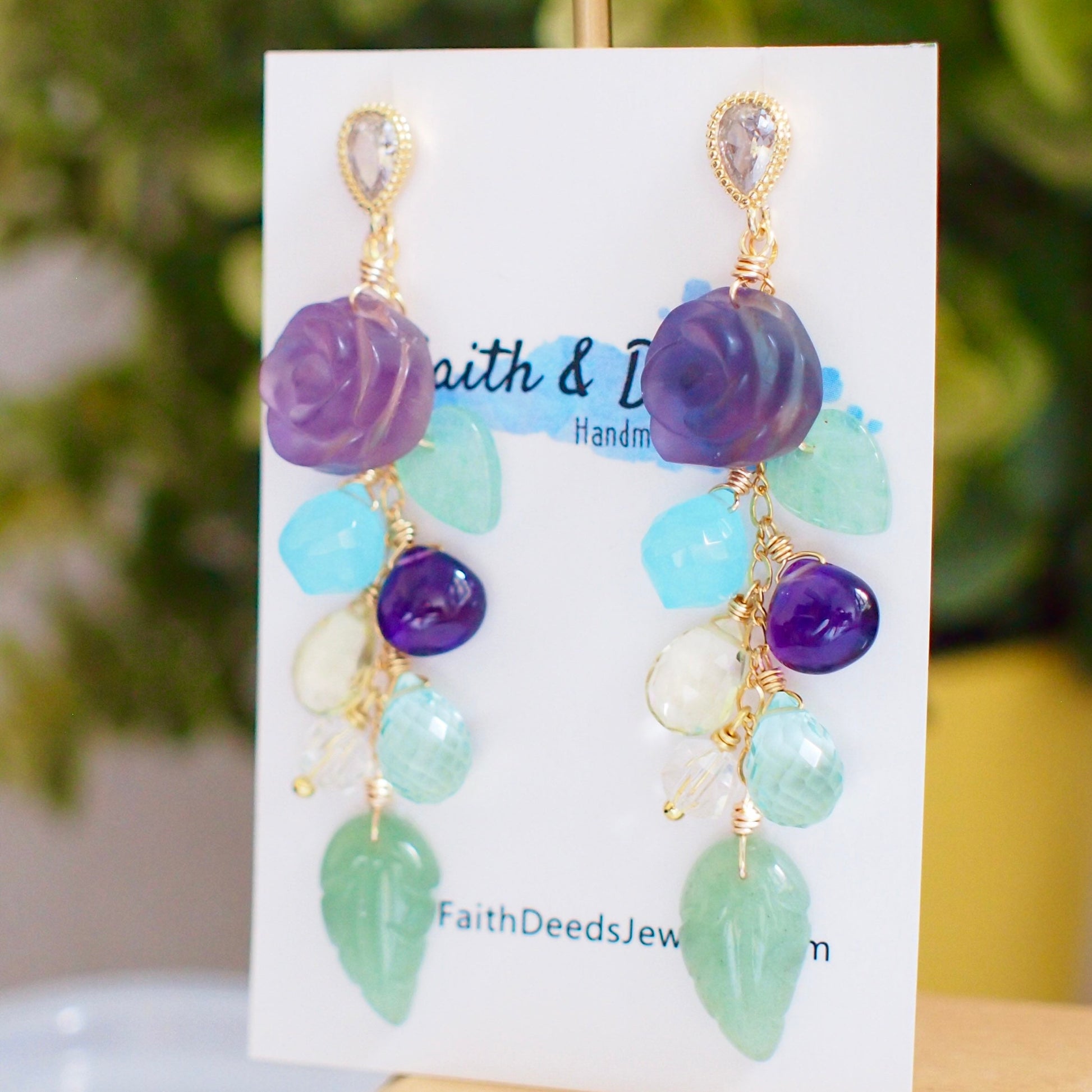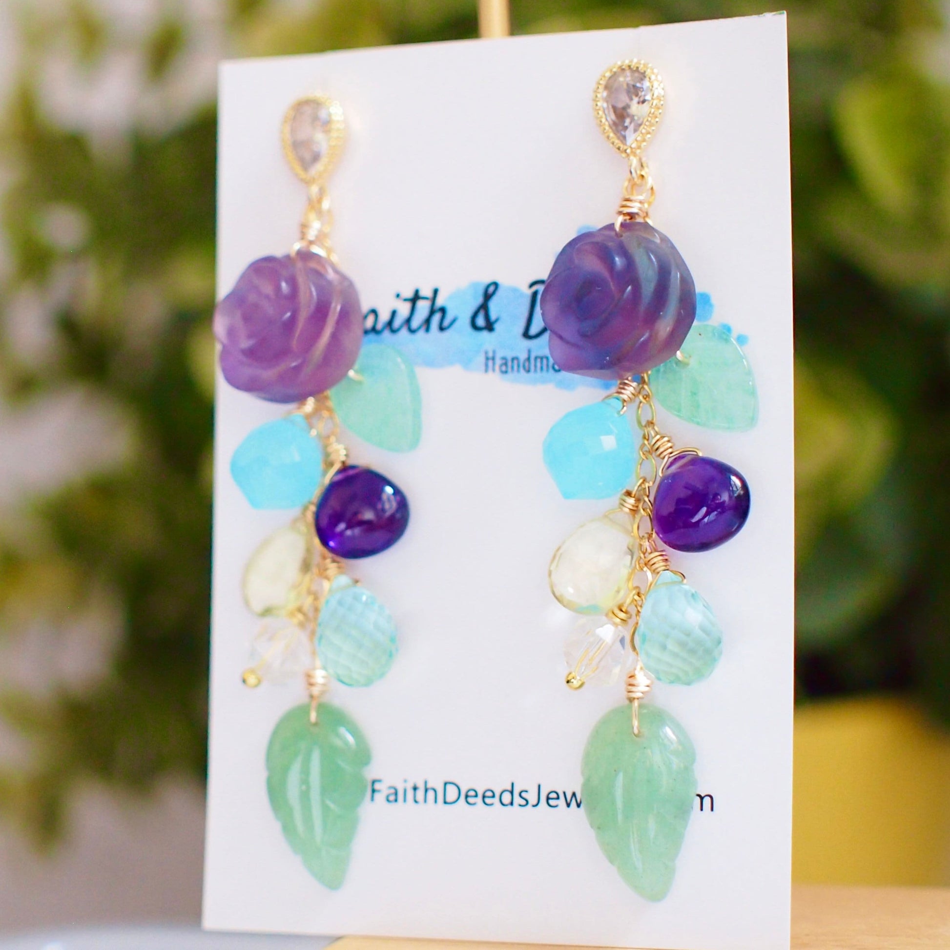 These gorgeous earrings are made with a number of beautiful gem stones, carefully and meticulously wire-wrapped and put together to create this long dangling design. I have used carved fluorite rose as the focal stones with aventurine leaves, mint green quartz, blue chalcedony, amethyst, citrine quartz and clear quartz in this design. One of a kind style that speaks style and elegance.