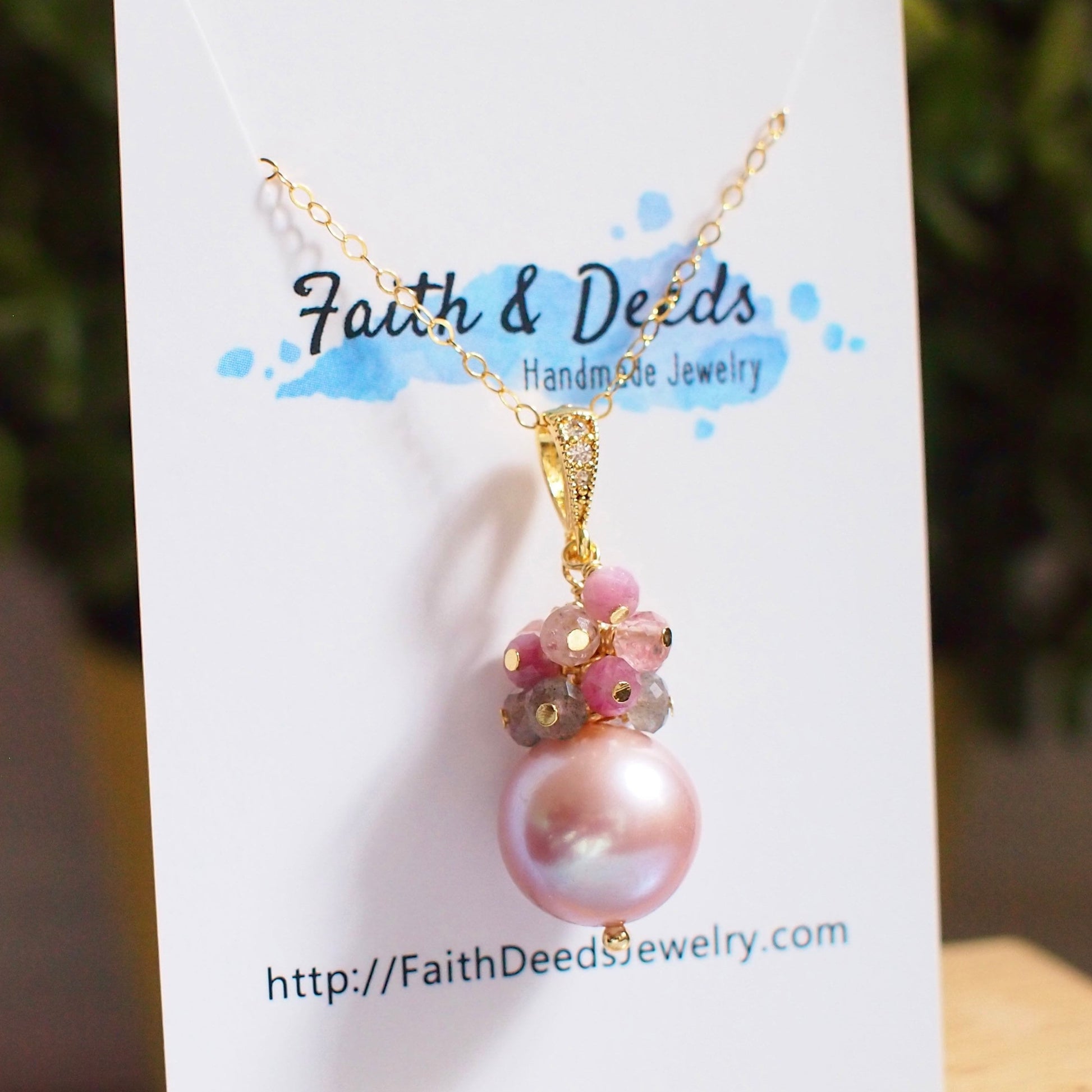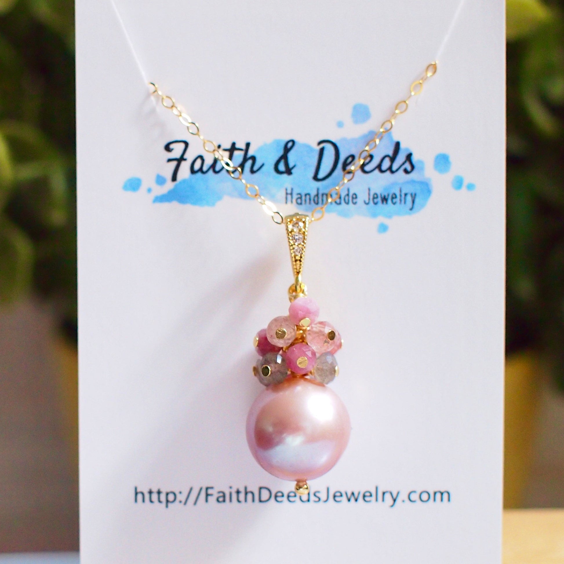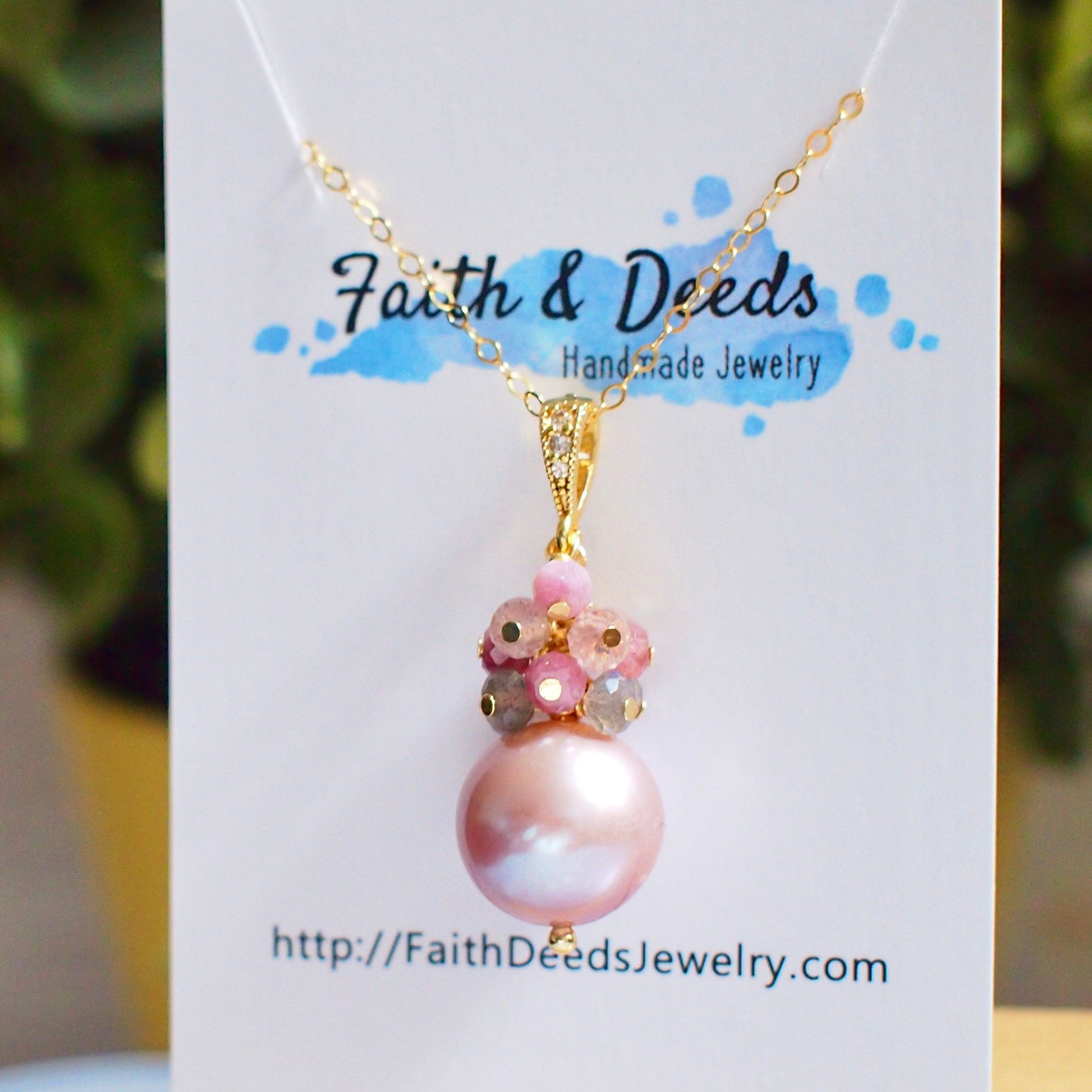 Feminine and stunning. This beautiful necklace is featuring a pinkish purple Edison pearl accented with a sparkly gem cluster of labradorite, pink tourmaline and strawberry quartz cluster. A sweet and understated design.