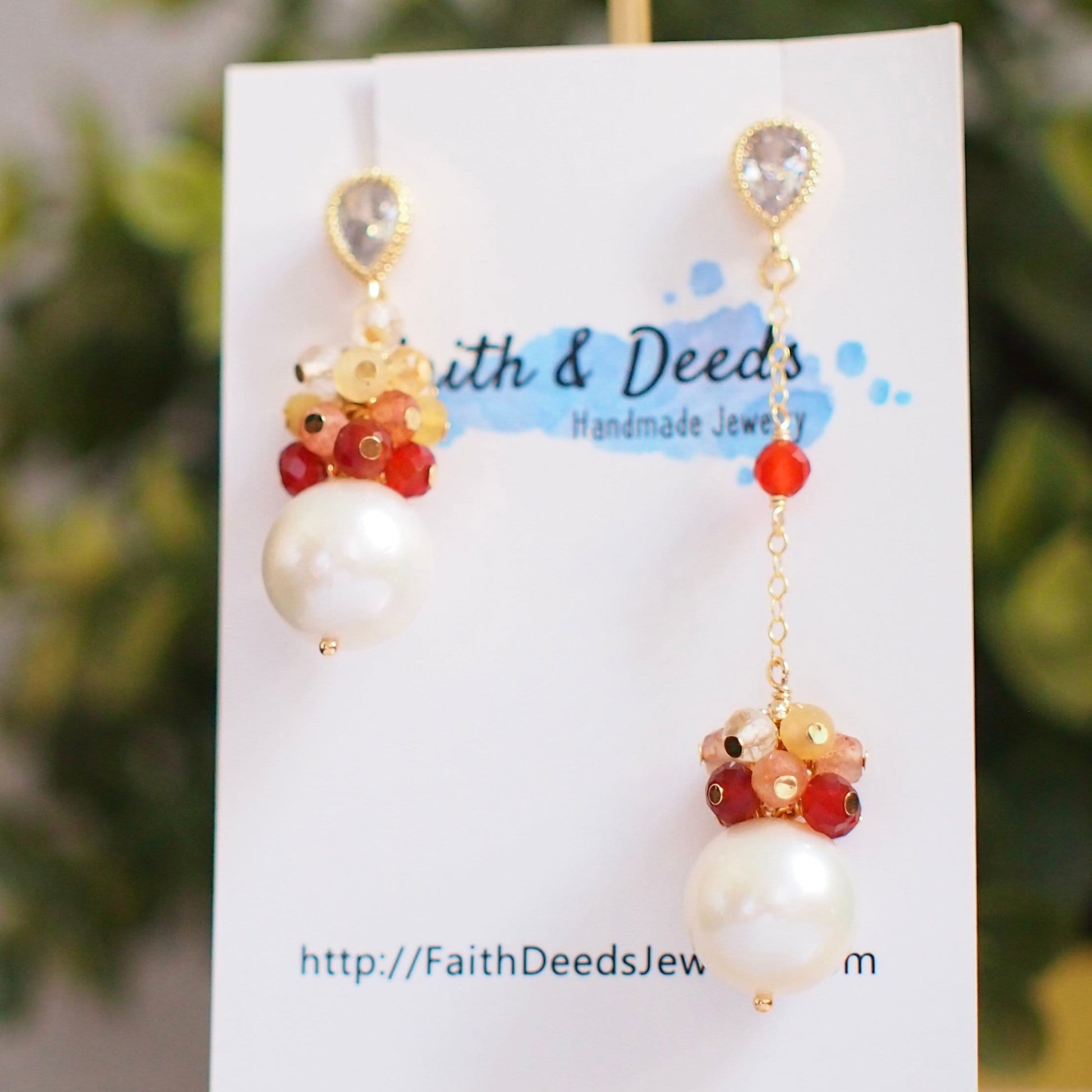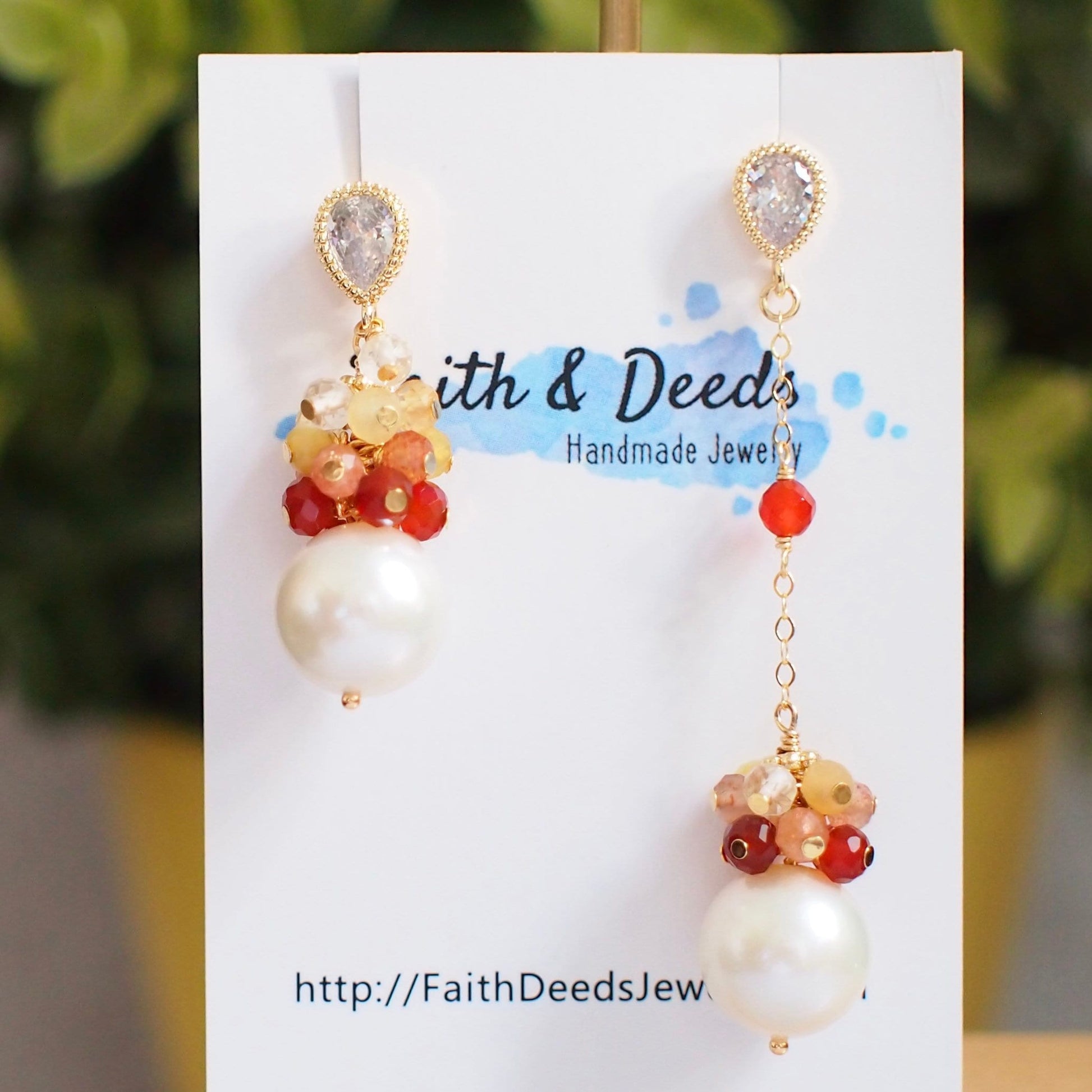 Fresh Water Pearl Earrings // Gem Cluster // Orange Agate // 14K Gold-filled // Asymmetrical // Ombré Style