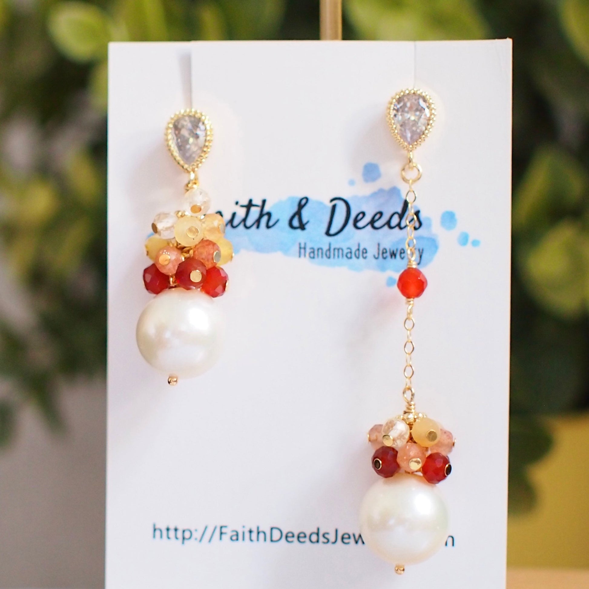 These beautiful earrings are featuring 2 round fresh water pearls in white colour with great lustre done in asymmetrical style. Accented with a sparkly gem cluster that’s made with faceted agate of different shades of orange, imitating the vibrant colour of Mexican fire opal, this is a very attractive design for everyday wear. For those who are not a fan of asymmetrical design, there are options for you to check out with a symmetrical pair, choosing between the short and long design.