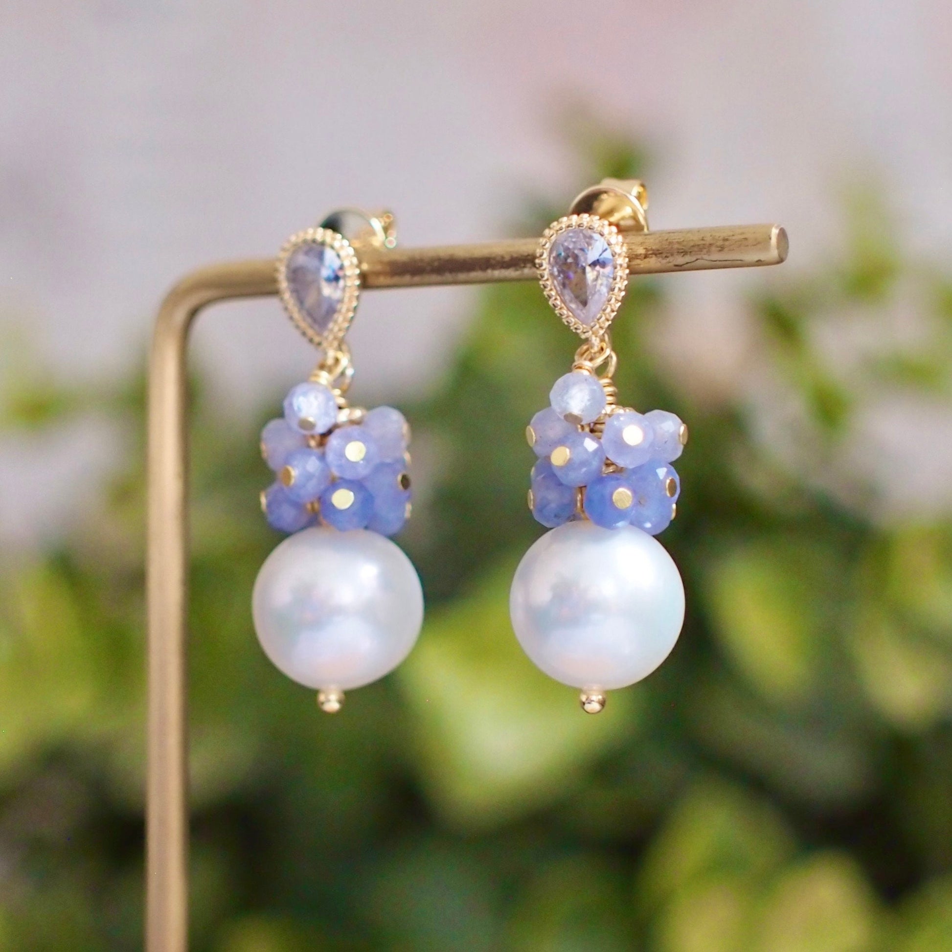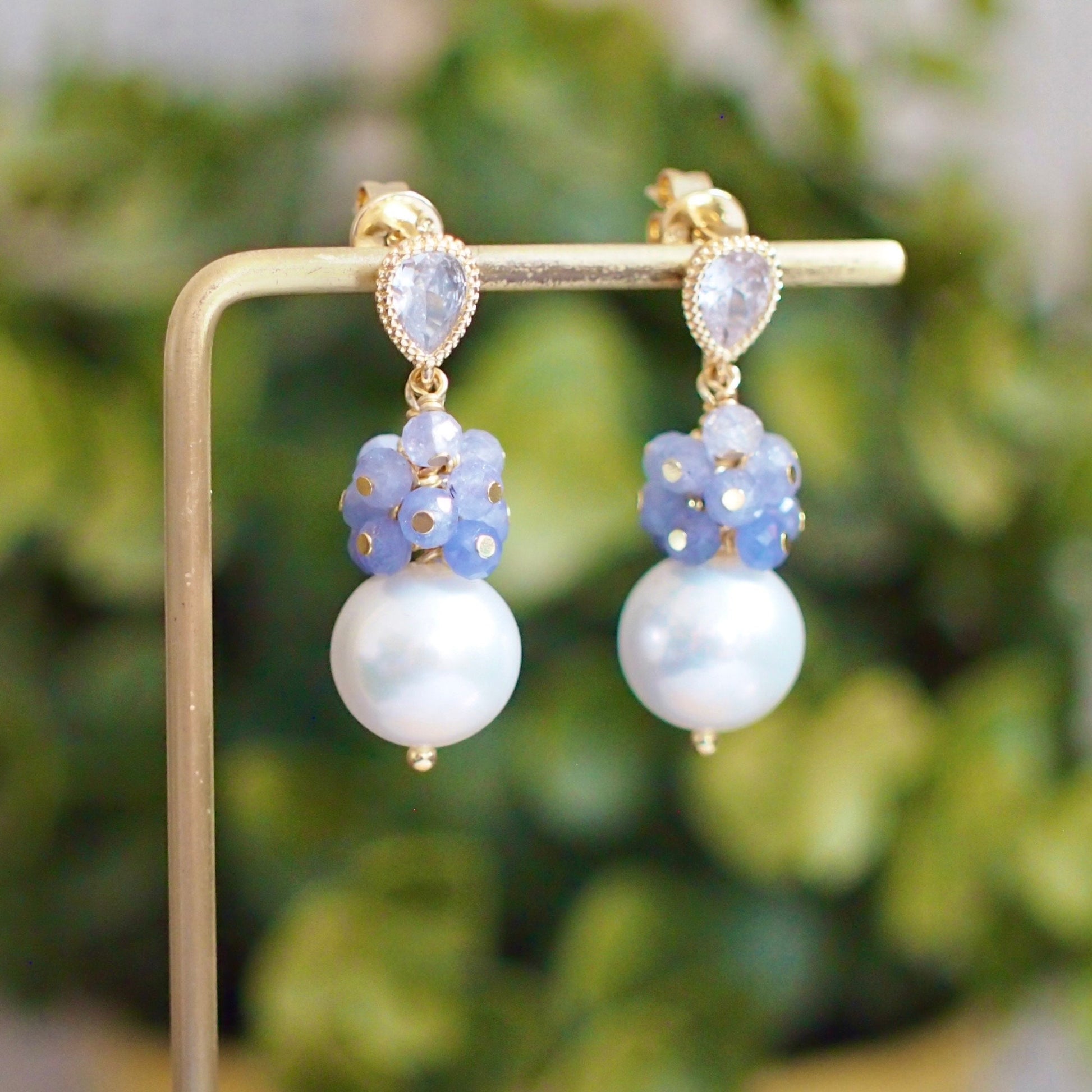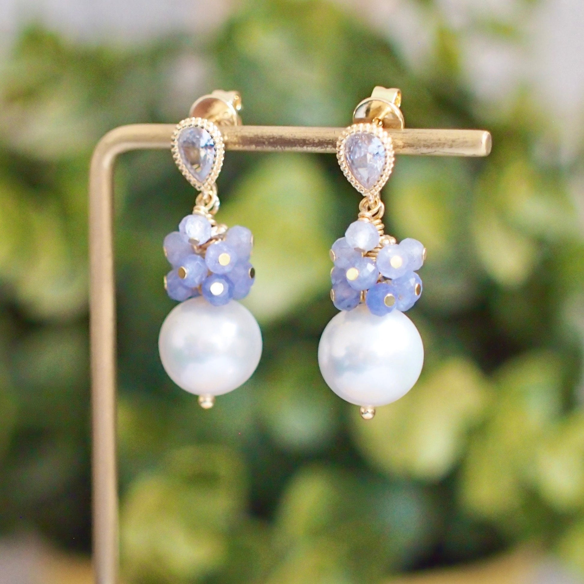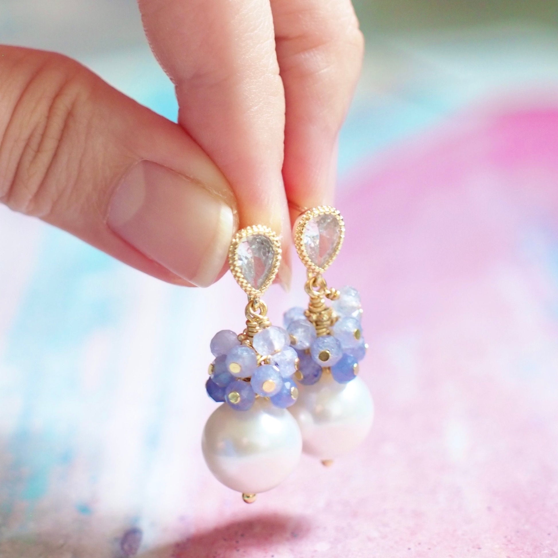 Fresh Water Pearl Earrings // Gem Cluster // Tanzanite // 14K Gold-filled