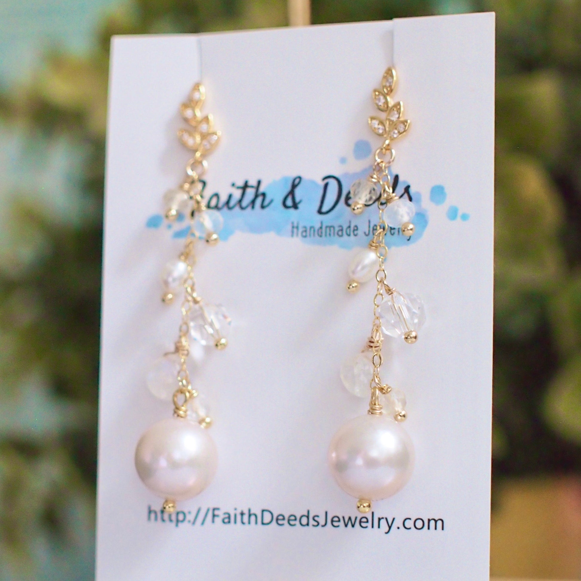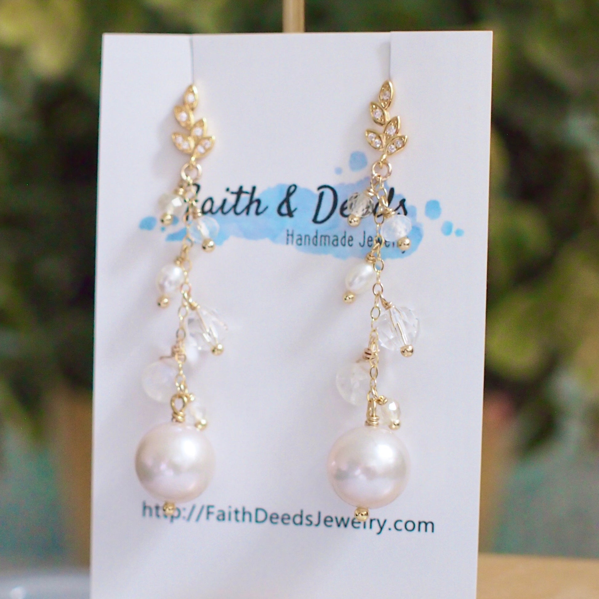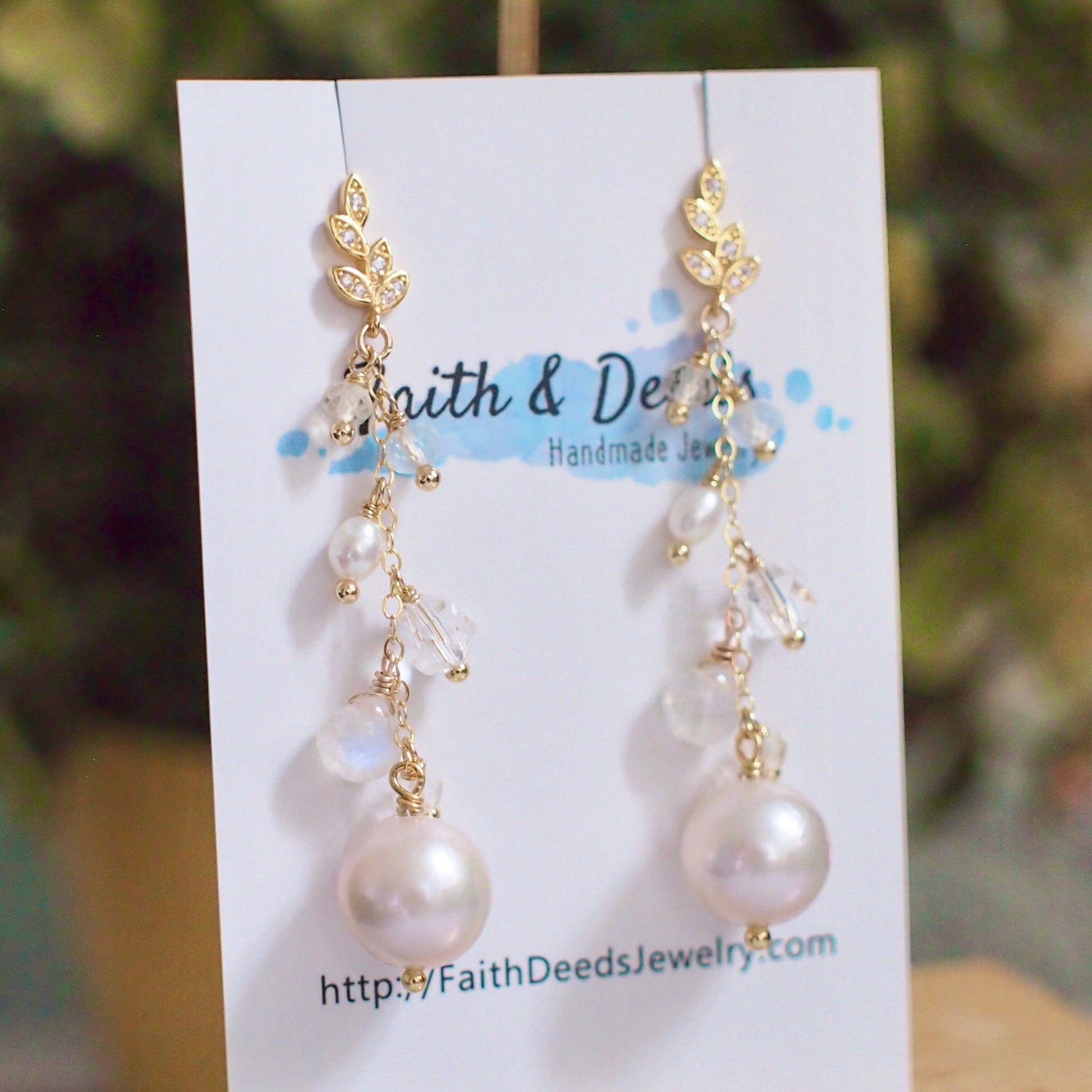 These beautiful earrings are featuring 2 round fresh water pearls in white colour with great lustre, hanging on gold-filled chain dressed with cascading sparkly gems such as moonstones, citrine quartz, clear quartz and pearls. A graceful and elegant design that will bright so much light to your look.