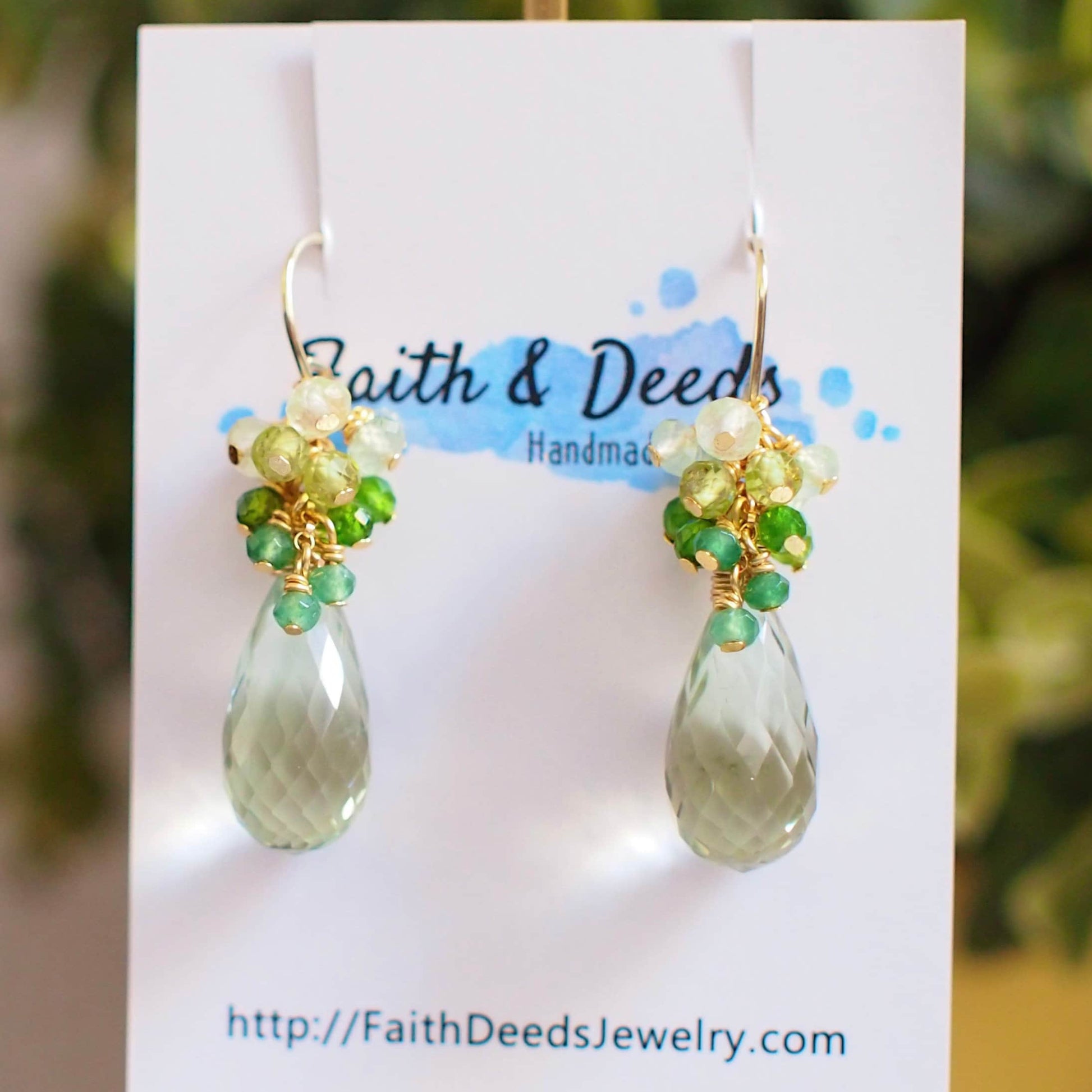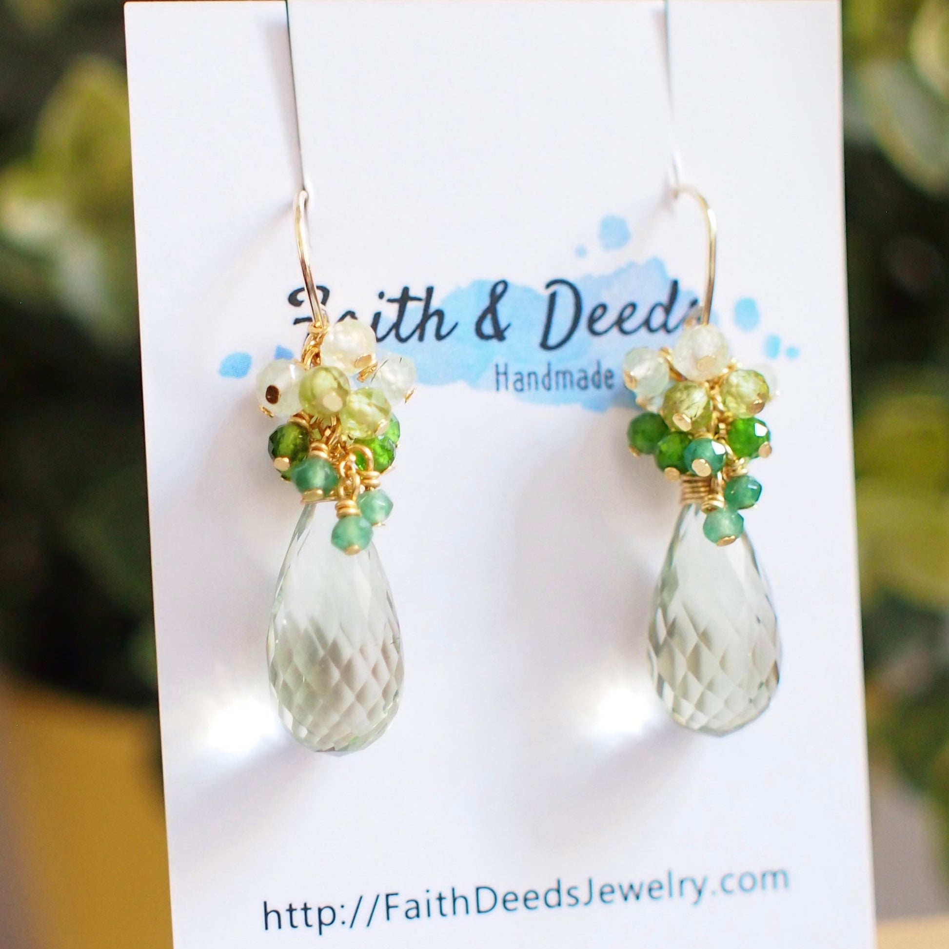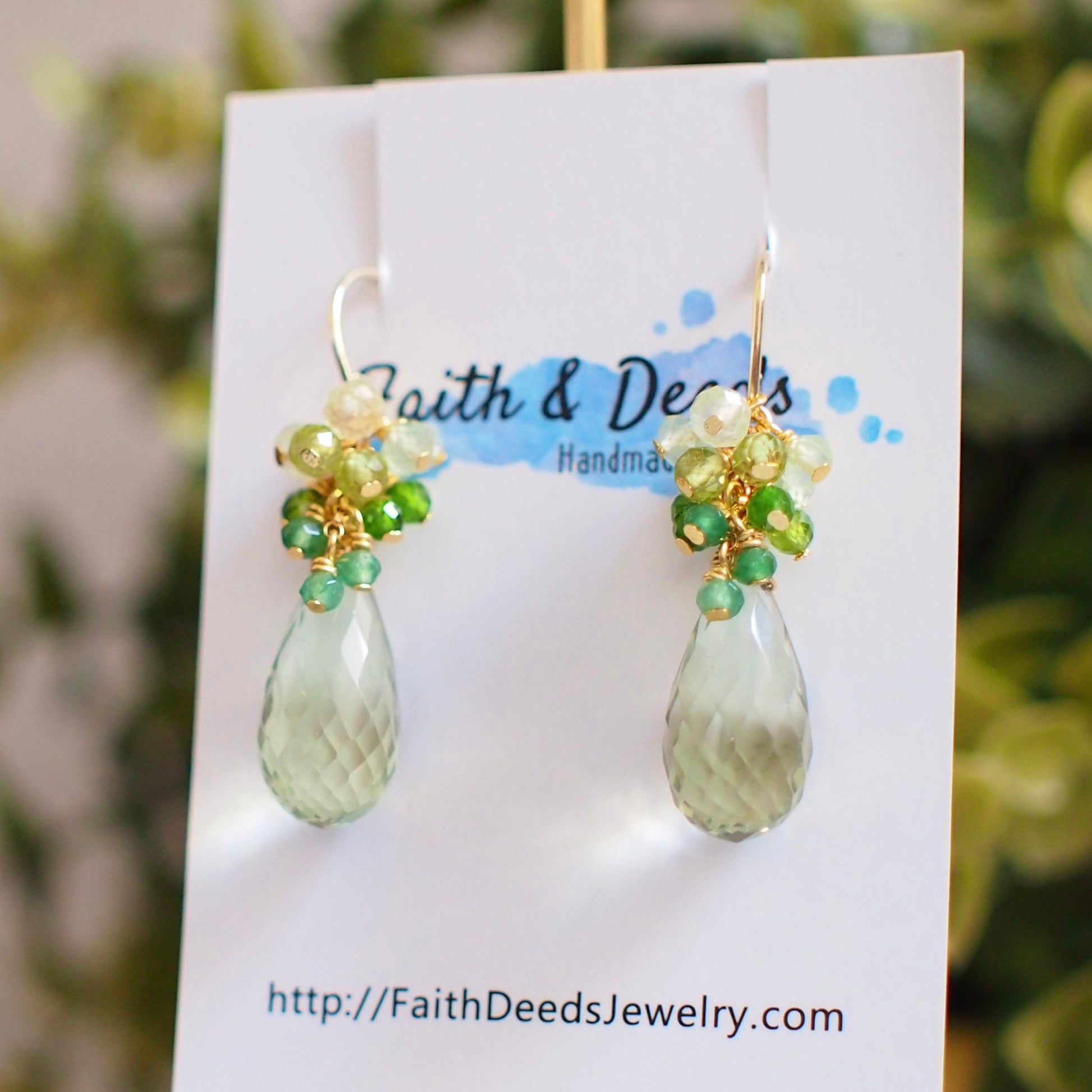 These beautiful earrings are featuring 2 faceted green amethyst accented with a sparkly gem cluster that’s made with green chalcedony, apatite, peridot and prehnite, this is a lovely and refreshing design for everyday wear.