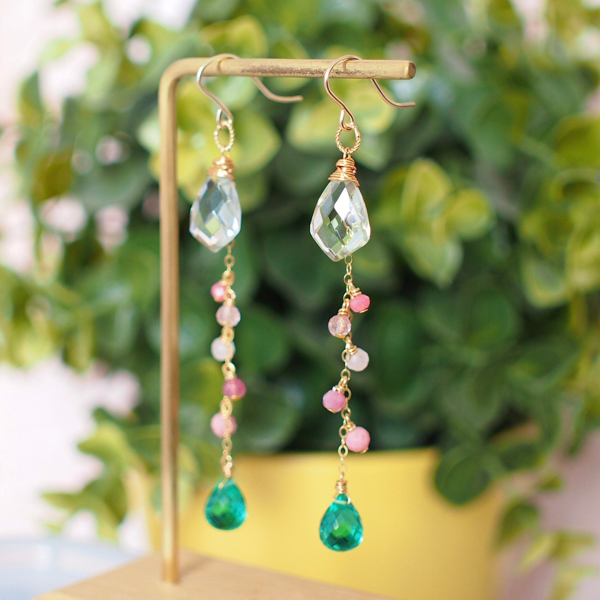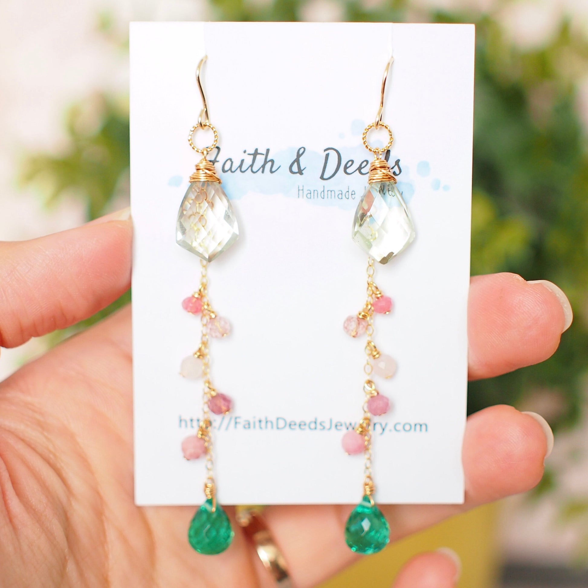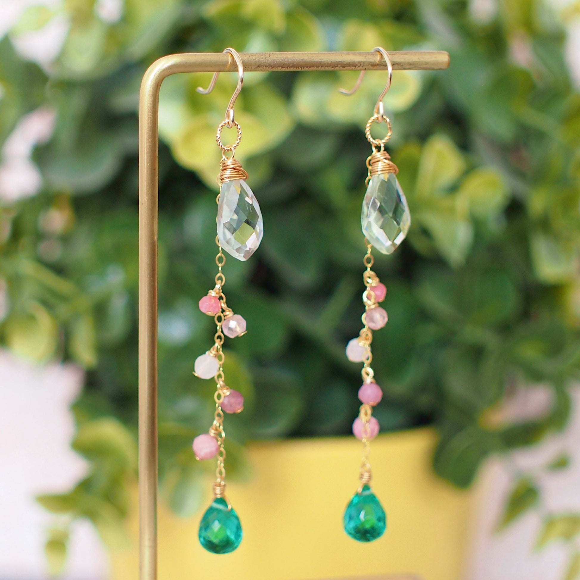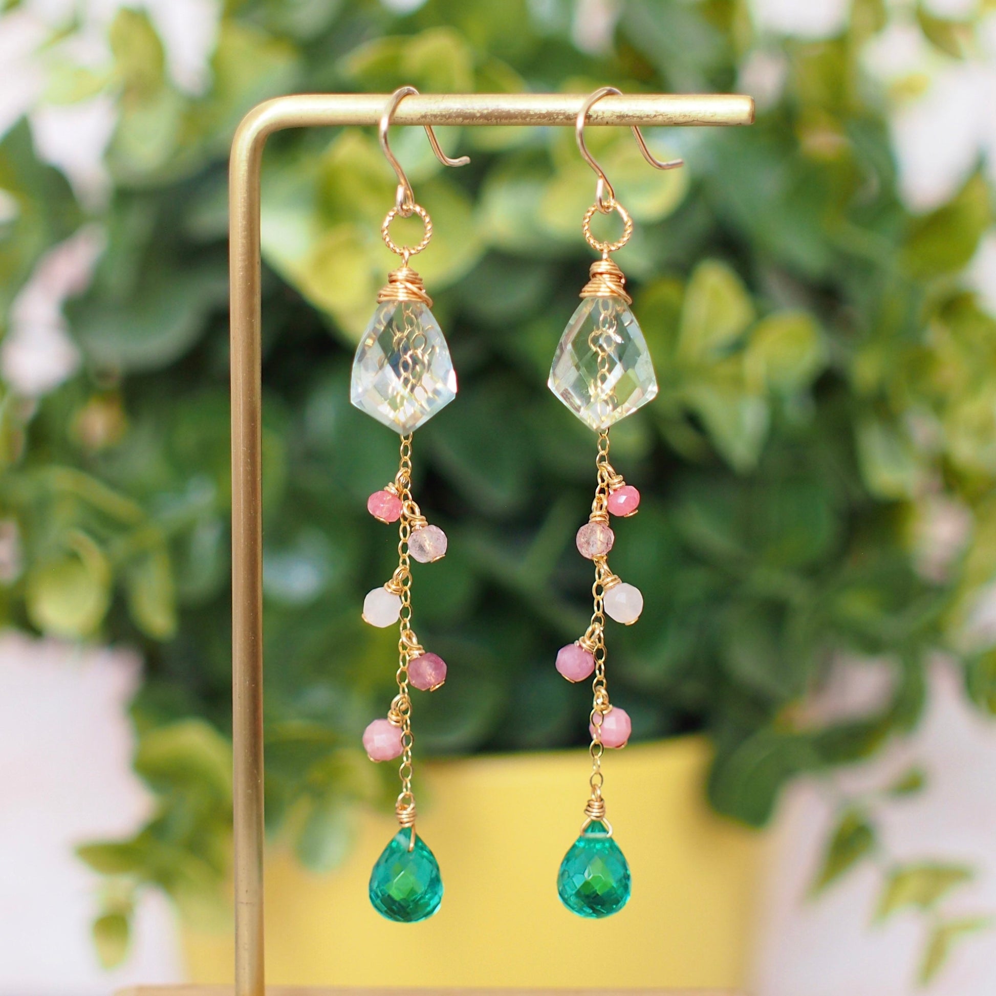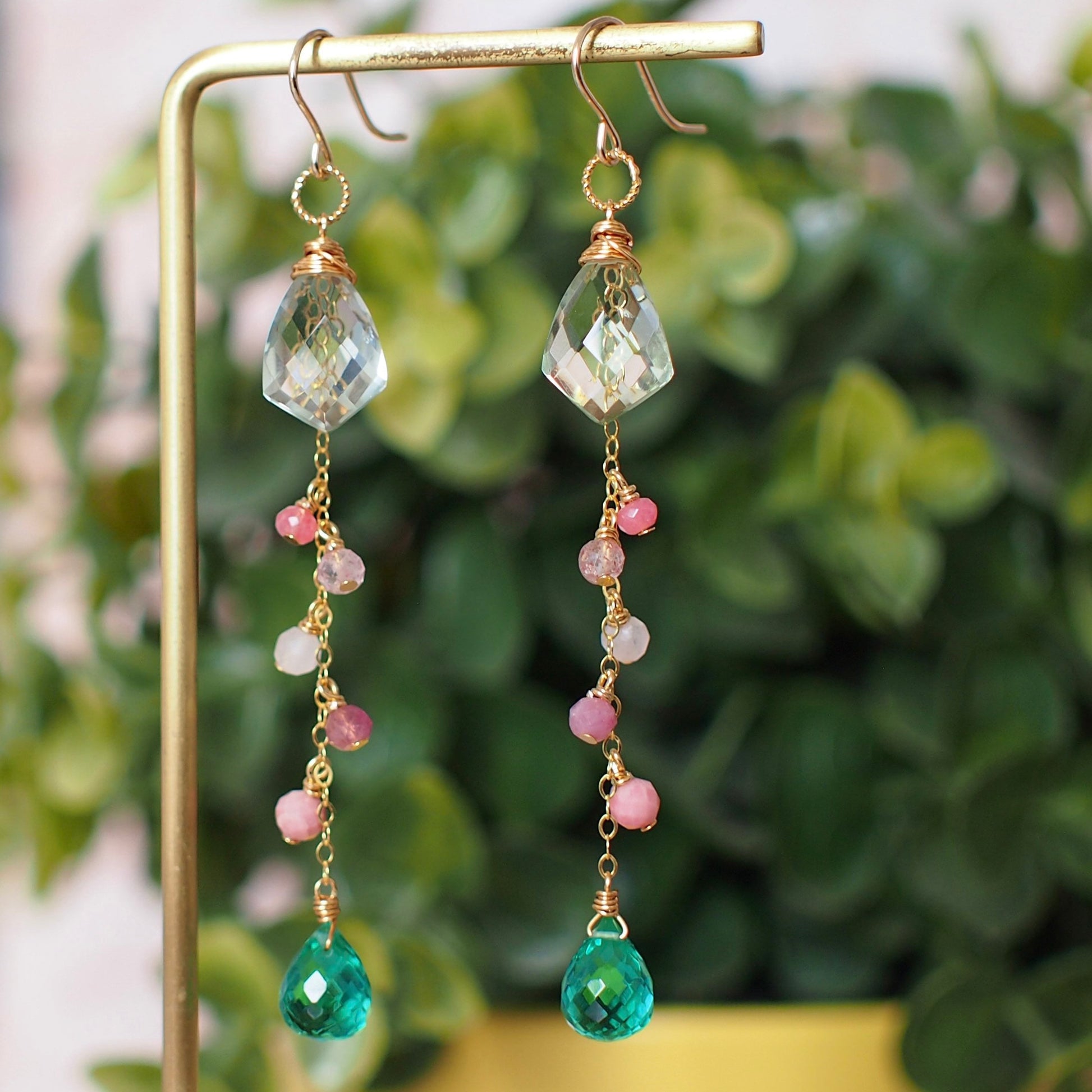 These beautiful earrings feature 2 faceted green amethyst in shield-cut, carefully wrapped in gold-plated wire, dangling down a twisted gold ring alongside a chain of lovely, dainty gems - chalcedony, strawberry quartz, rose quartz, pink tourmaline, rhodochrosite and emerald green quartz briolettes. Refreshing and striking at the same time.