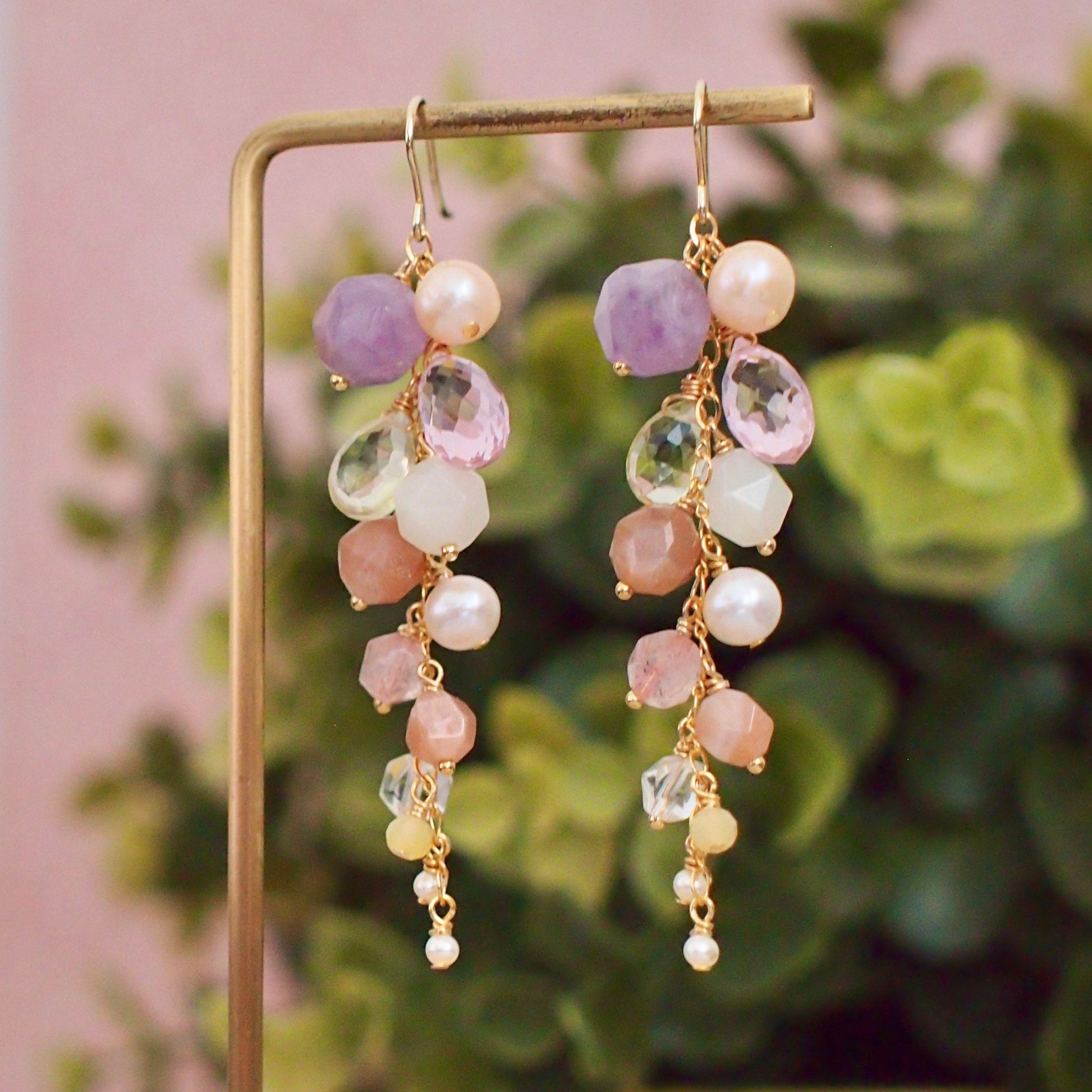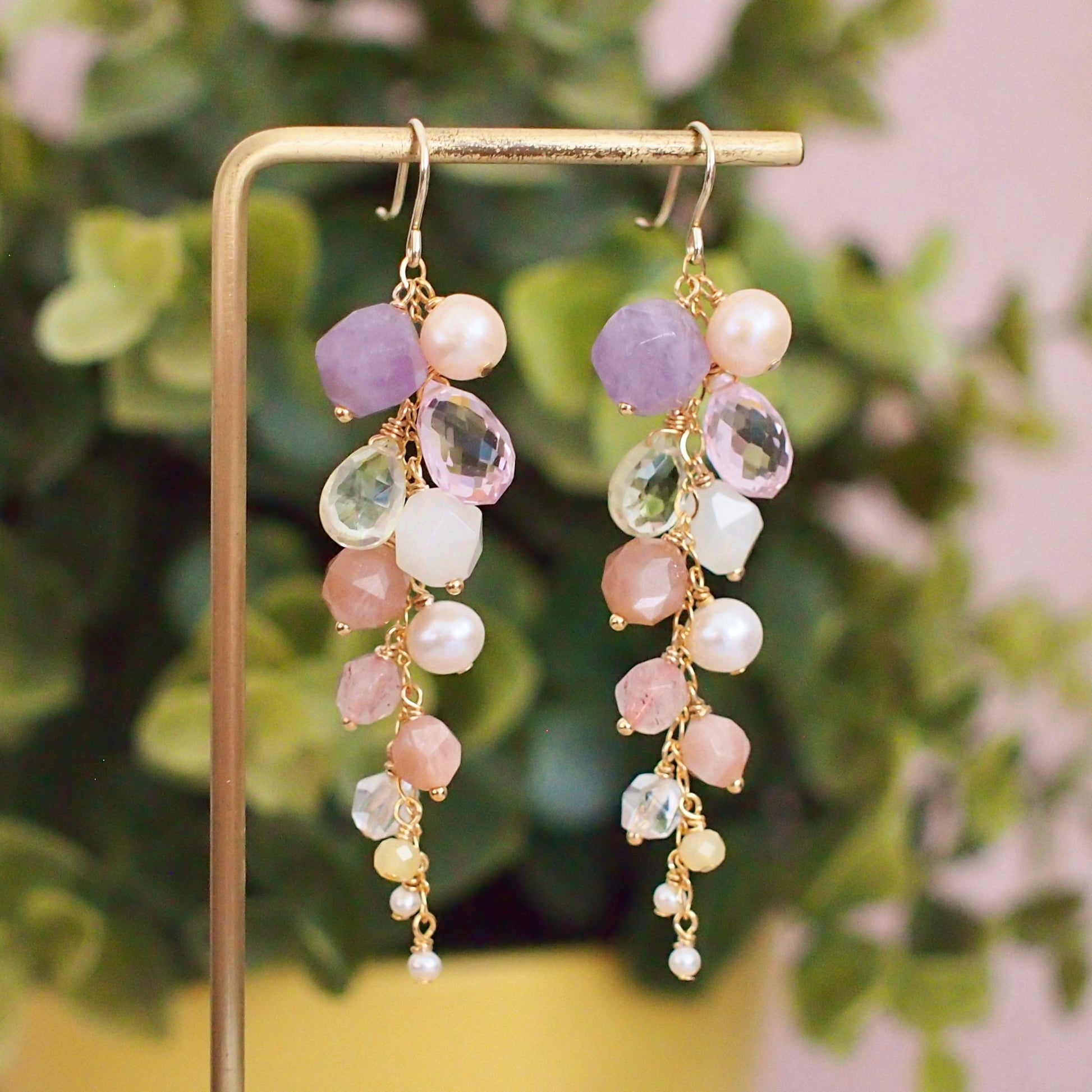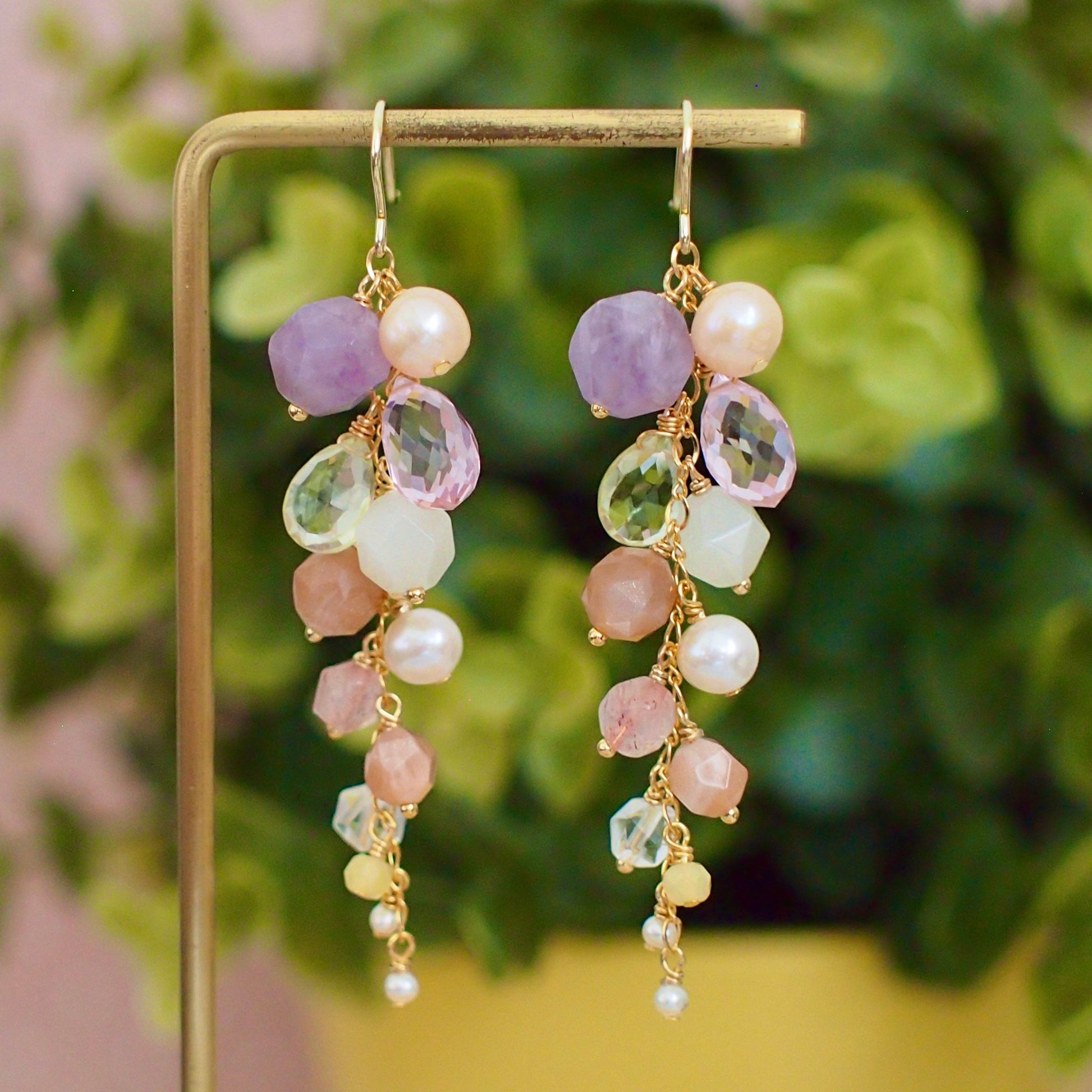 Multi Stones Dangle Earrings // Lilac Floral Theme // Dangling Style // Gems Cluster // Sparkly & Precious // 14K Gold-filled