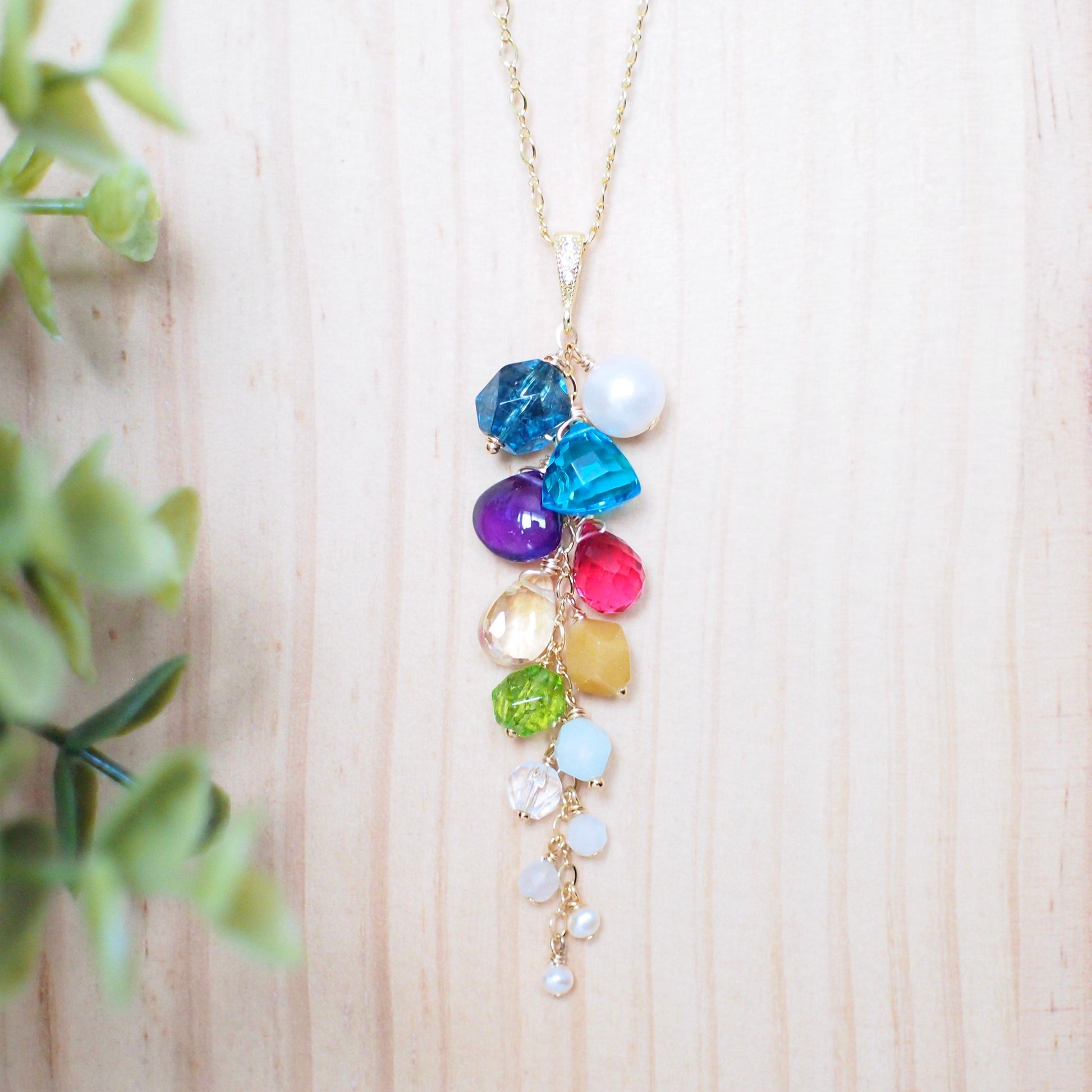Multi Stones Long Dangling Pendant // Statement Necklace // Colourful & Chic // 14K Gold-filled