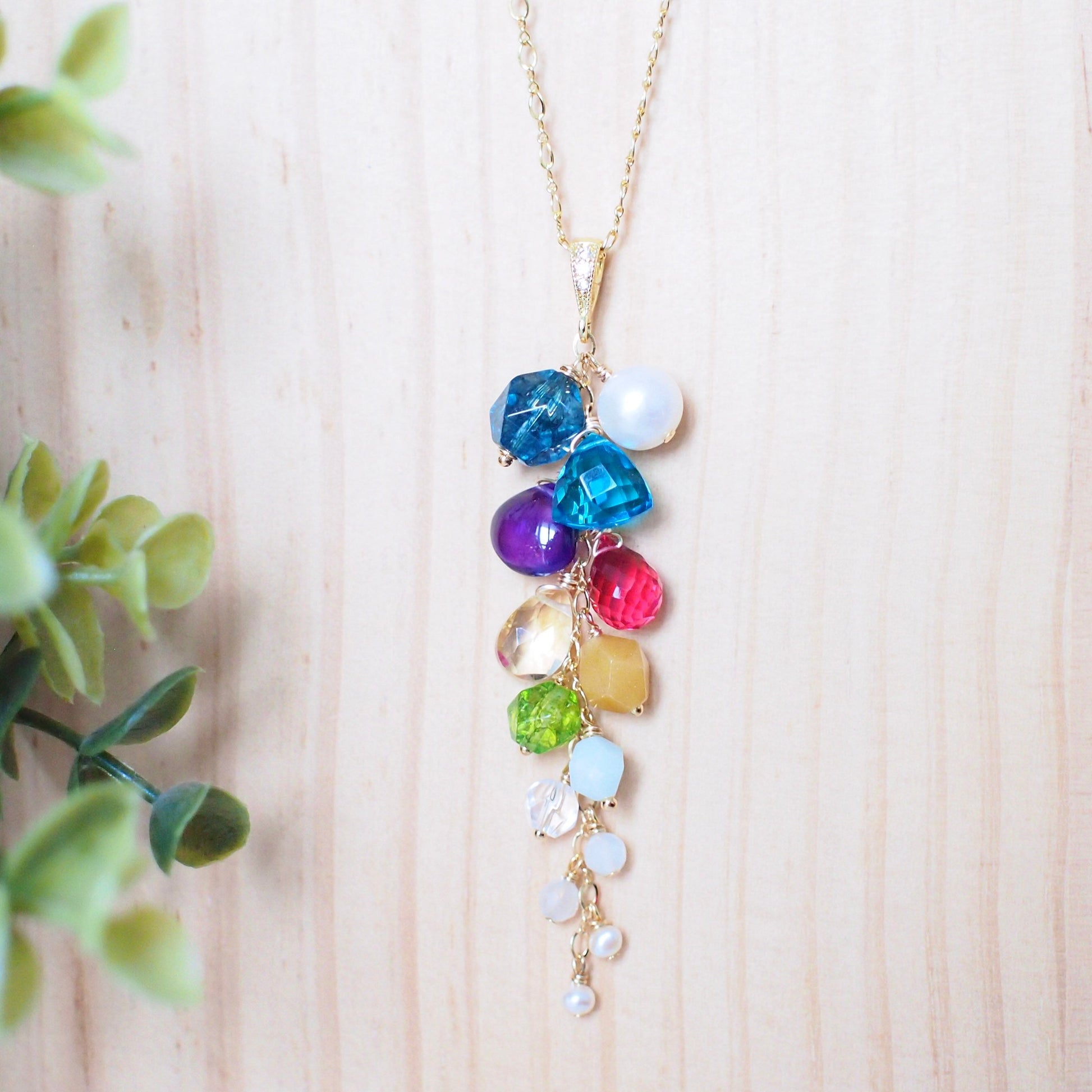 Fun and stylish. This beautiful statement necklace is featuring a long dangling pendant that’s made of a number of sparkly gems cascading gracefully down - these are different shades of quartz, amethyst, pearls, peridot, chalcedony, amazonite and moonstones. Striking and chic.