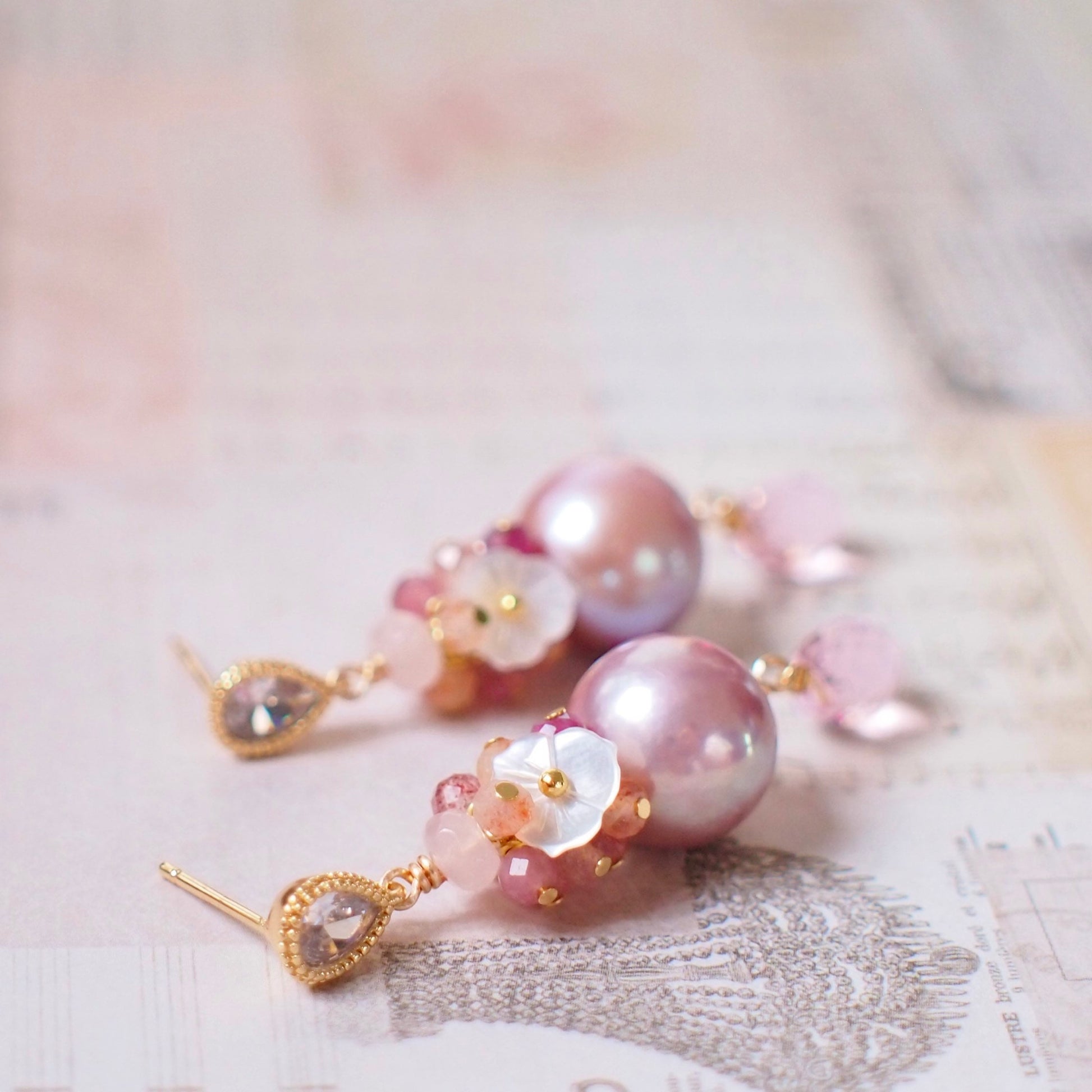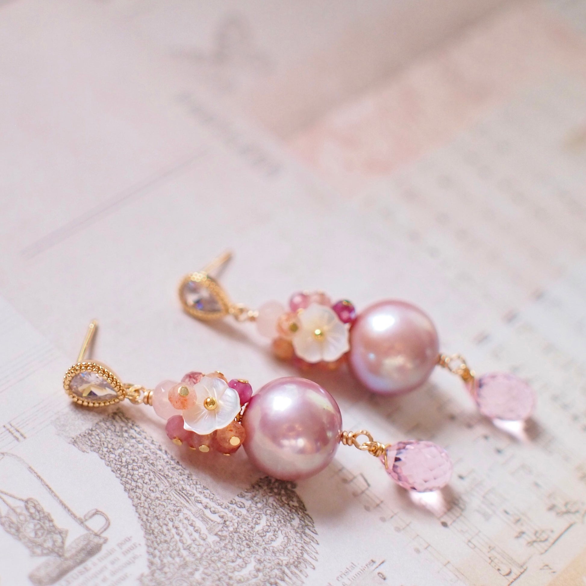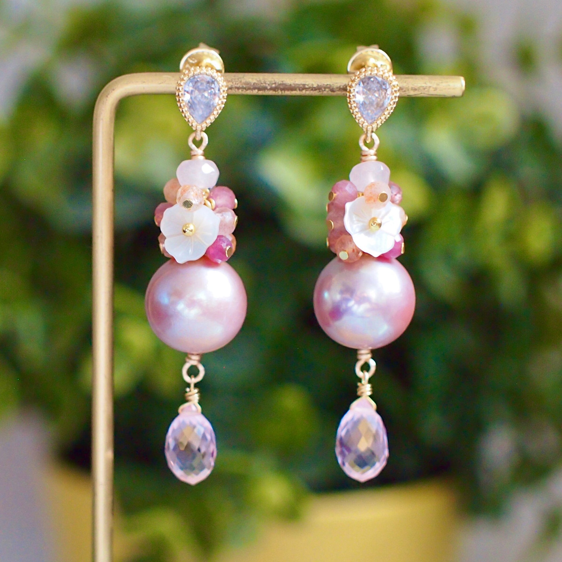 These beautiful earrings are featuring 2 round Edison pearls in gorgeous pinkish purple colour with exceptional lustre. Accented with a sparkly gem cluster that’s made with faceted pink tourmaline, sunstones, strawberry quartz, rose quartz, mother-of-pearl flowers and dangling pink quartz briolettes hanging below the shiny pearls, this is an incredibly lovely design for everyday wear.