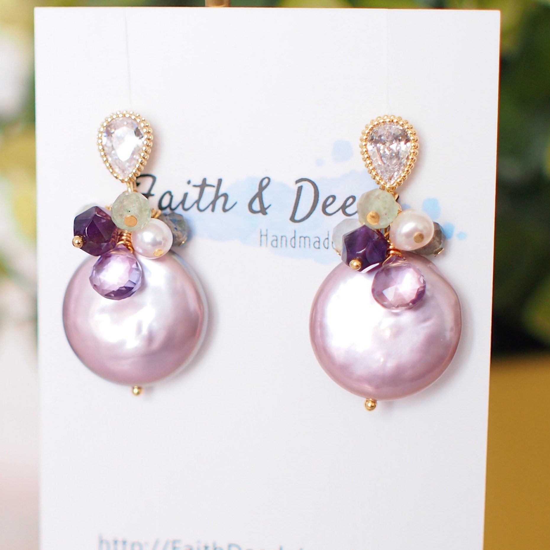 Rare and gorgeous! These beautiful earrings are featuring 2 round purple coin pearls with amazing lustre, dressed with amethyst, pearls, labradorite, moonstones and green strawberry quartz. This romantic and stunning design is dedicated to purple lovers.