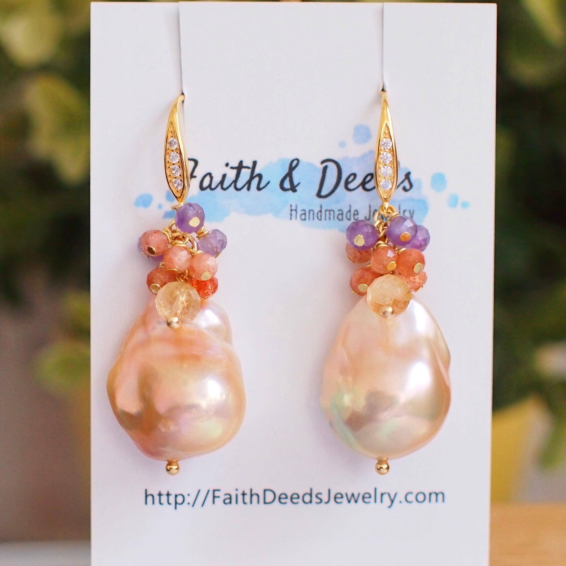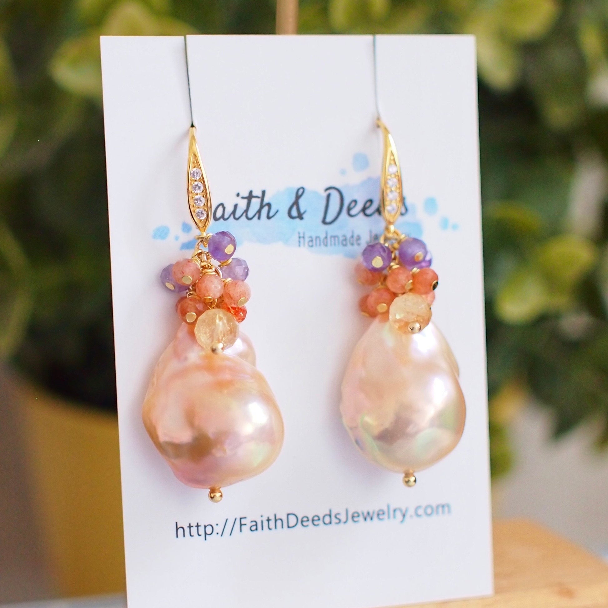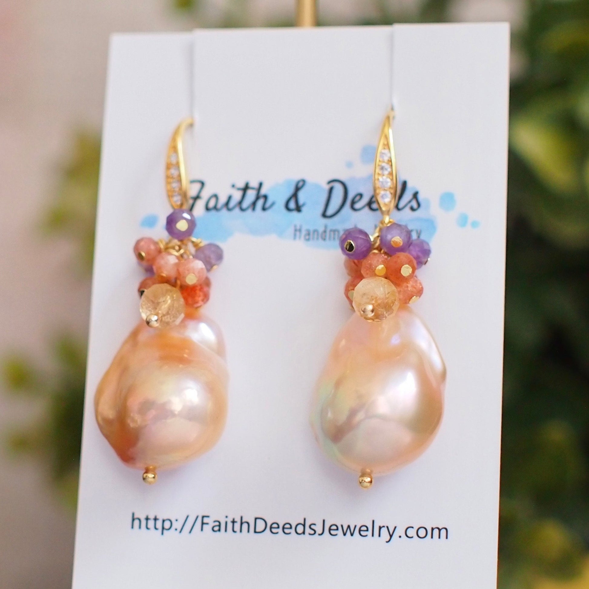 Rainbow Baroque Pearl Earrings // Gems Cluster // Flameball Pearls // Citrine Quartz x Sunstone x Amethyst // 14K Gold-filled // Vibrant
