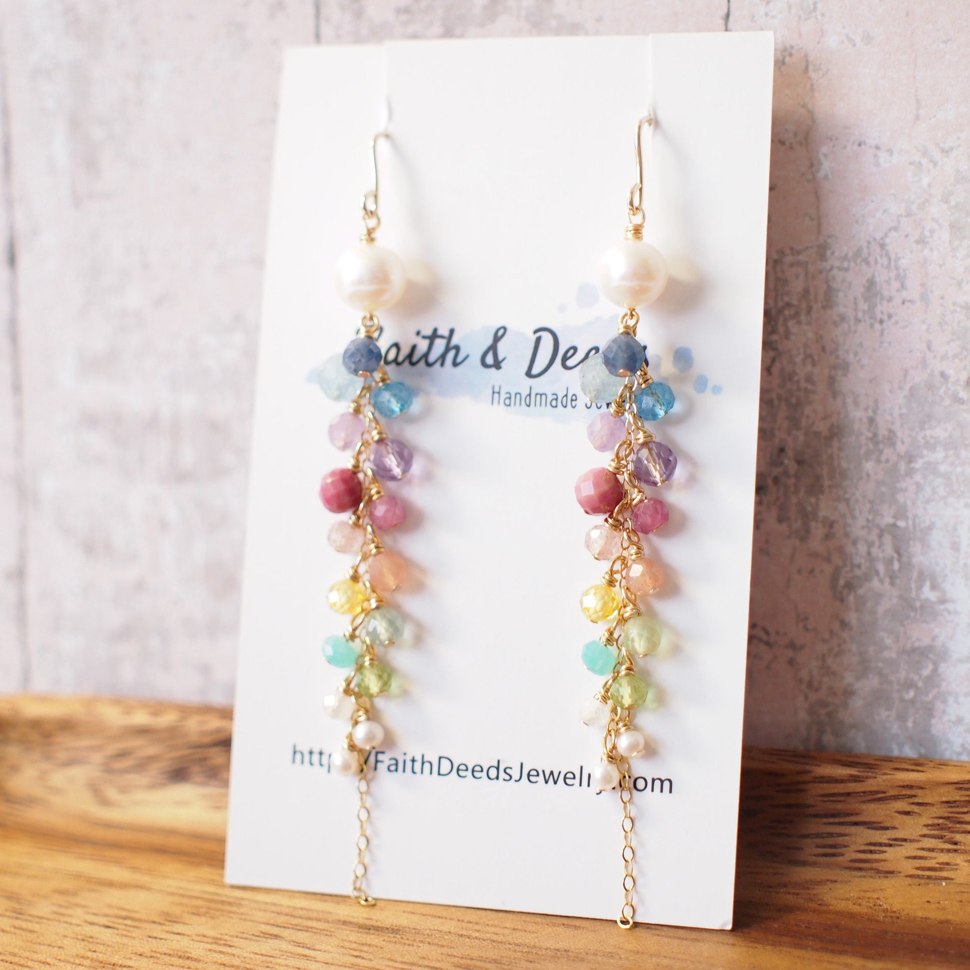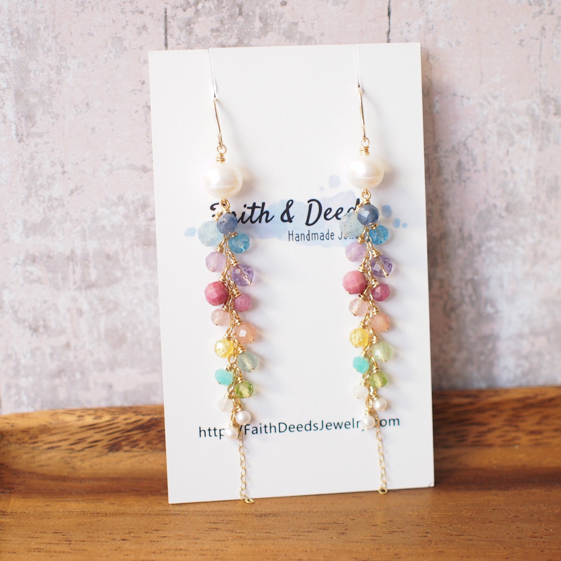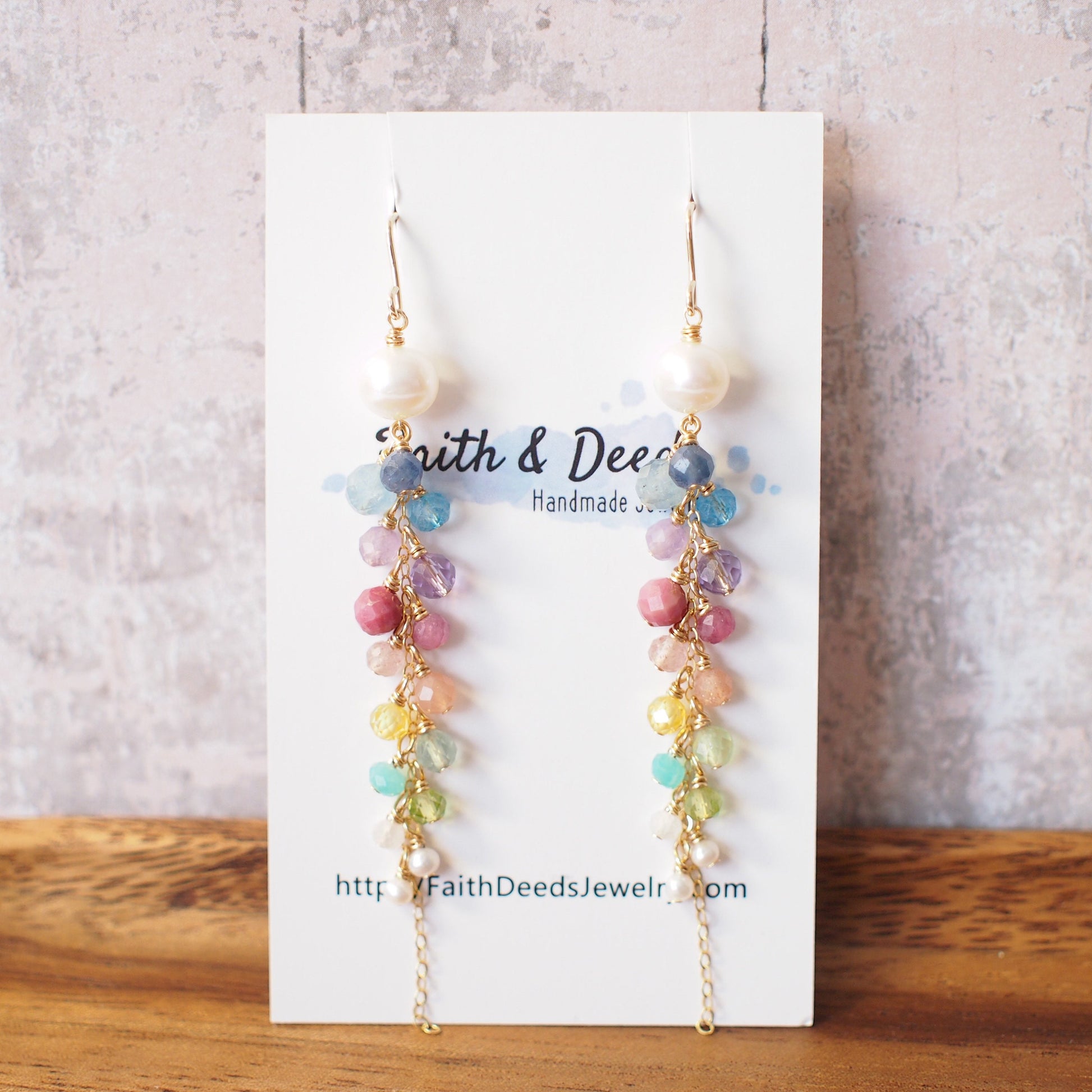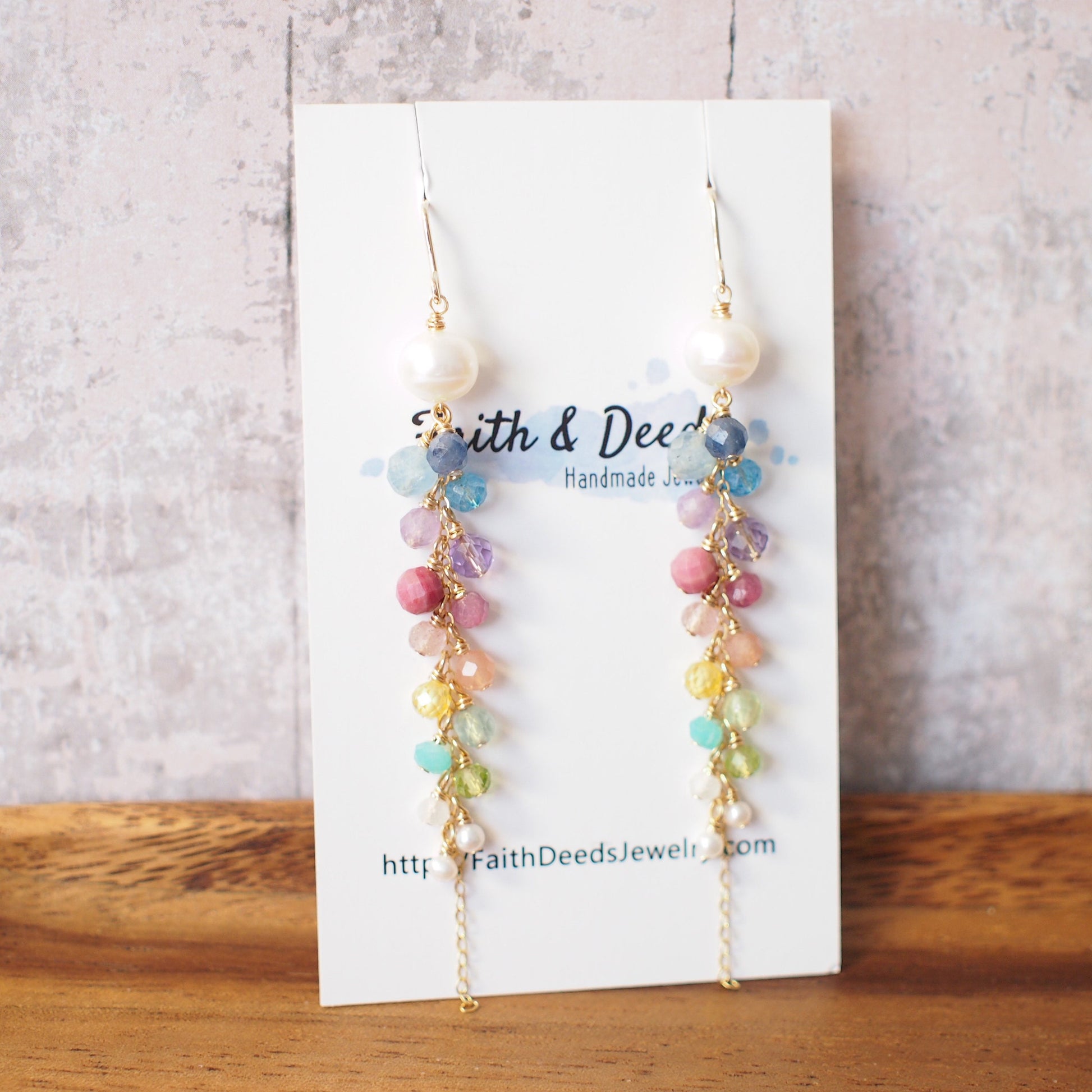 Rainbow Gems x Pearls Dangling Earrings // Sparkly & Precious // 14K Gold-filled // Feminine and Unique