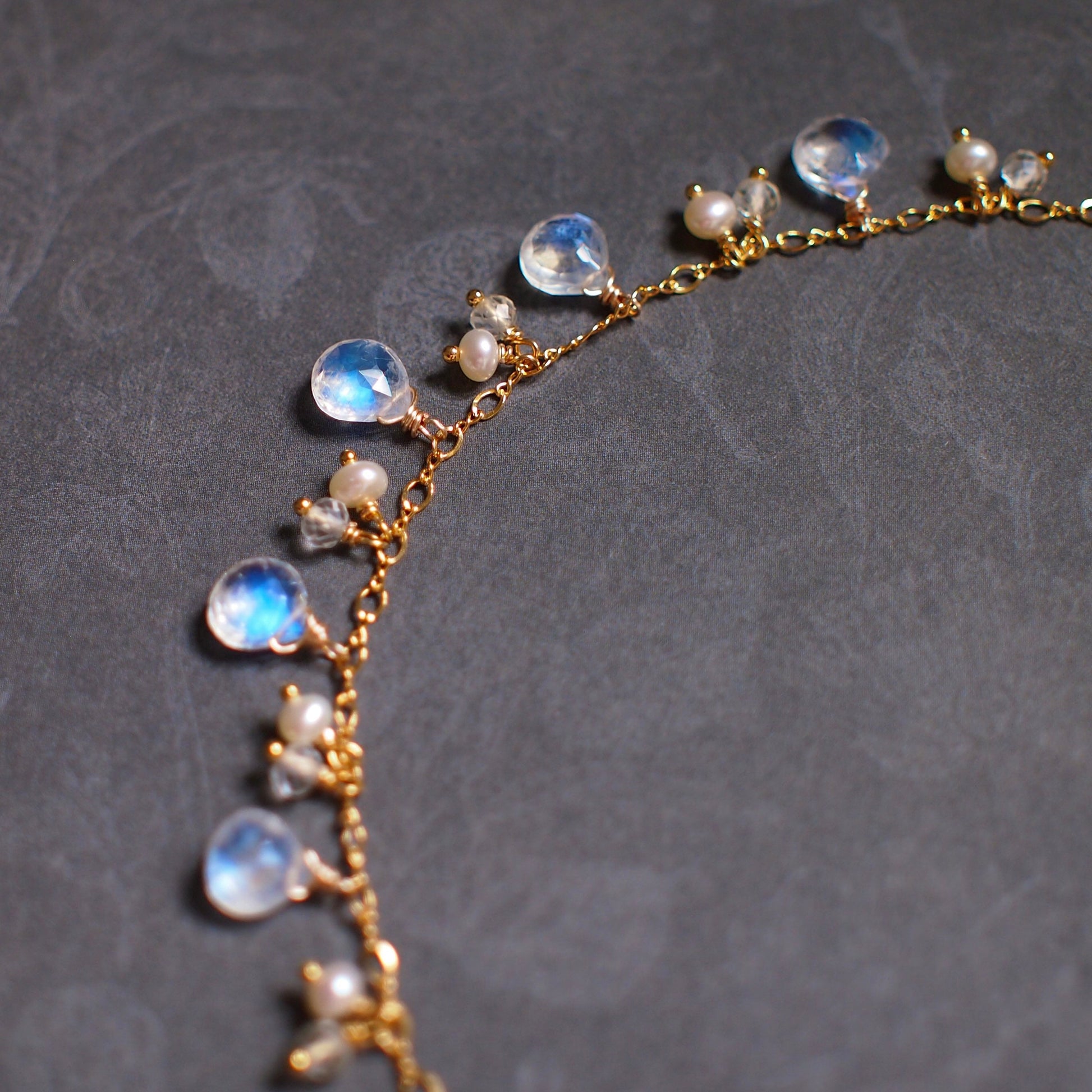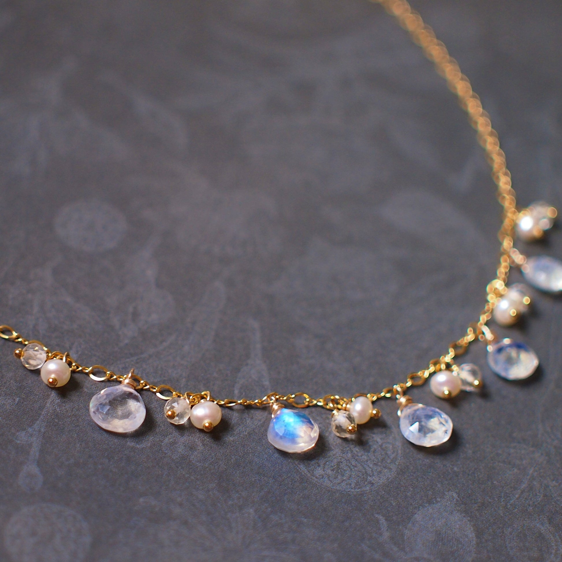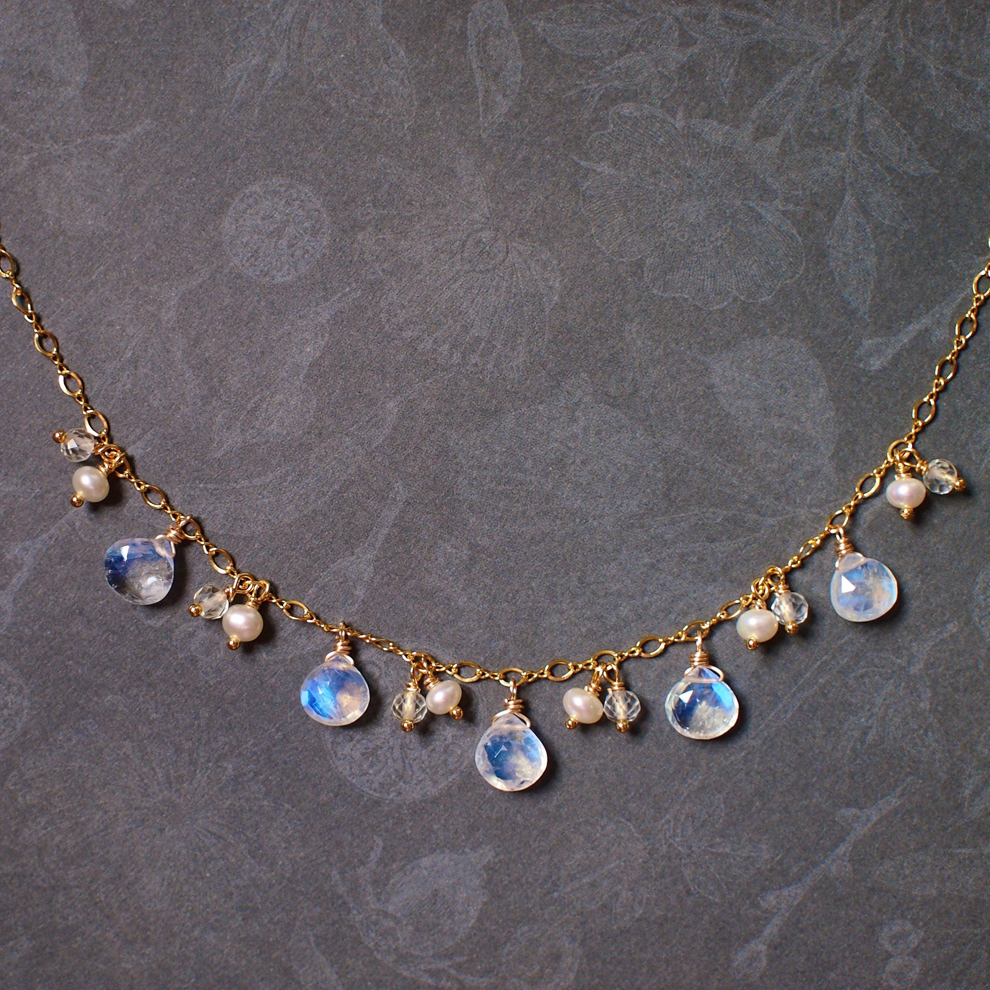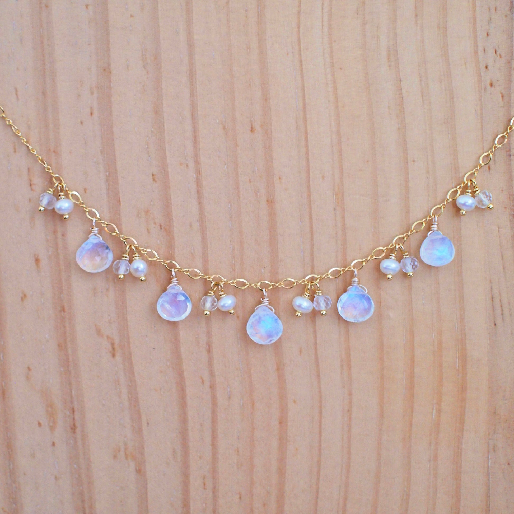 This beautiful necklace is featuring 5 rainbow moonstone briolettes with strong blue flash in them, accompanied by dainty fresh water pearls and citrine quartz. A lovely and understated design for everyday wear.