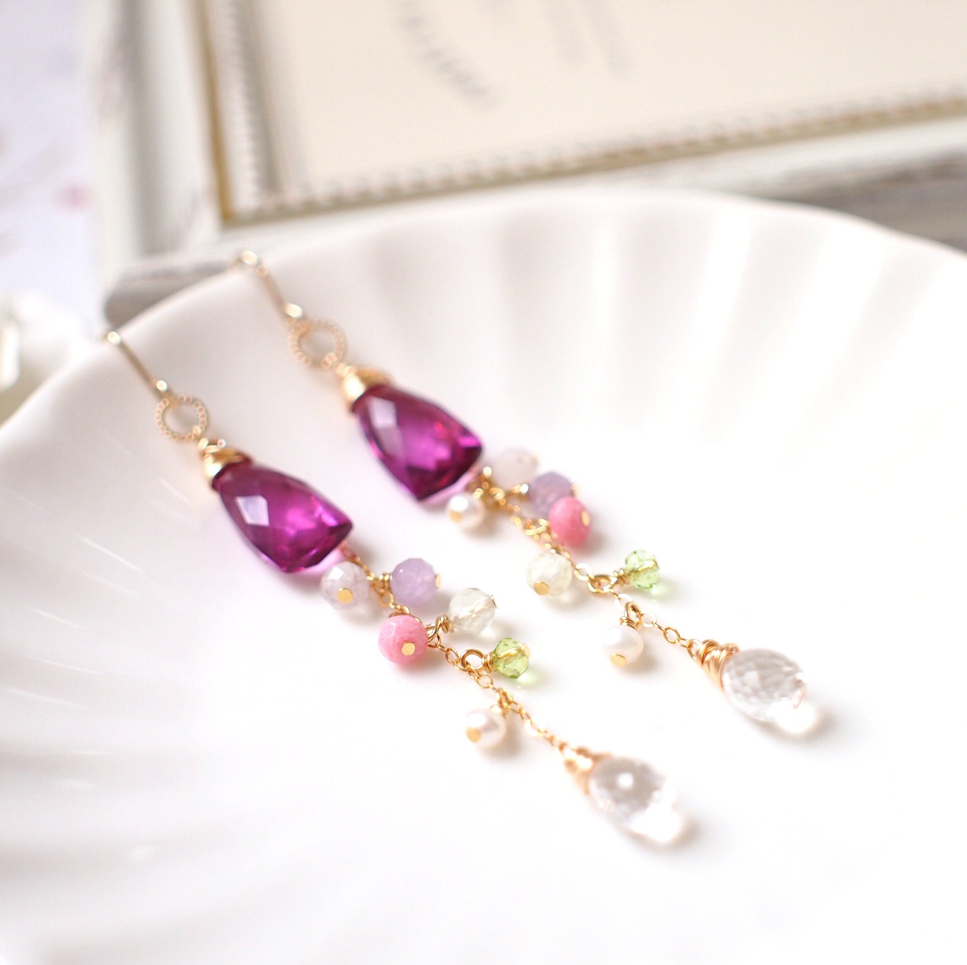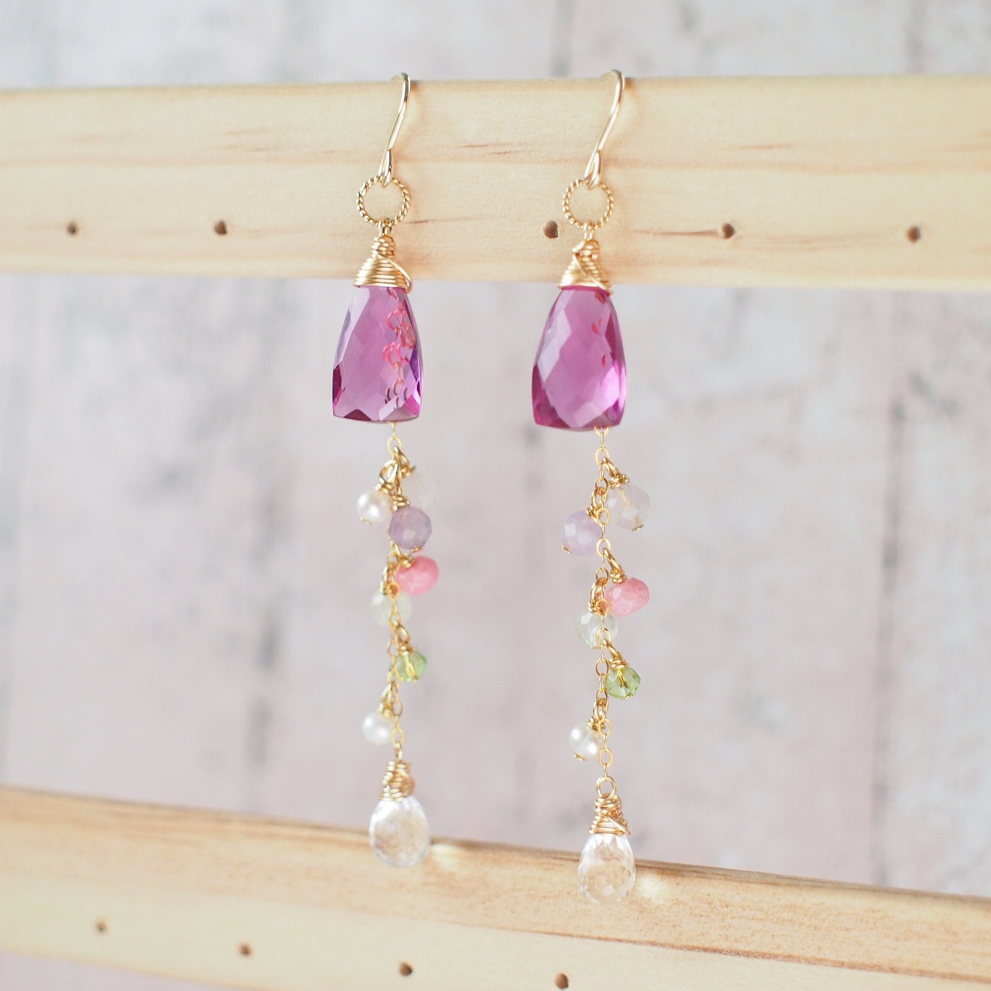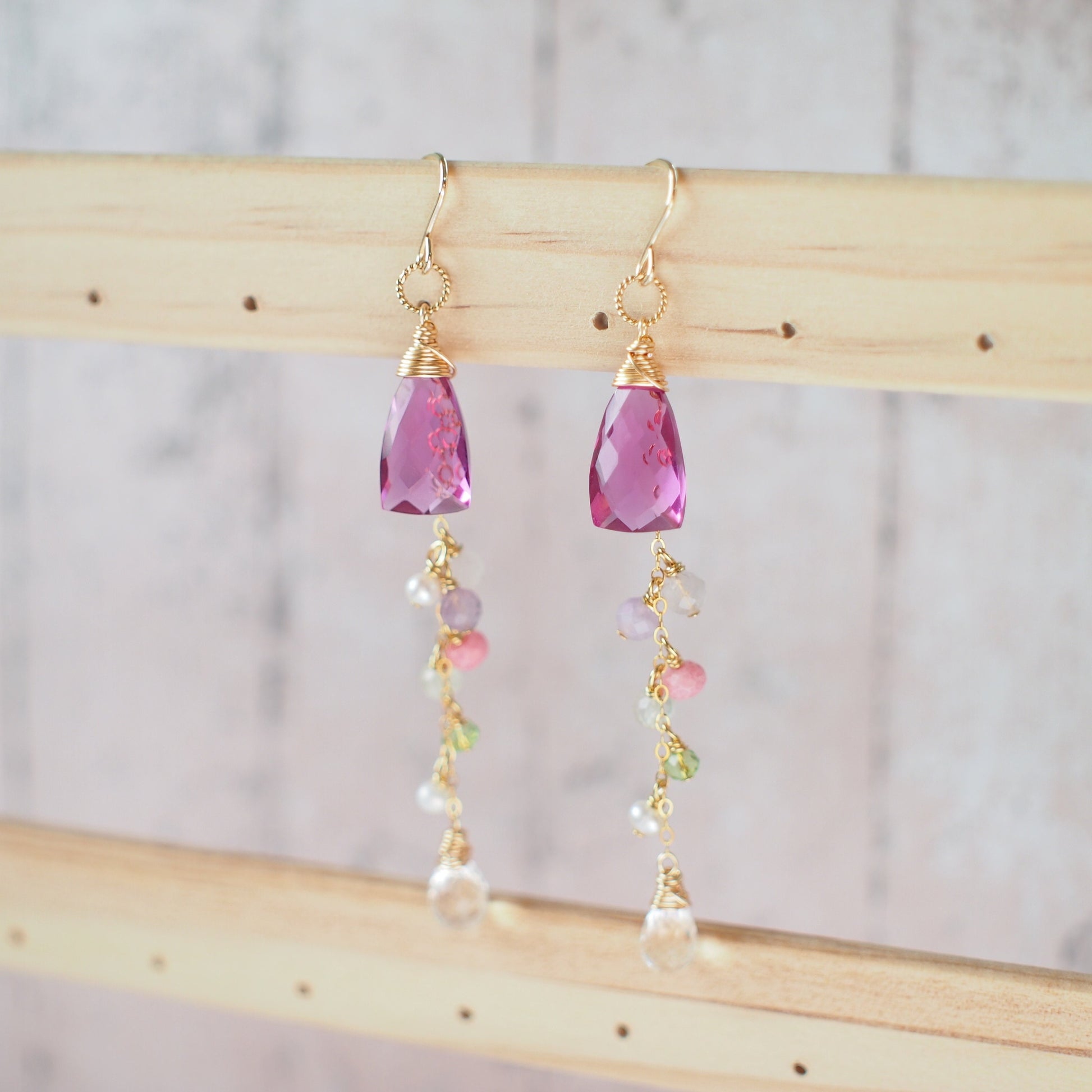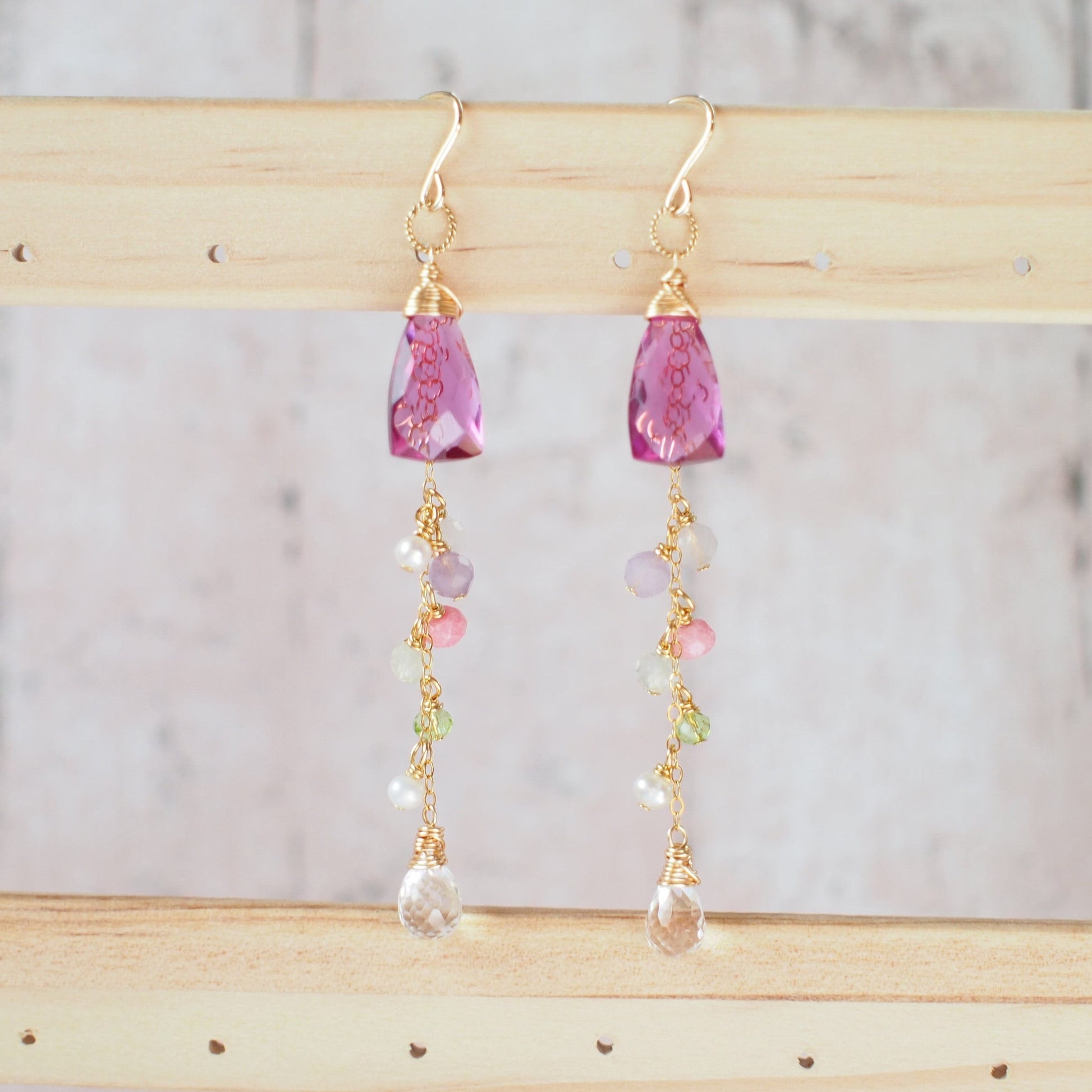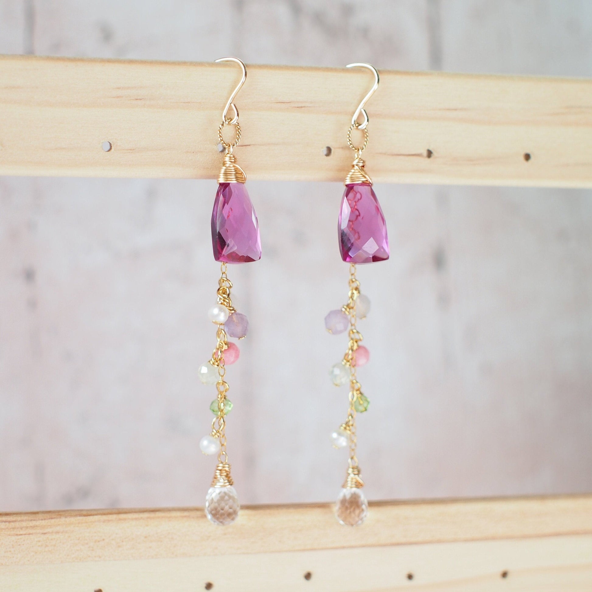 Rhodolite Pink Quartz Earrings // Dangling Style // 14K Gold-filled // Wire-wrapped // Assorted Gems // Sweet & Sassy