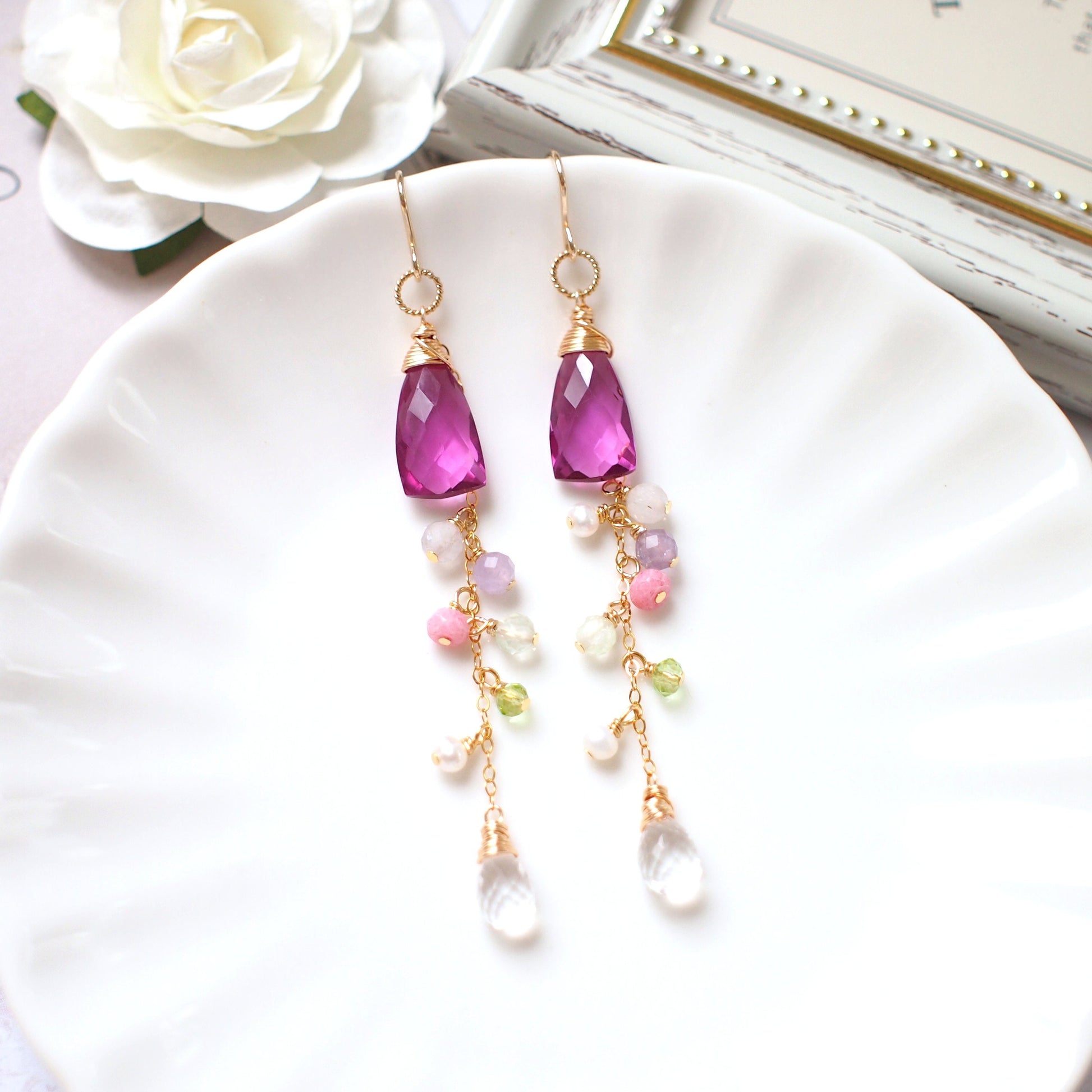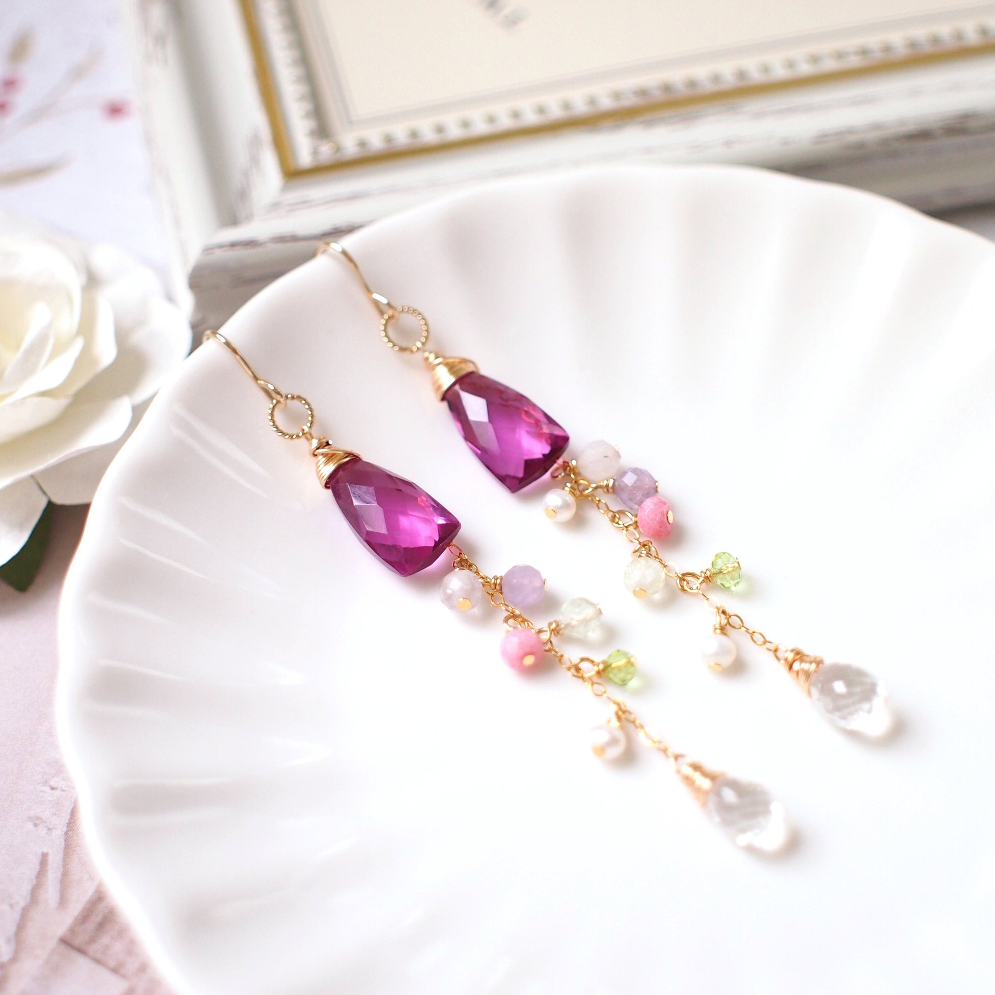 Exclusively for the romantic at heart. These beautiful earrings feature 2 faceted, pyramid shape rhodolite pink quartz, carefully wrapped in gold-plated wire, dangling down a twisted gold ring alongside a chain of lovely, dainty gems - amethyst, pearls, pink opals, prehnite, peridot and clear quartz briolettes. Sweet and sassy at the same time.