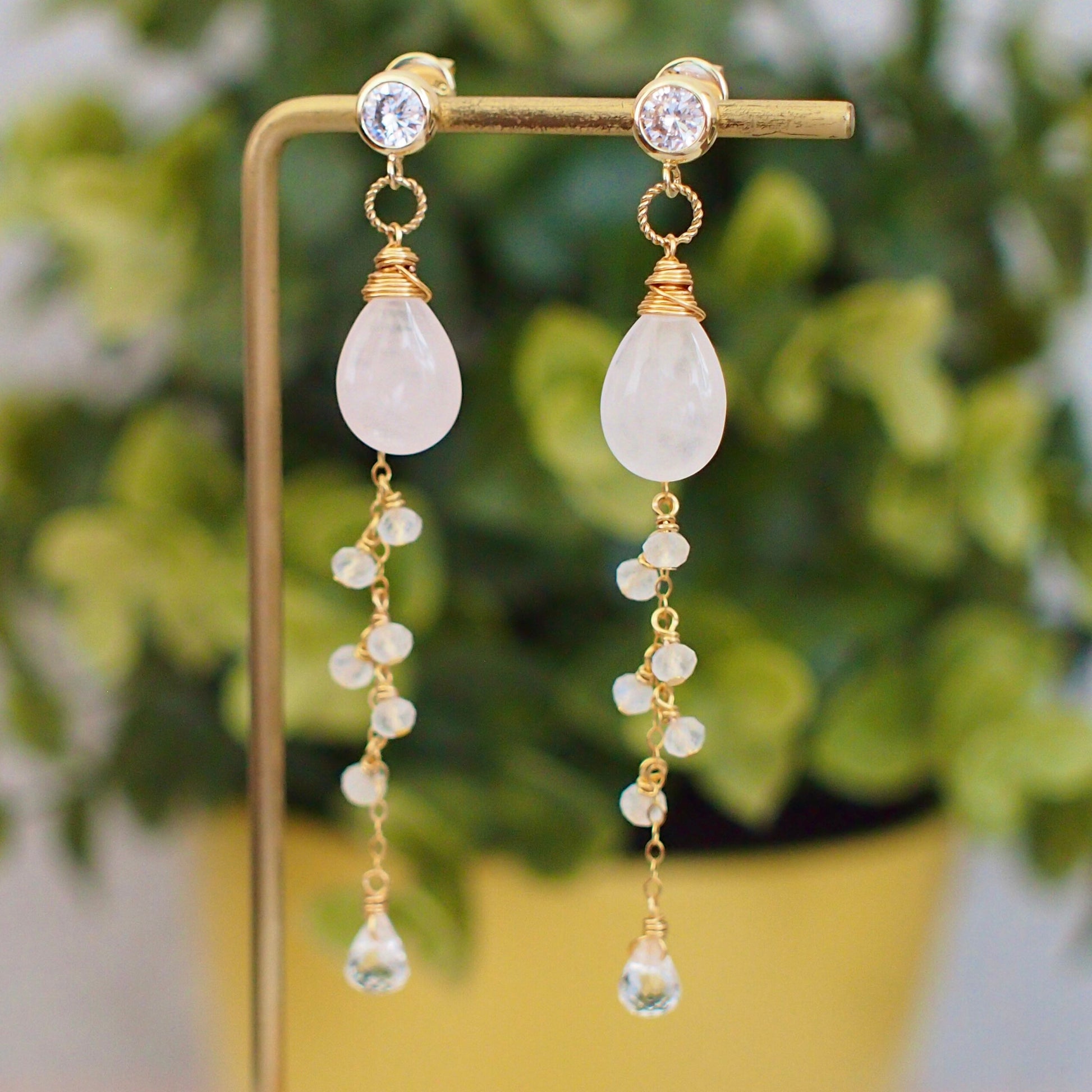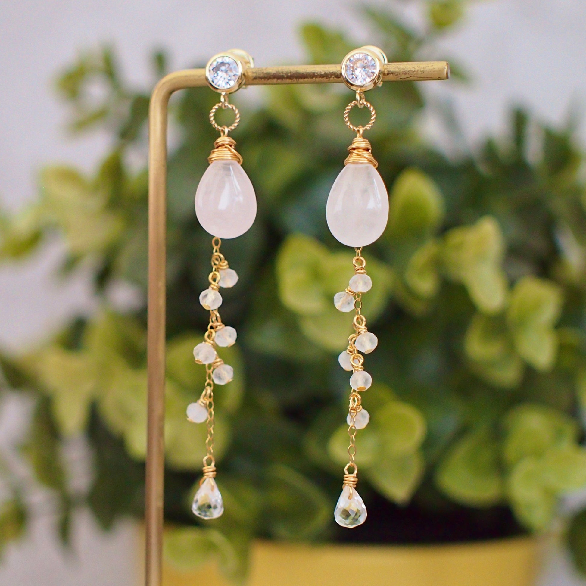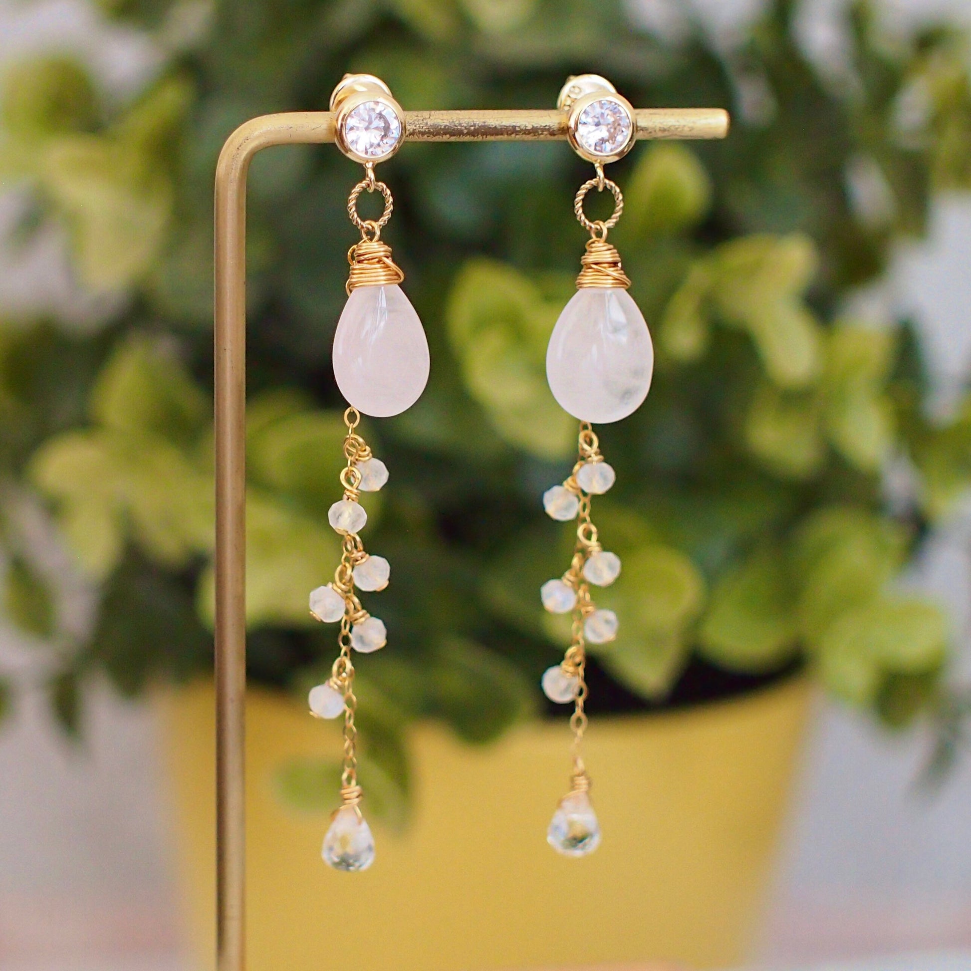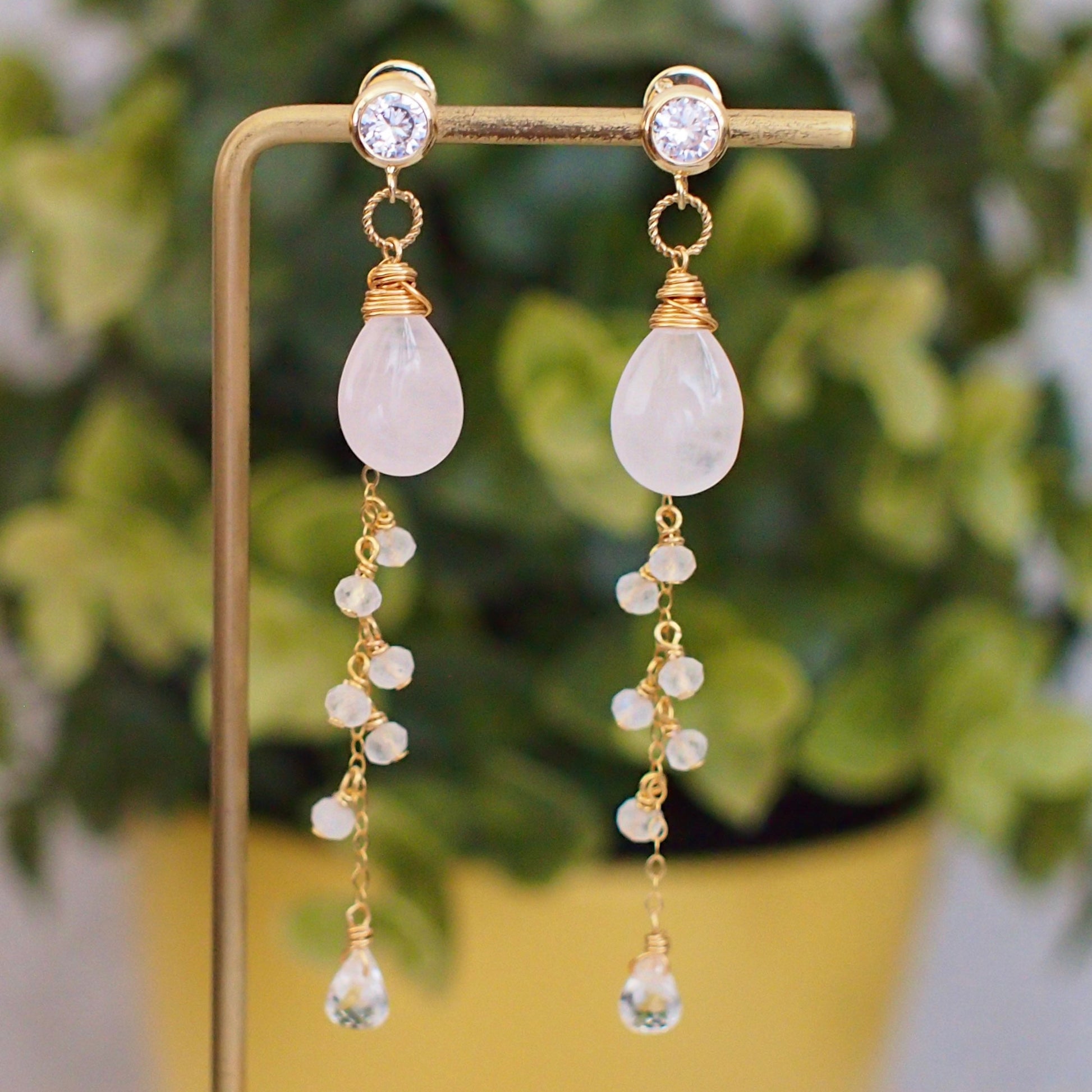 Exclusively for the romantic at heart. These beautiful earrings feature 2 smooth rose quartz drops carefully wrapped in gold-plated wire, dangling down a twisted gold ring alongside a chain of lovely, dainty faceted round moonstones and clear quartz briolettes. Sweet and tasteful at the same time.