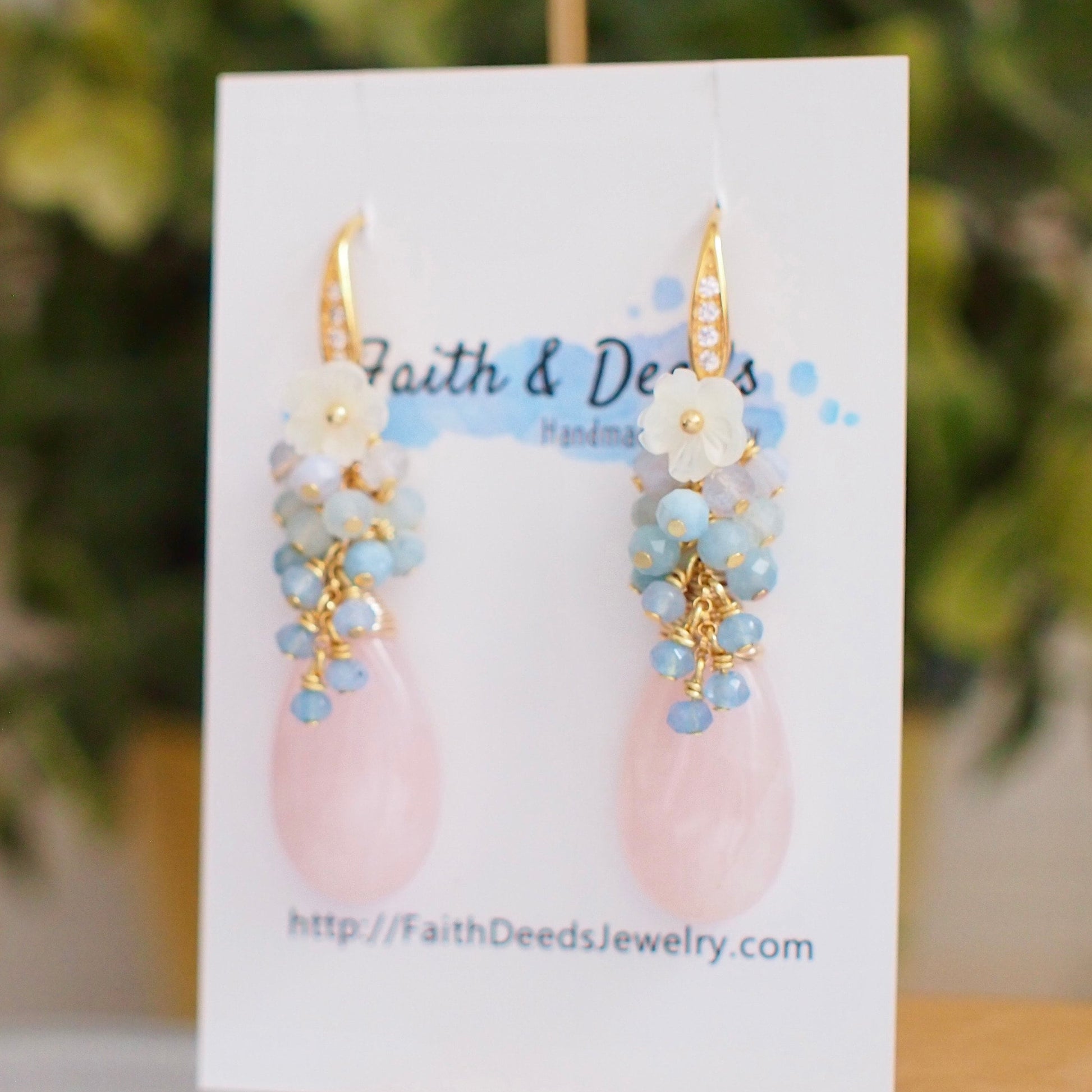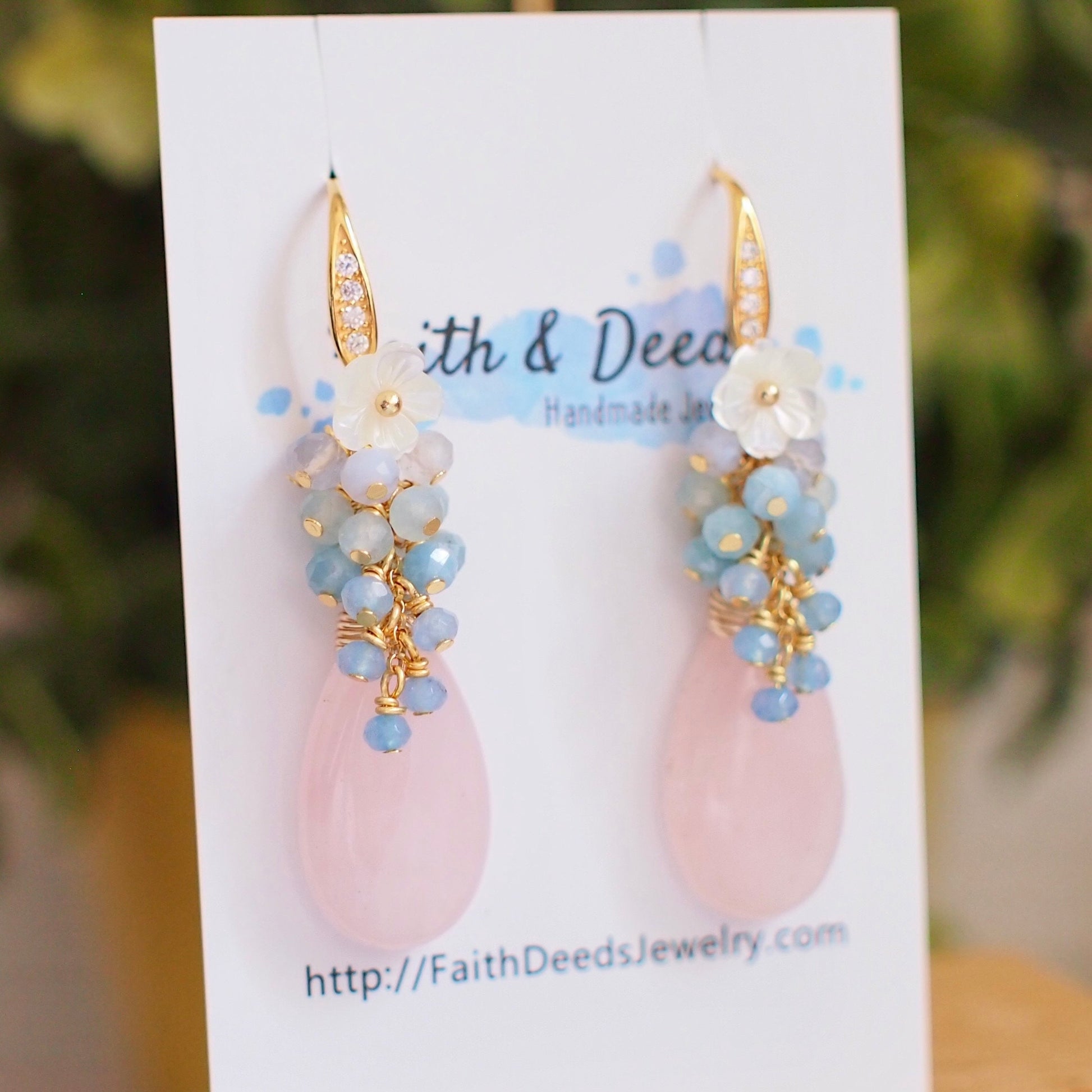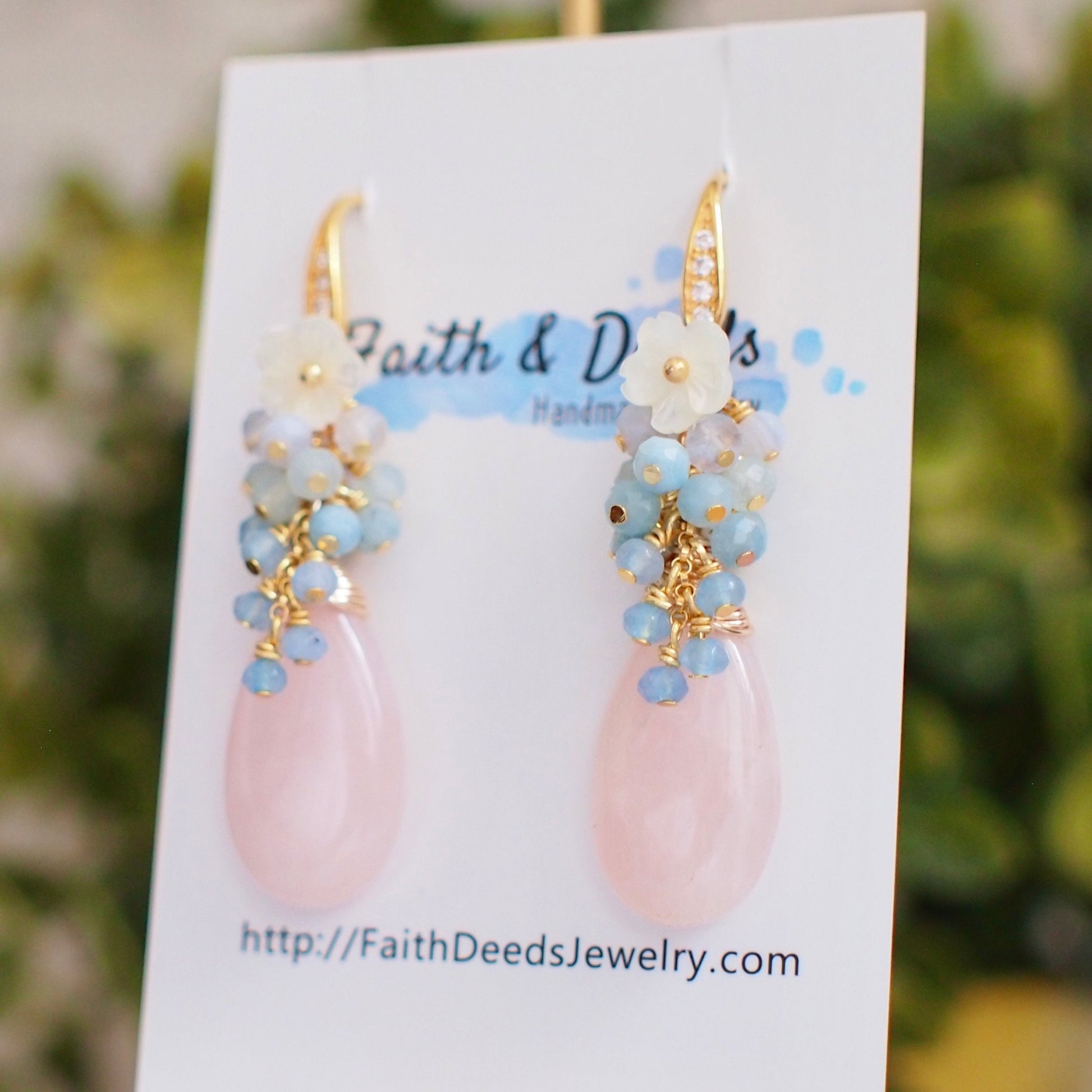 Sweet and feminine. These beautiful earrings are featuring 2 large, smooth rose quartz drops carefully wire-wrapped in gold-plated wire topped with a gem cluster that’s made of chalcedony, aquamarine, blue lace agate and white mother-of-pearl flowers . A incredibly lovely design for the romantic at heart.