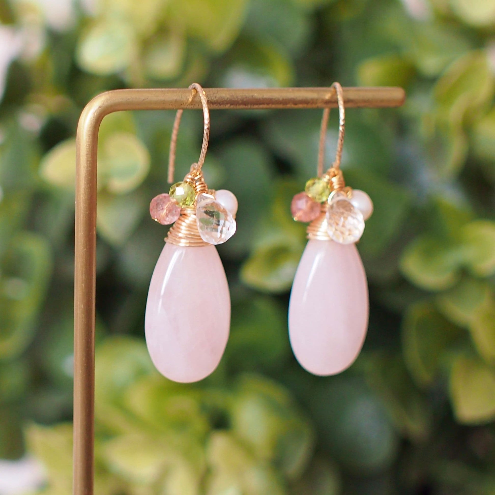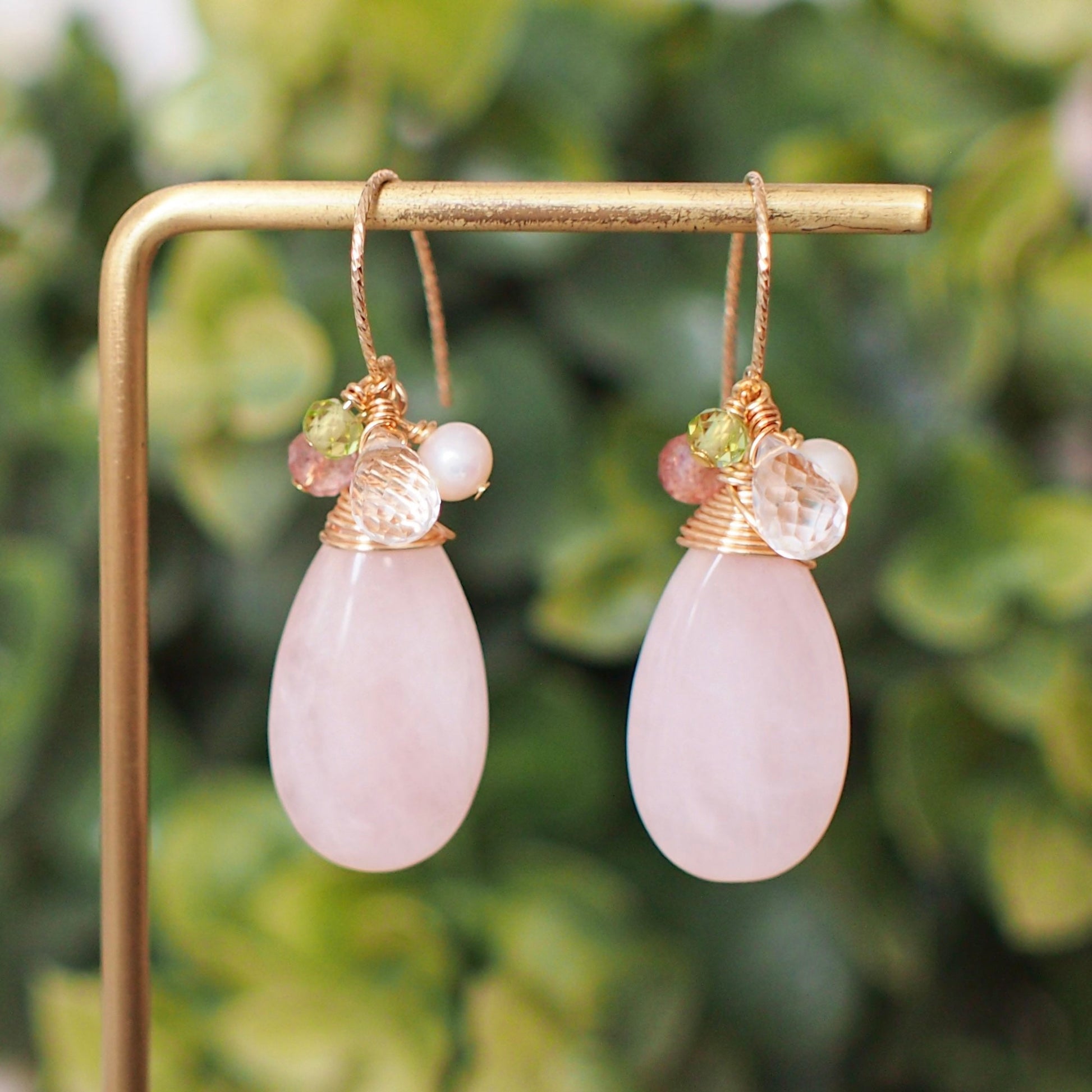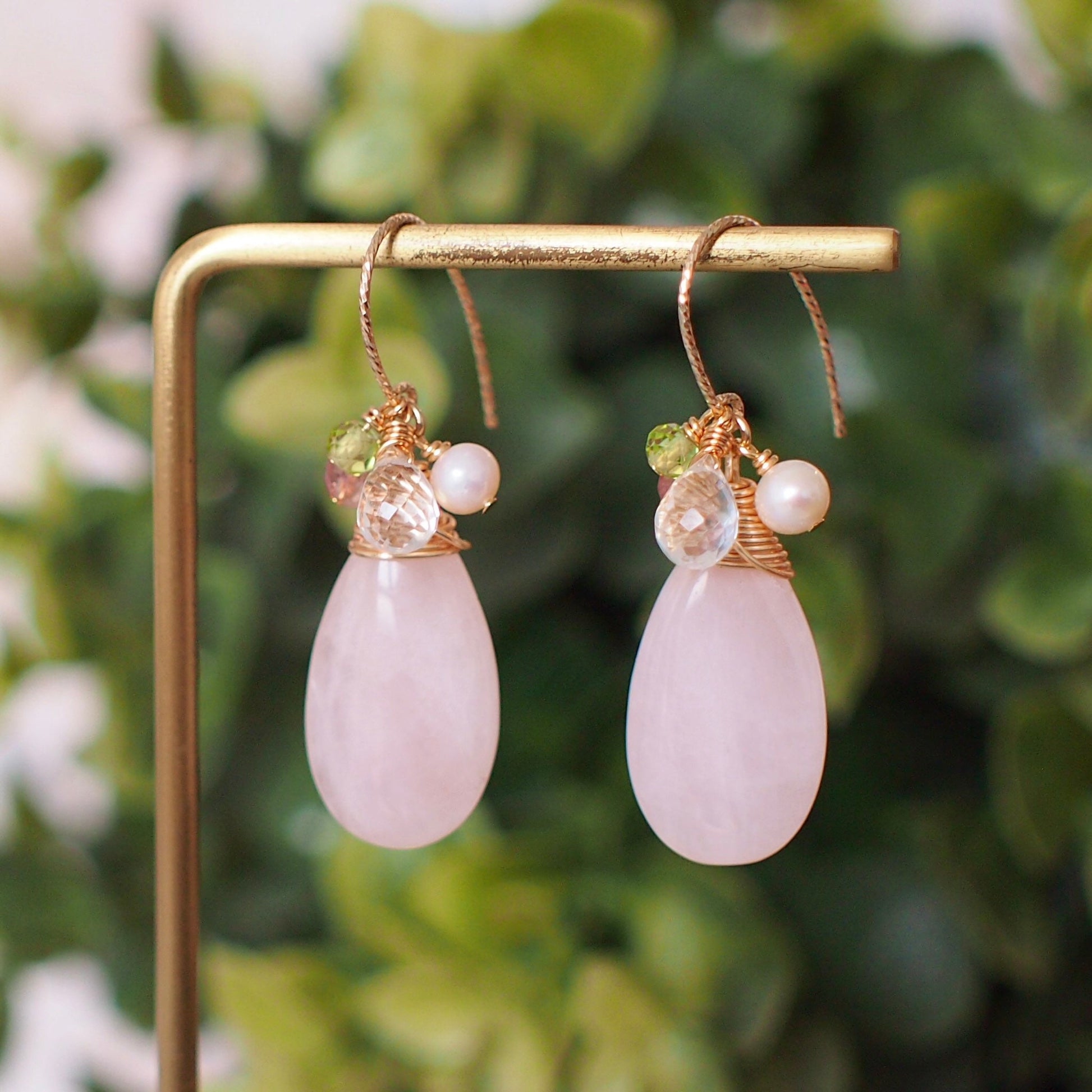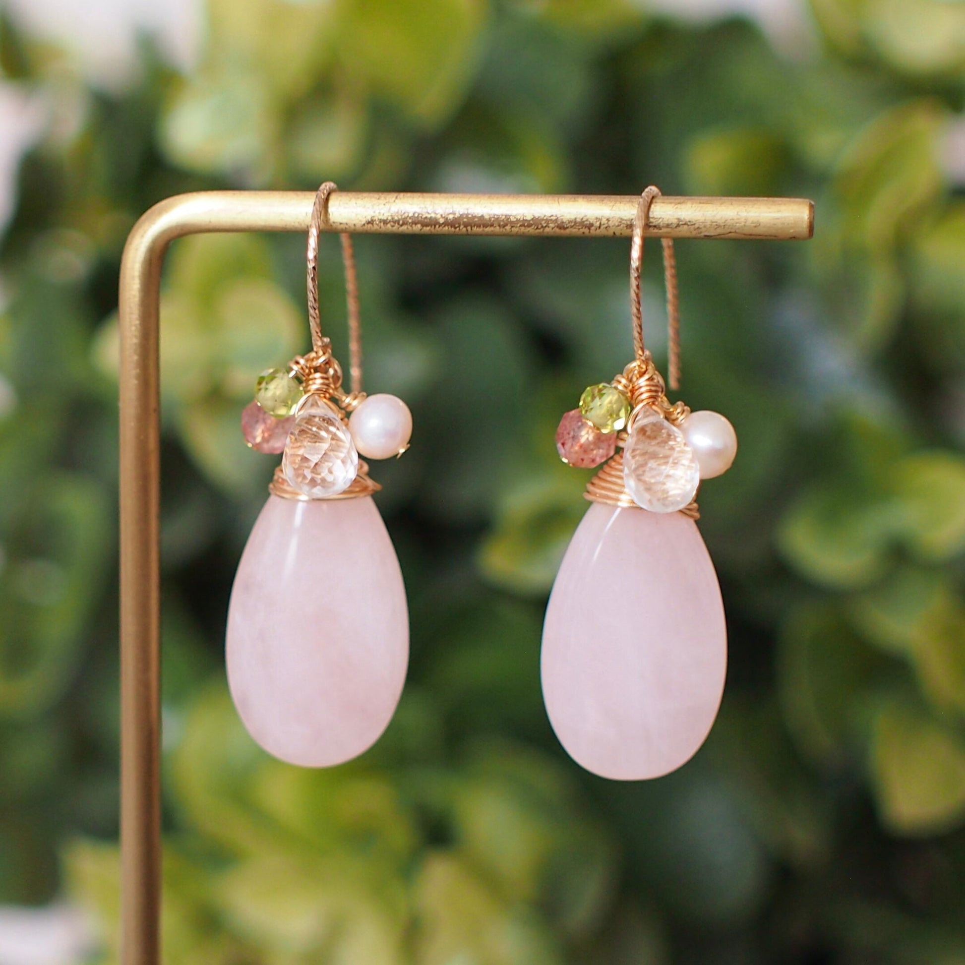 Tasteful and gorgeous. These beautiful earrings are featuring 2 large, smooth rose quartz drops carefully wire-wrapped in gold-plated wire topped with clear quartz briolettes, strawberry quartz, pearls and peridot rondelles. A very elegant design, and it can be worn as your very unique statement earrings.