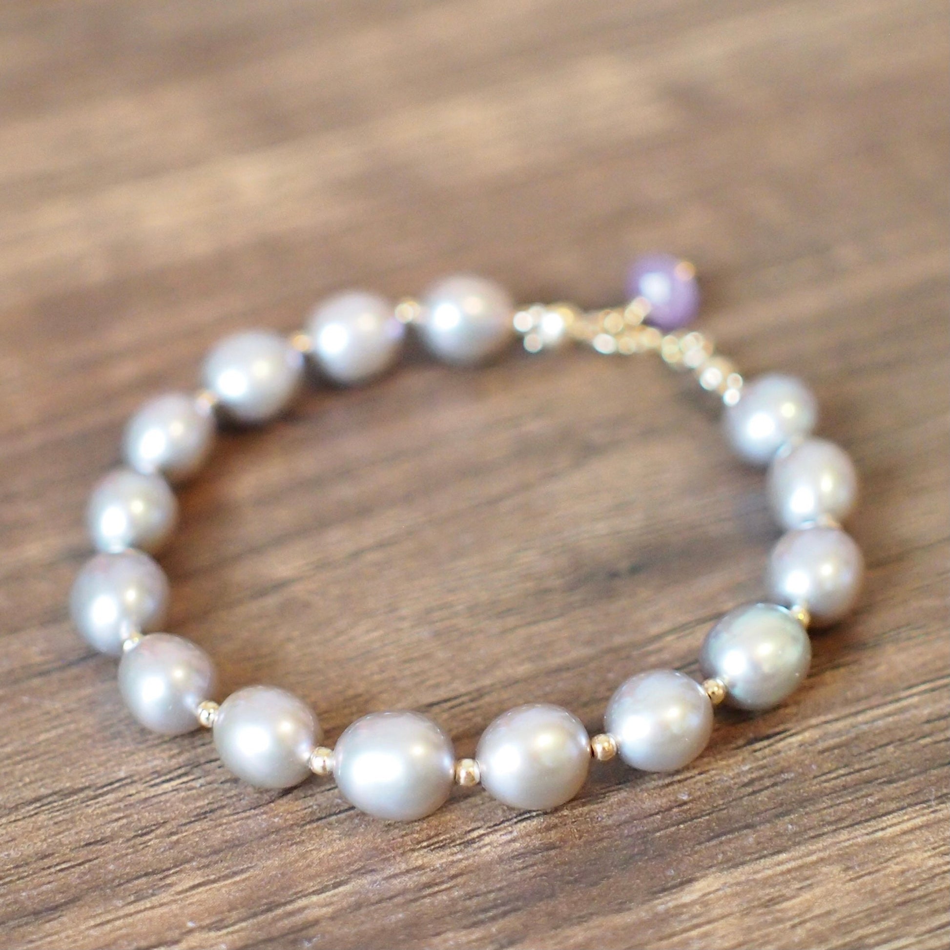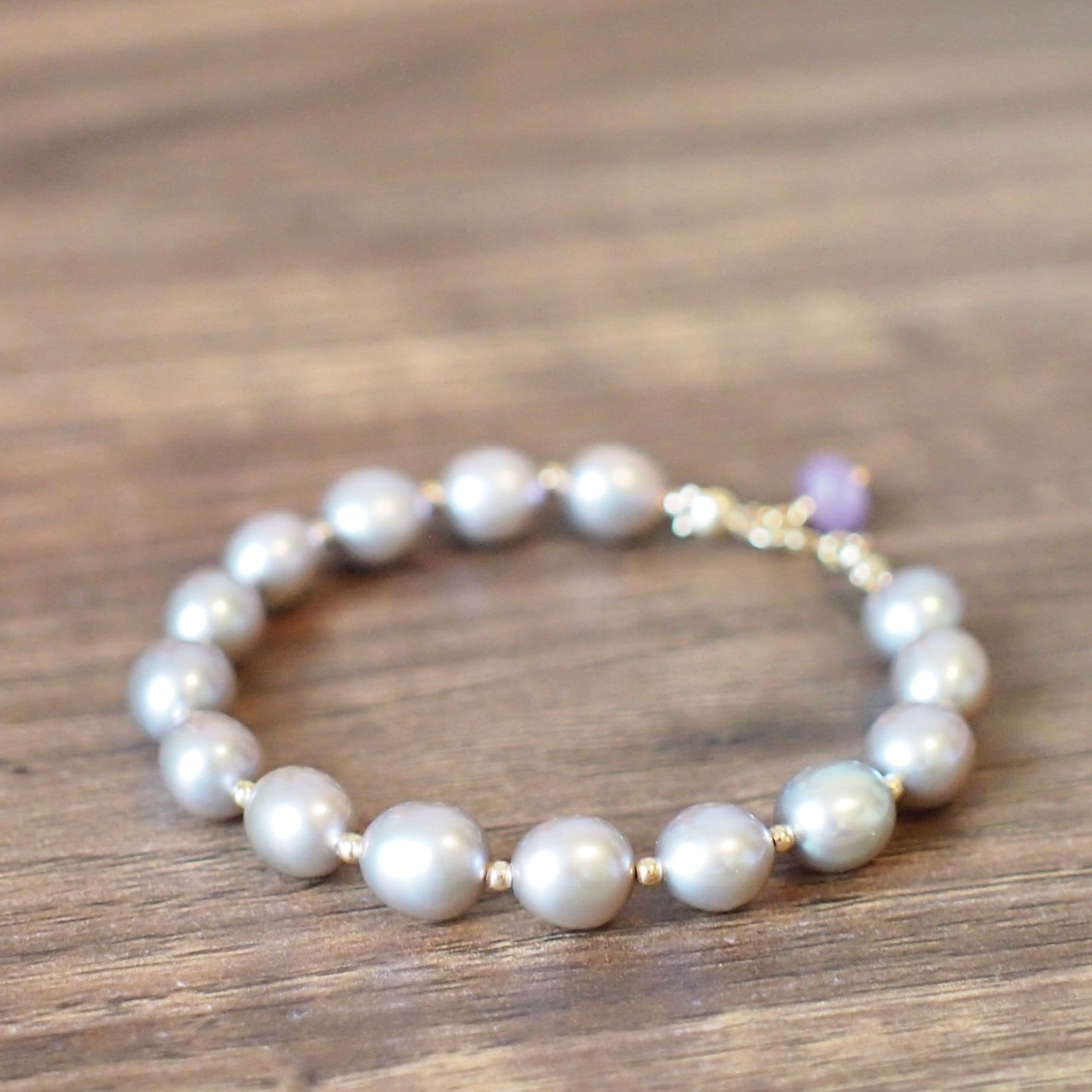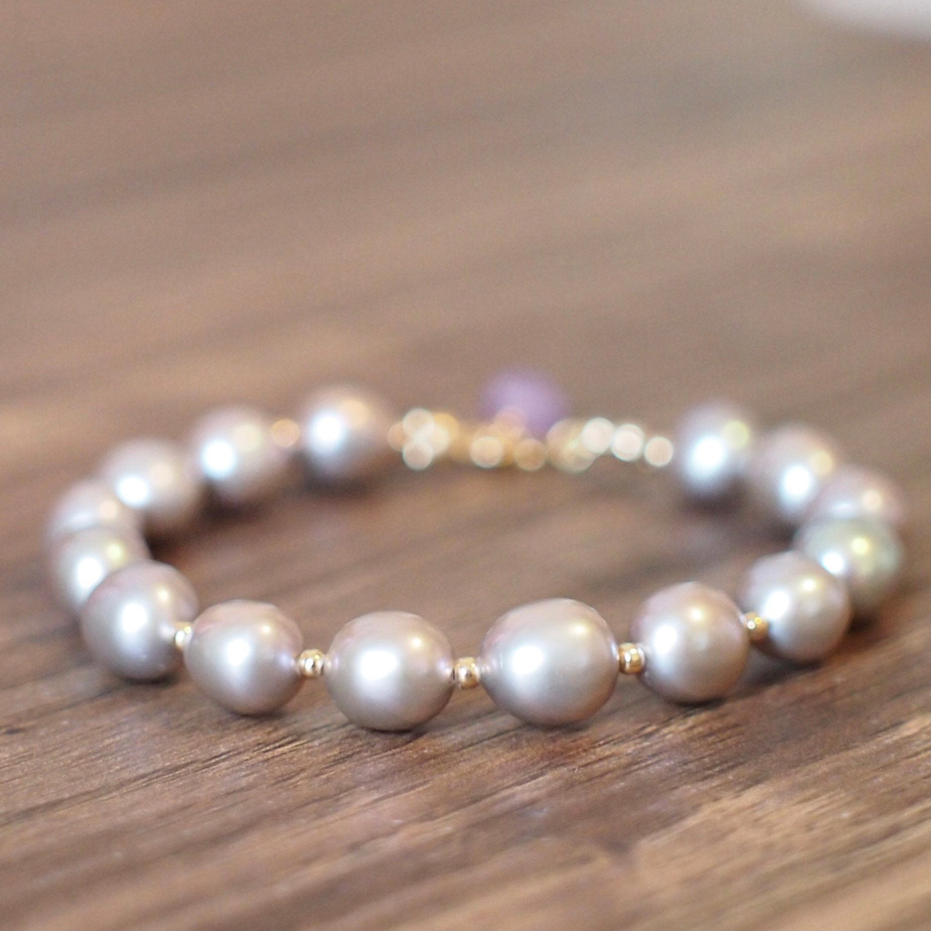 Gorgeous and chic. This lovely bracelet is made with these beautiful silverish gray baroque pearls with purple and blue undertone, with a purple amethyst rondelle dangling as a dainty change at the opening. This bracelet is a must-have for pearl lovers!