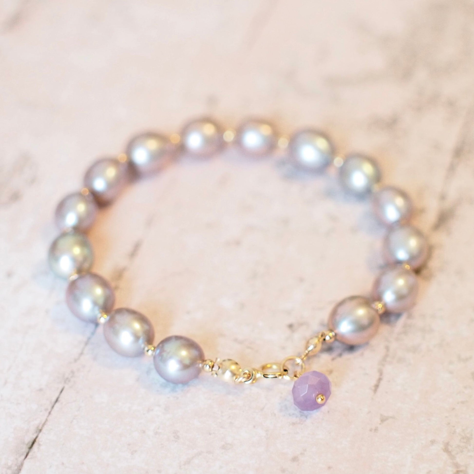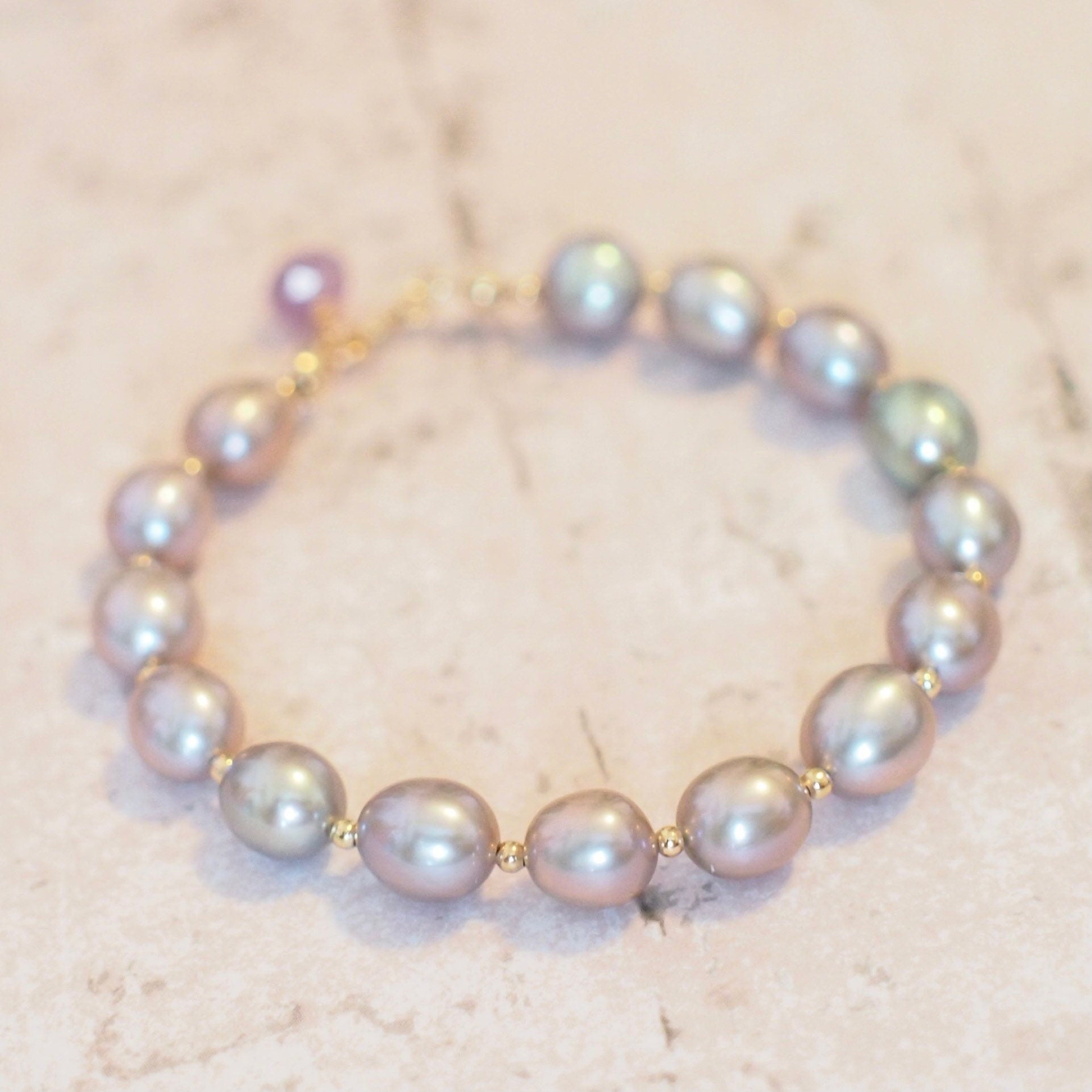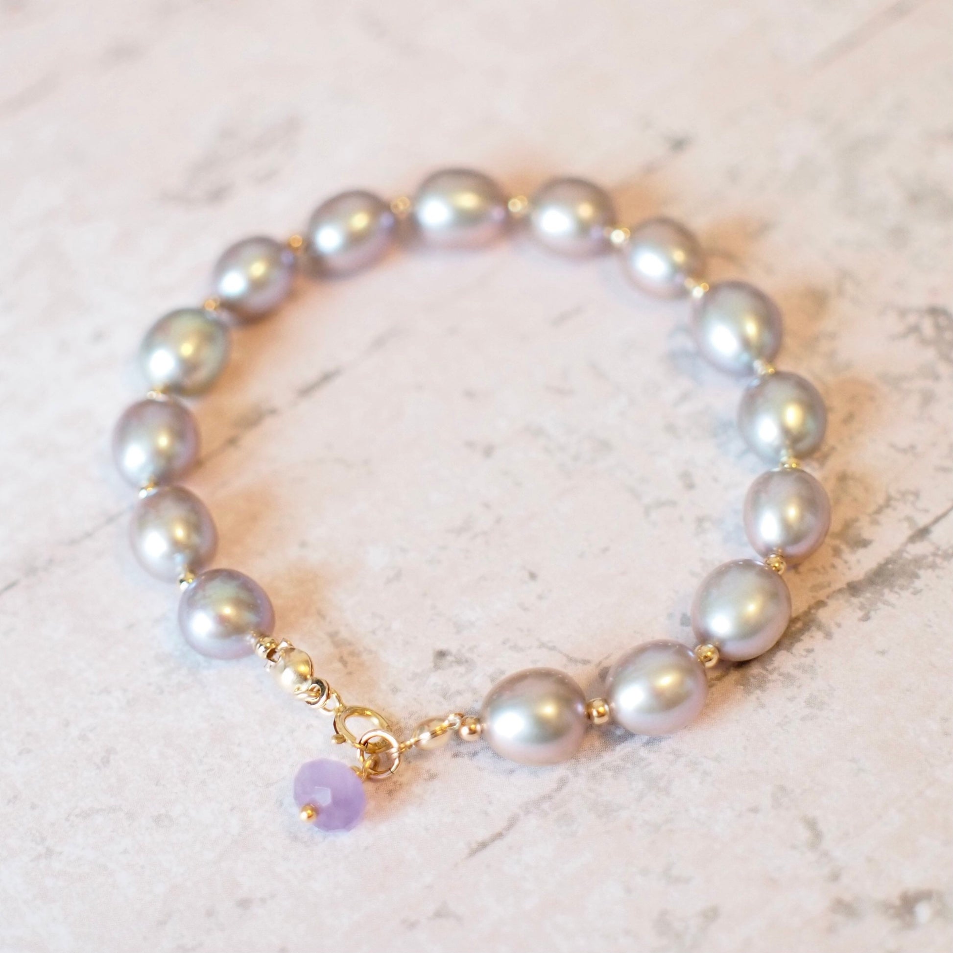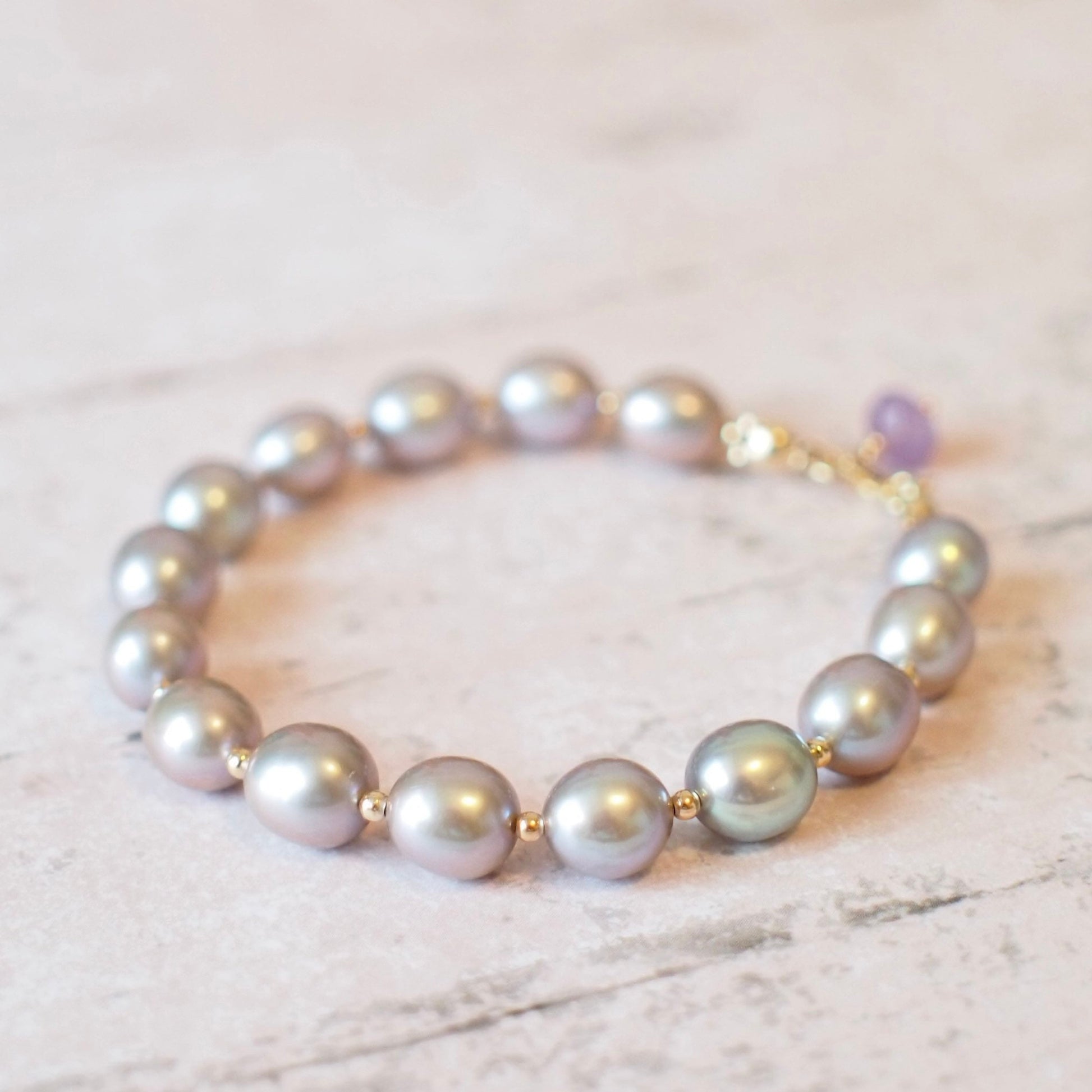 Gorgeous and chic. This lovely bracelet is made with these beautiful silverish gray baroque pearls with purple and blue undertone, with a purple amethyst rondelle dangling as a dainty change at the opening. This bracelet is a must-have for pearl lovers!
