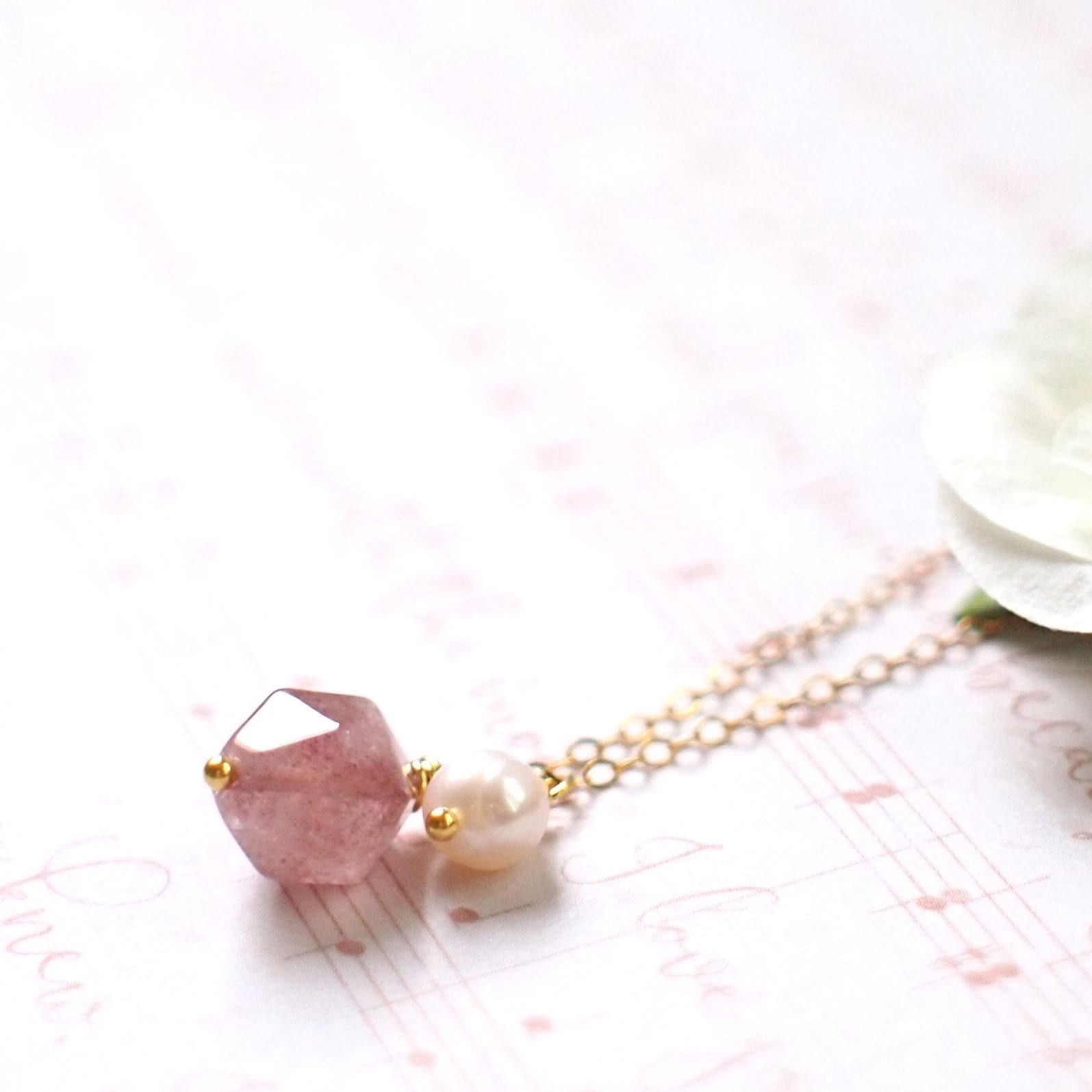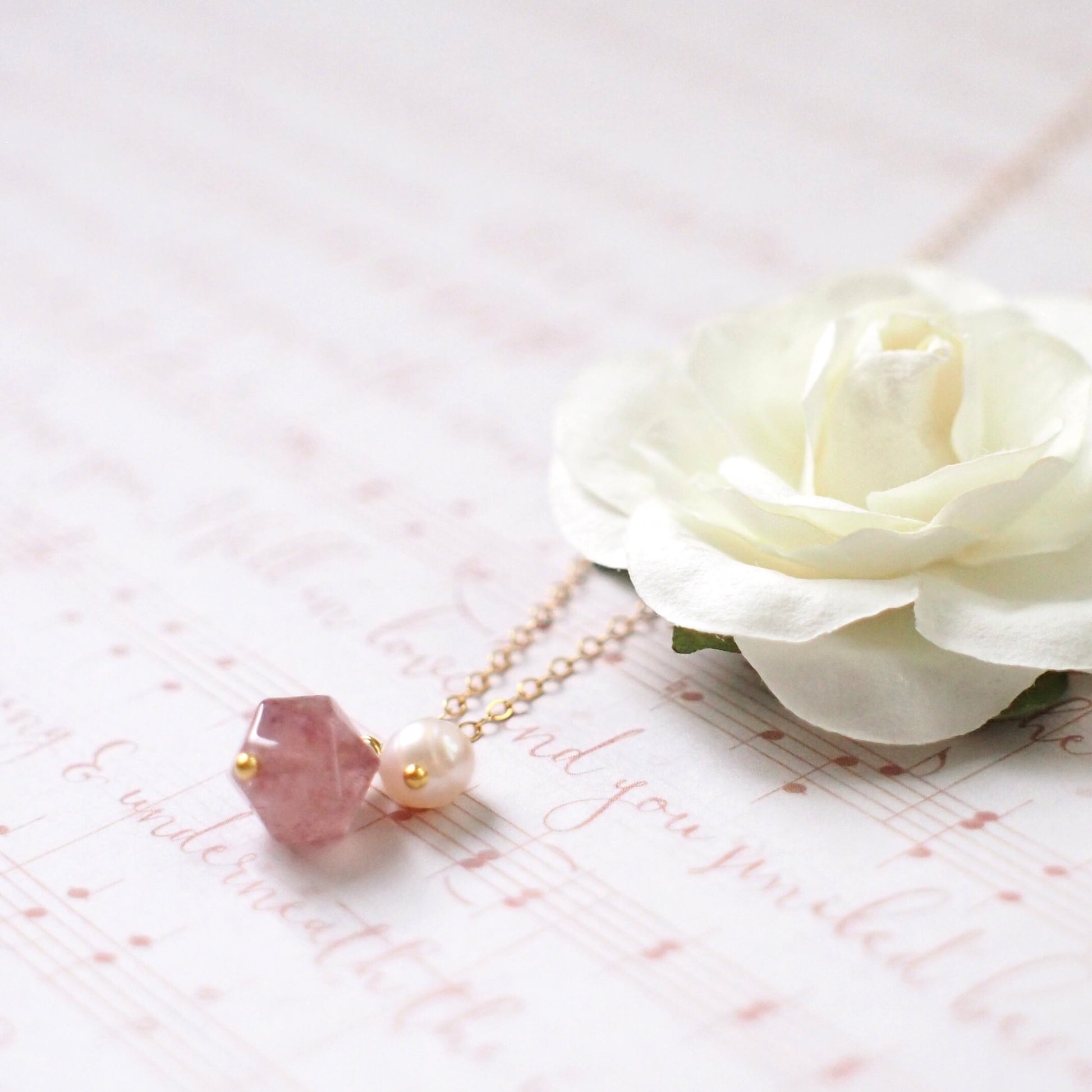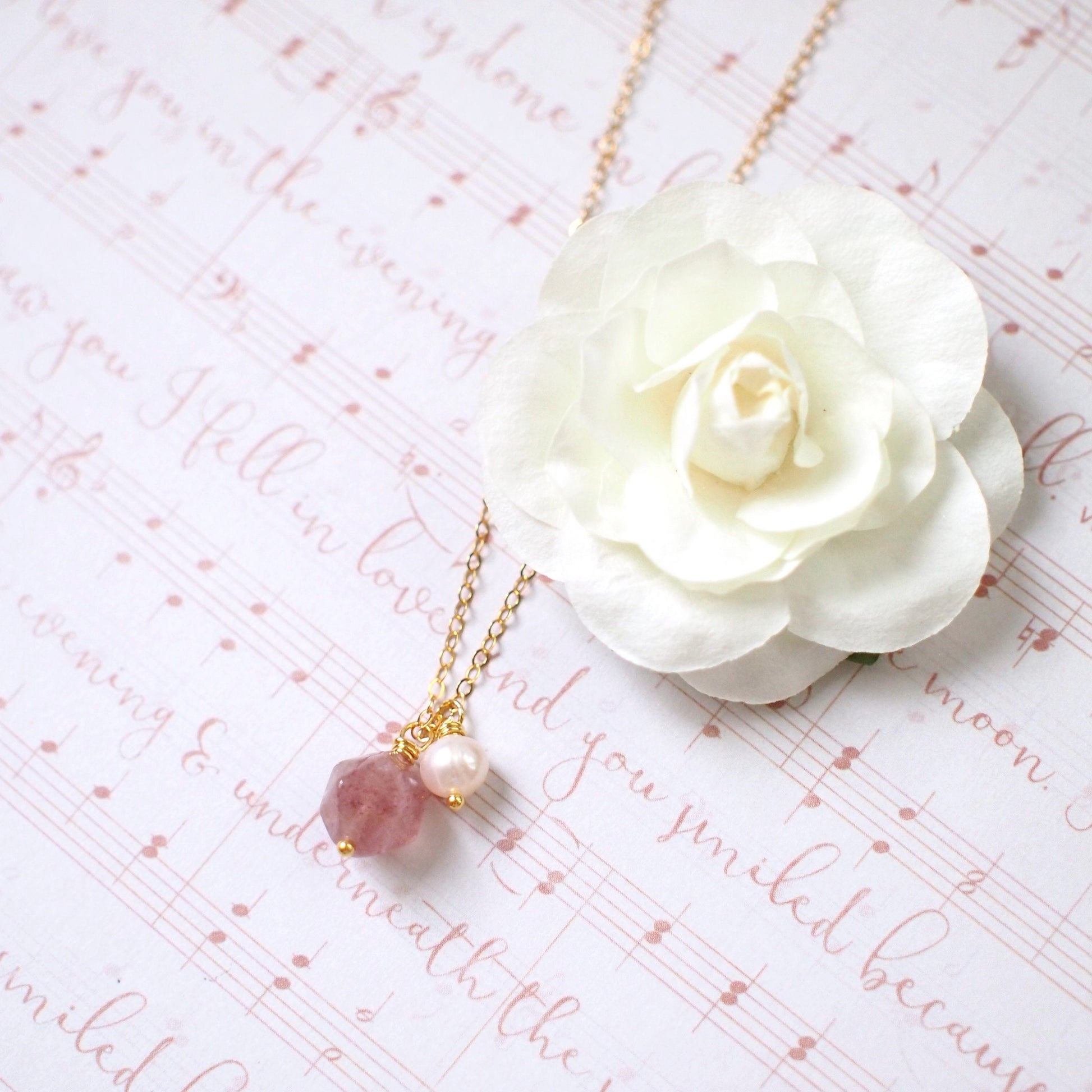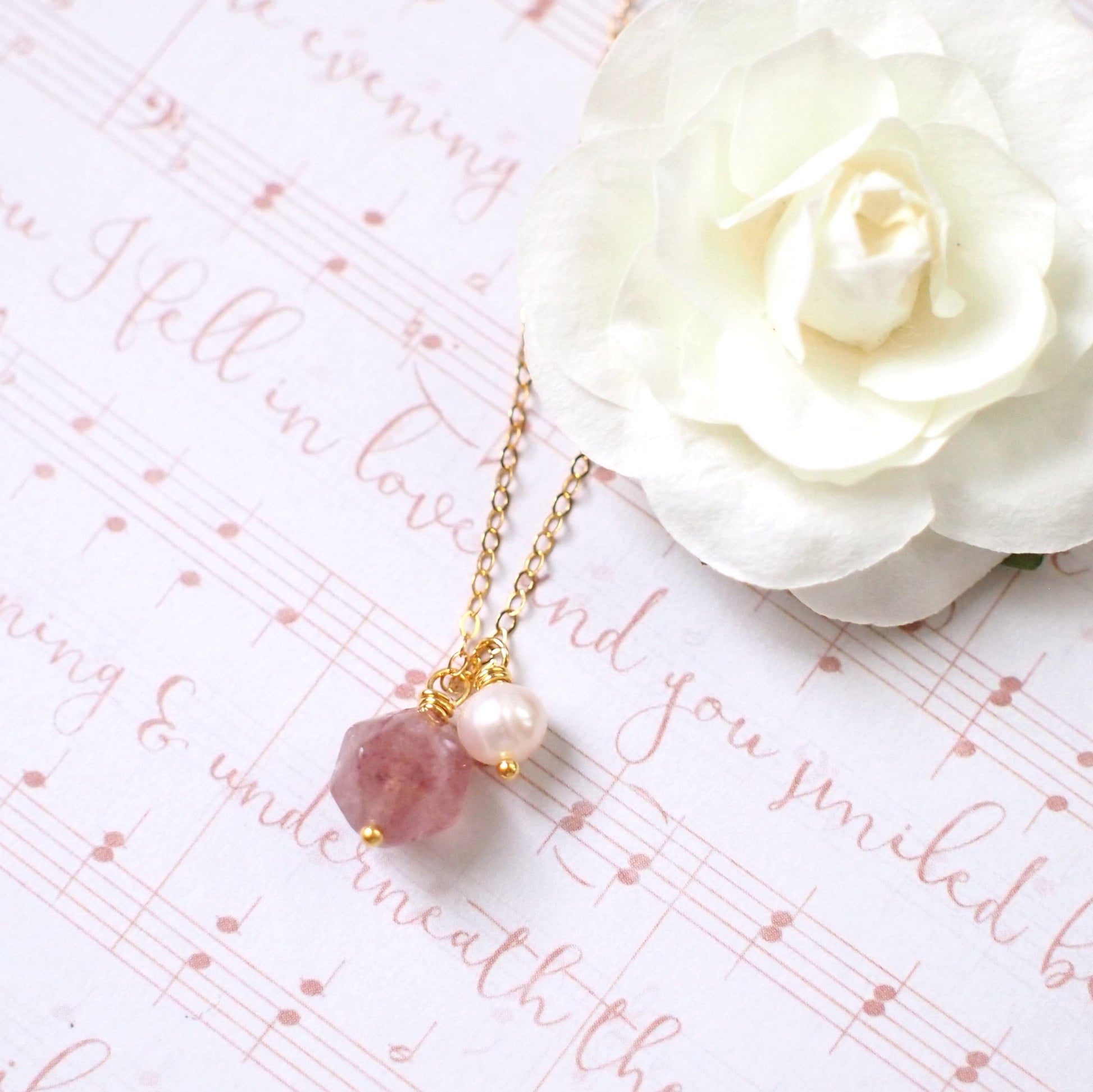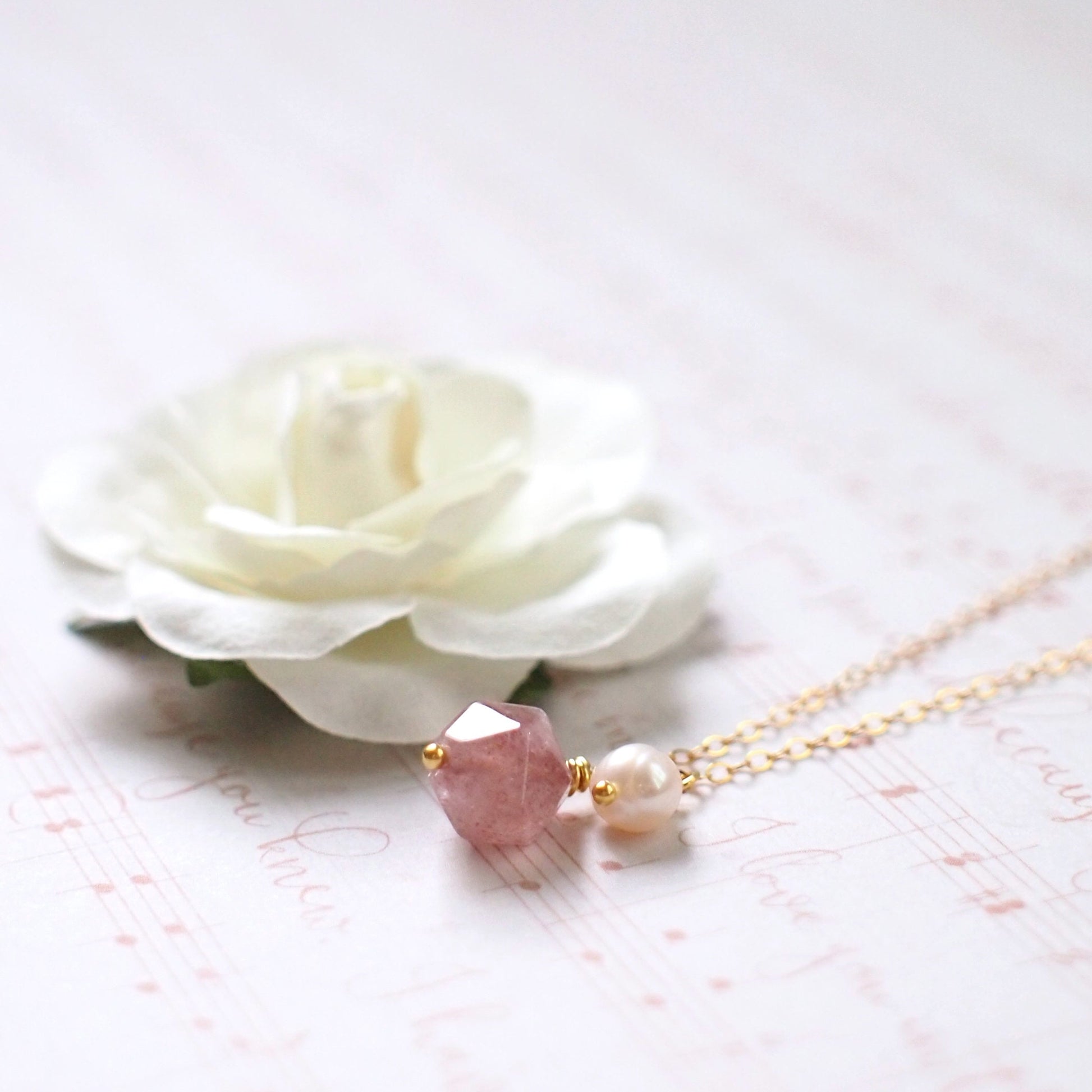 Strawberry Quartz x Pearl Necklace // Gem Stone Pendant // 14K Gold-filled // Romantic & Sweet