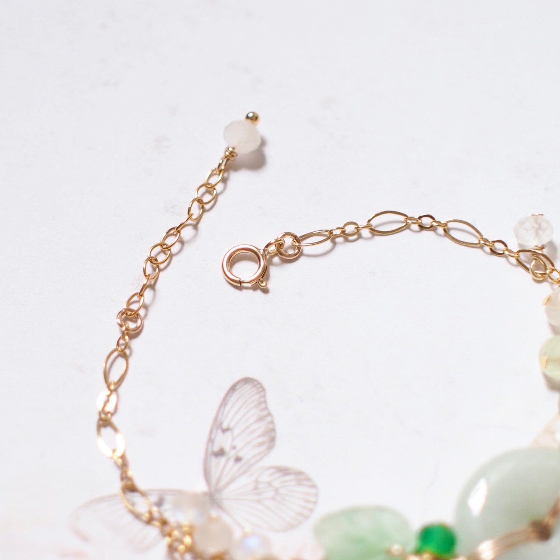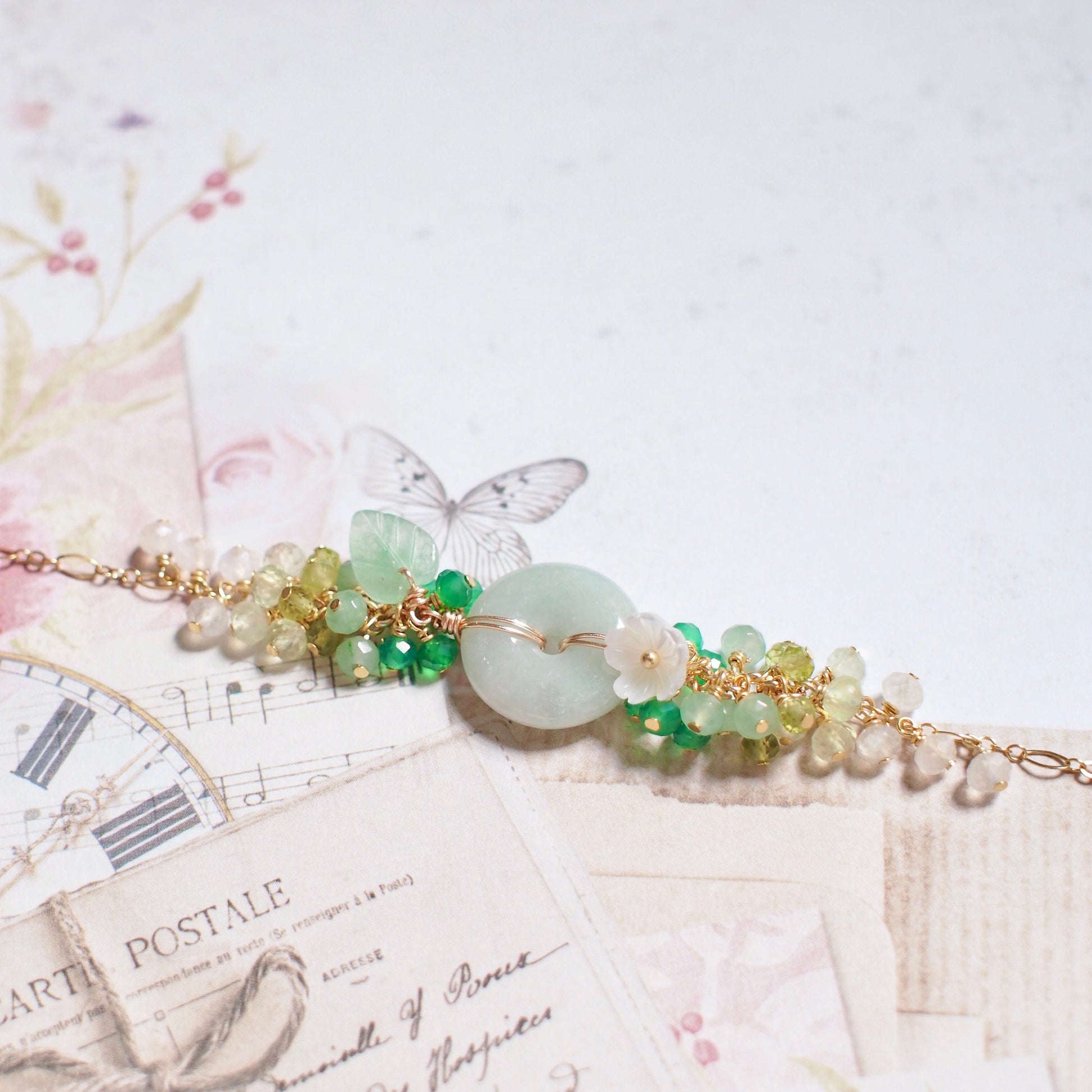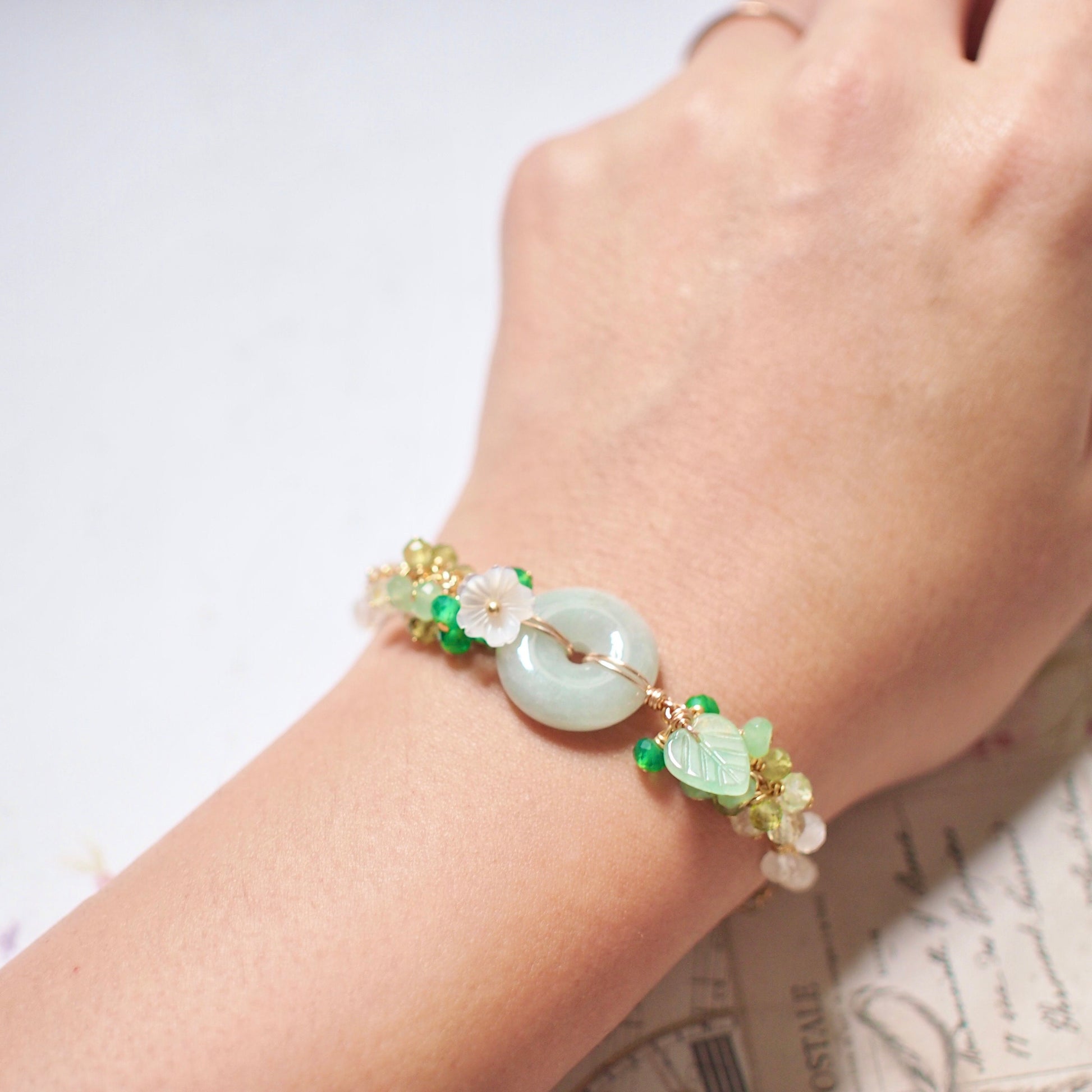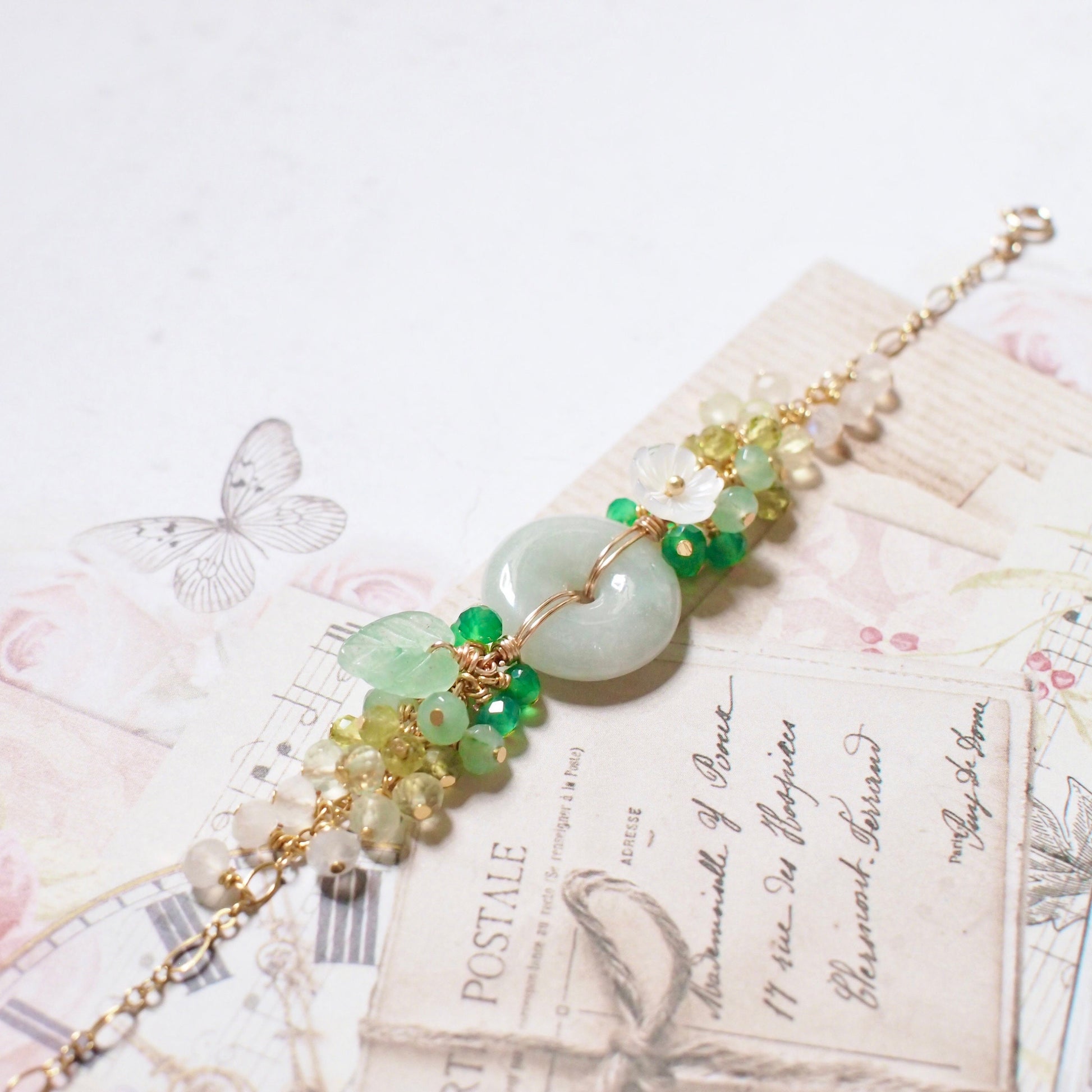 Lovely & refreshing This beautiful bracelet is featuring a type A Burmese jade donut in light apple green colour at the centre accompanied by ombré gem cluster on both sides: green agate, aventurine, peridot, prehnite and moonstone, plus white mother-of-pearl flower cabochons and aventurine leaf to complete the floral look.