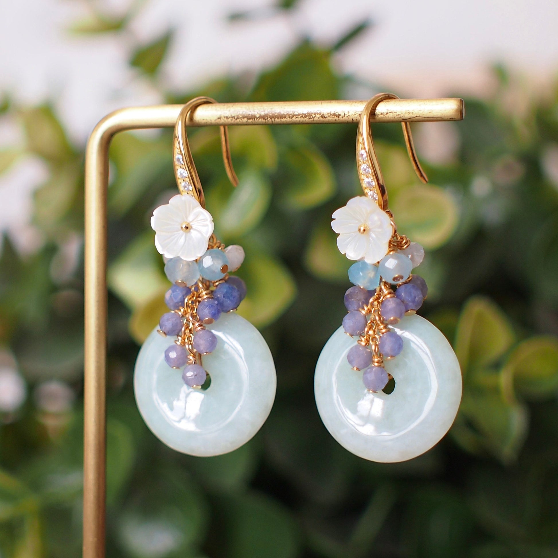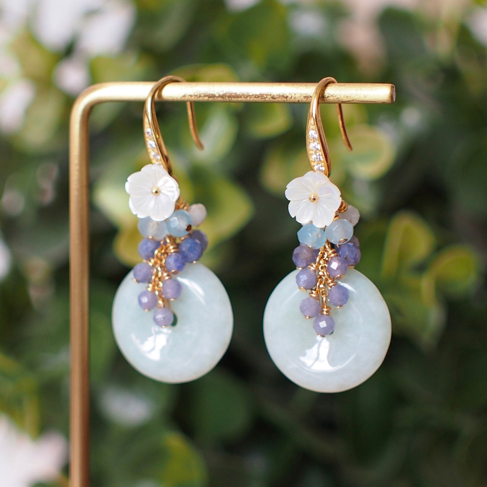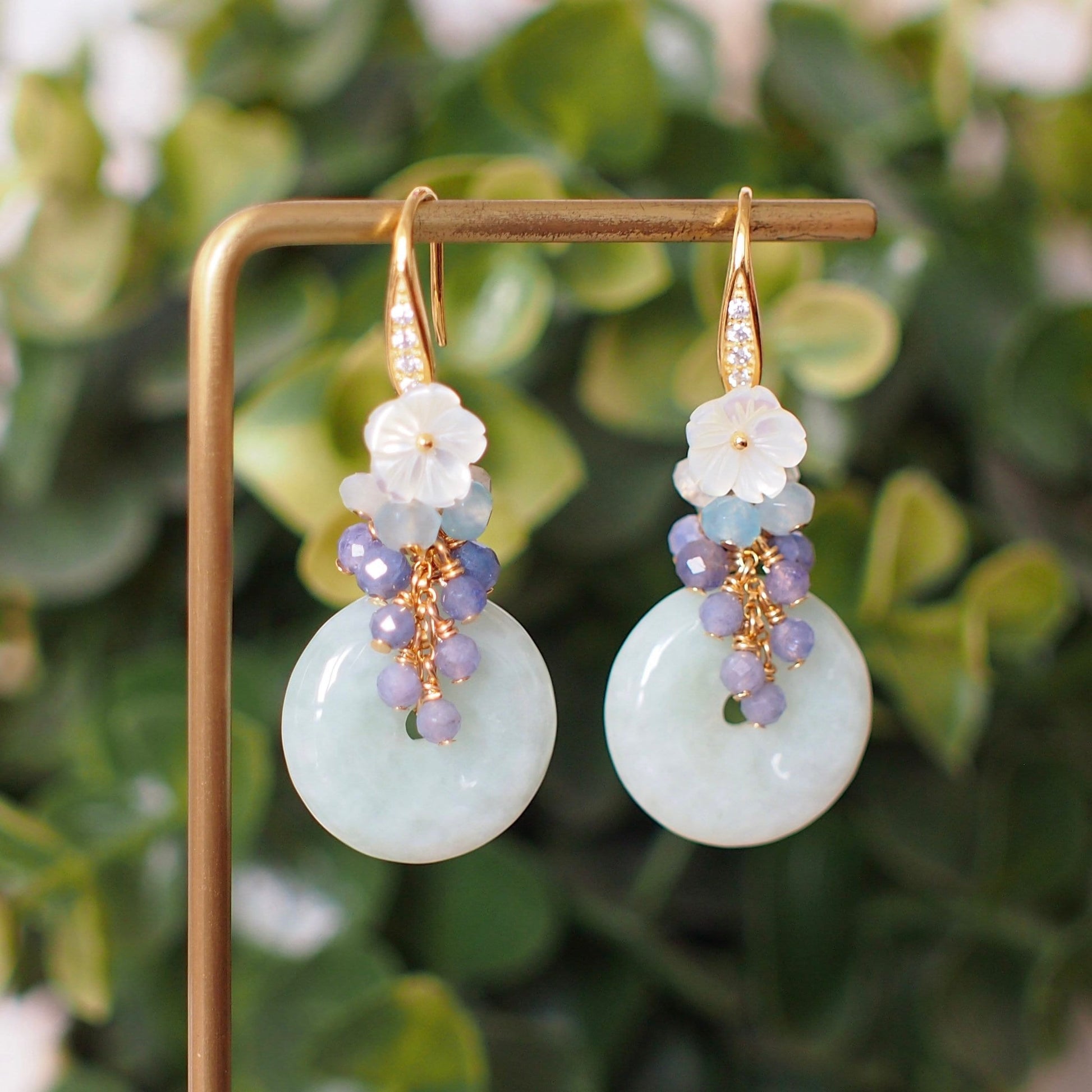 Elegant and romantic. These beautiful earrings are made with Type A Burmese jade donuts in light green colour, dressed with cluster of faceted tanzanite, chalcedony, aquamarine and dainty white flower cabochon made with mother of pearl. A one of a kind design for jade lovers. This design will go well with white jade donuts too. Options available to select between light green and white jade donuts during check out.