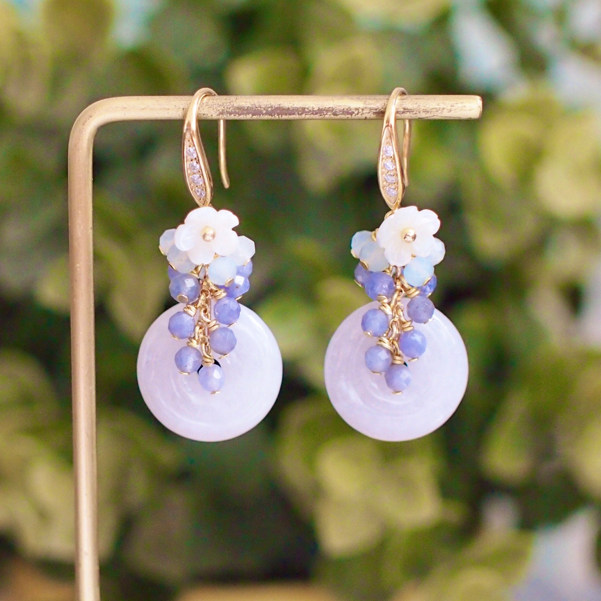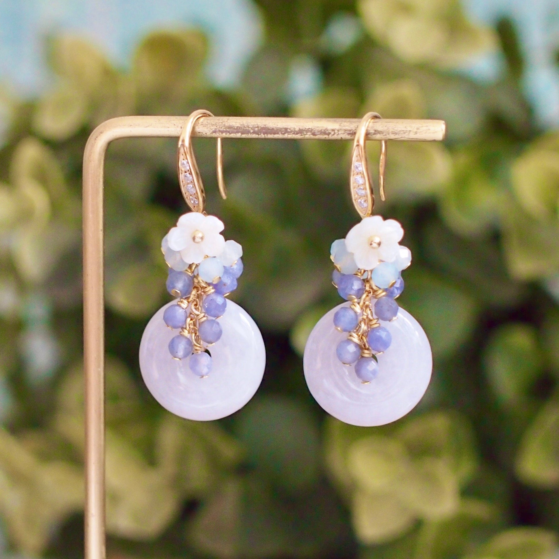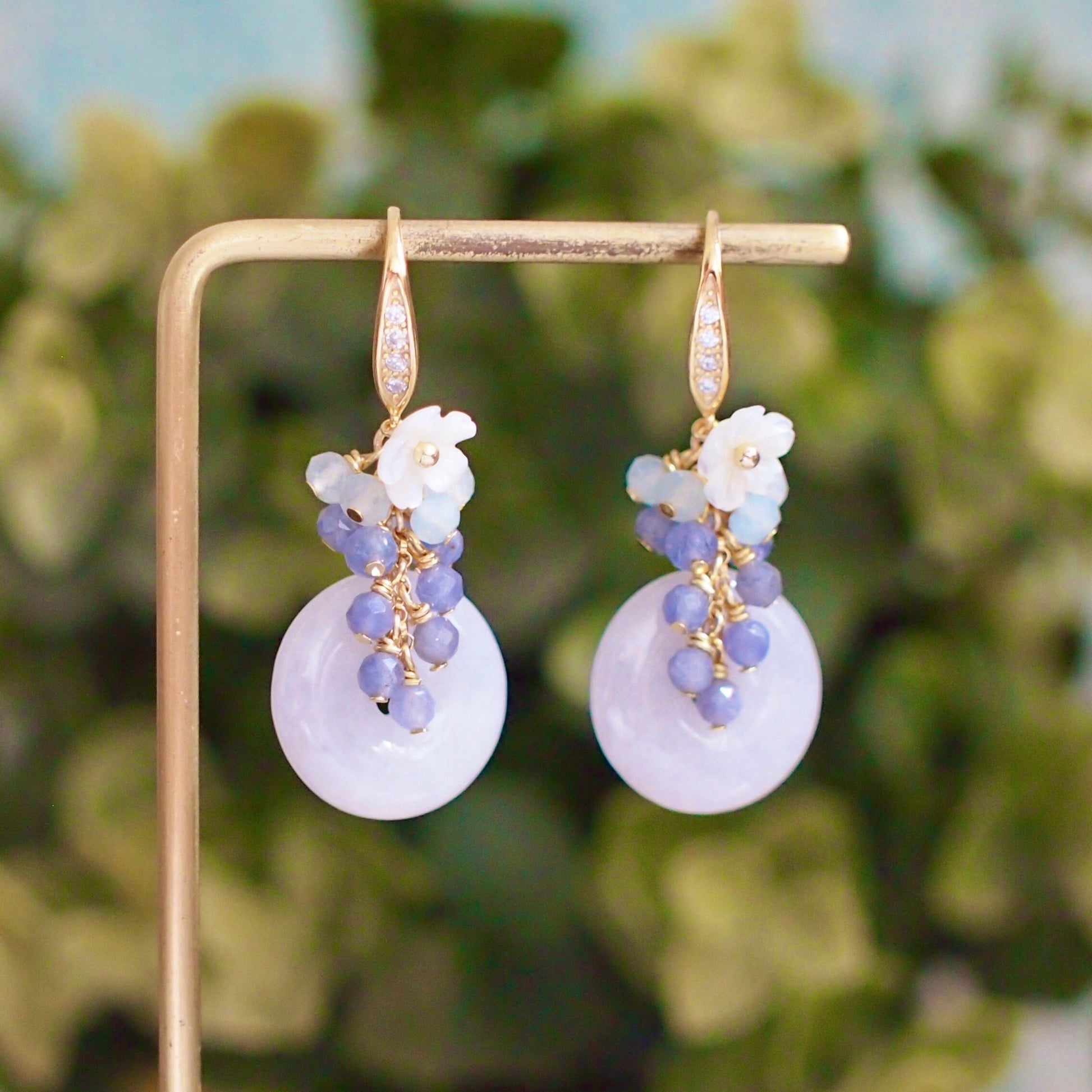 Elegant and romantic. These beautiful earrings are made with Type A Burmese jade donuts in light green colour, dressed with cluster of faceted tanzanite, chalcedony, aquamarine and dainty white flower cabochon made with mother of pearl. A one of a kind design for jade lovers. This design will go well with white jade donuts too. Options available to select between light green and white jade donuts during check out.