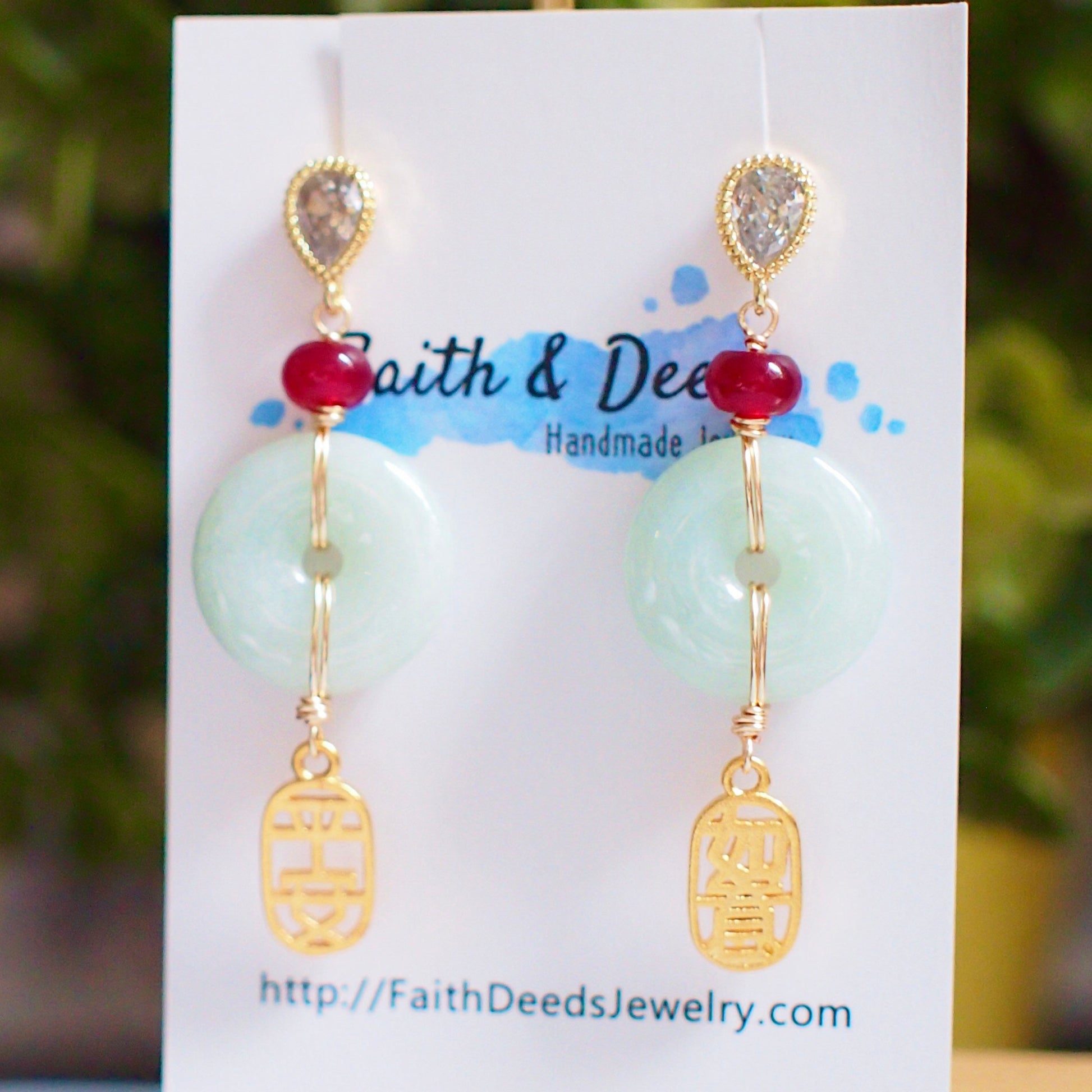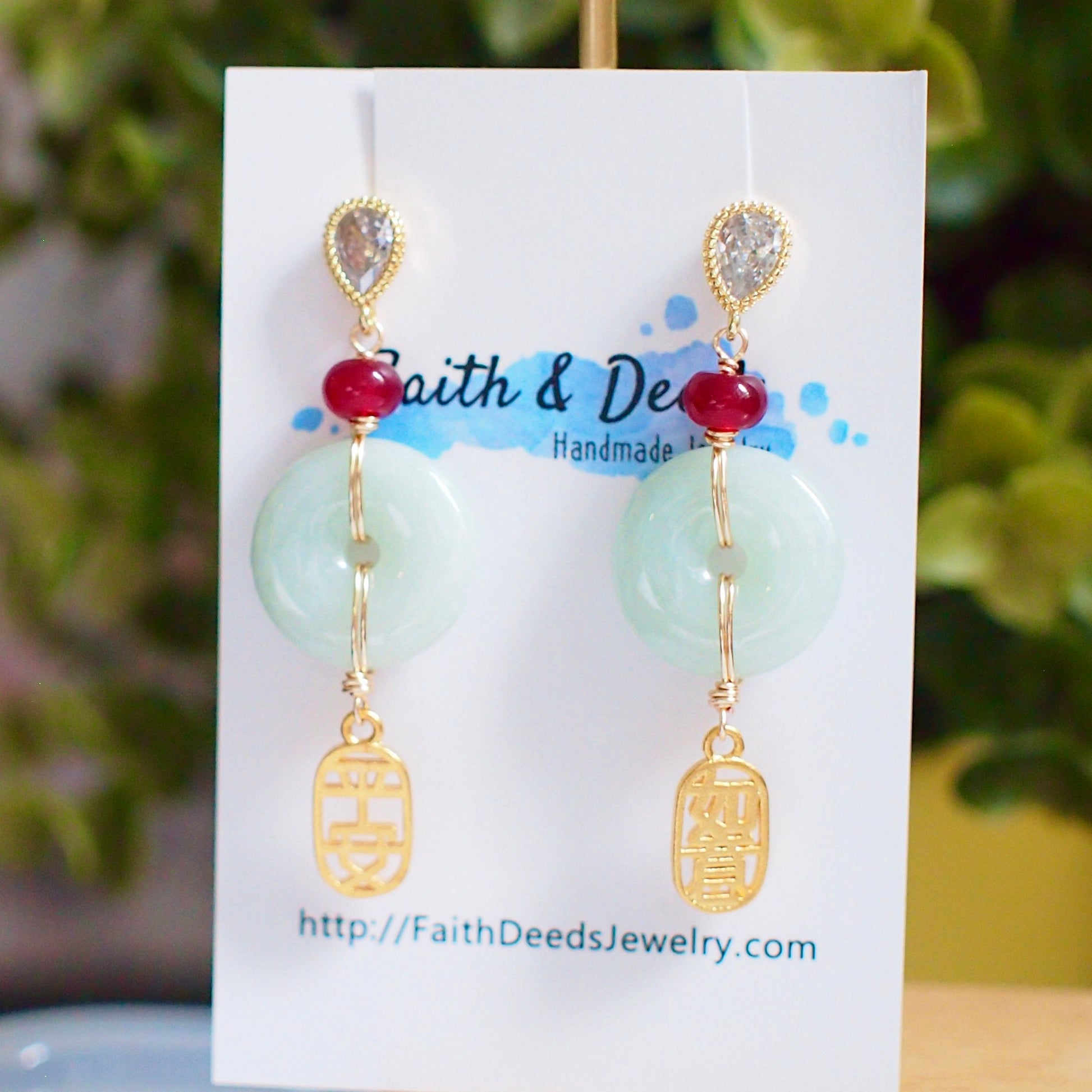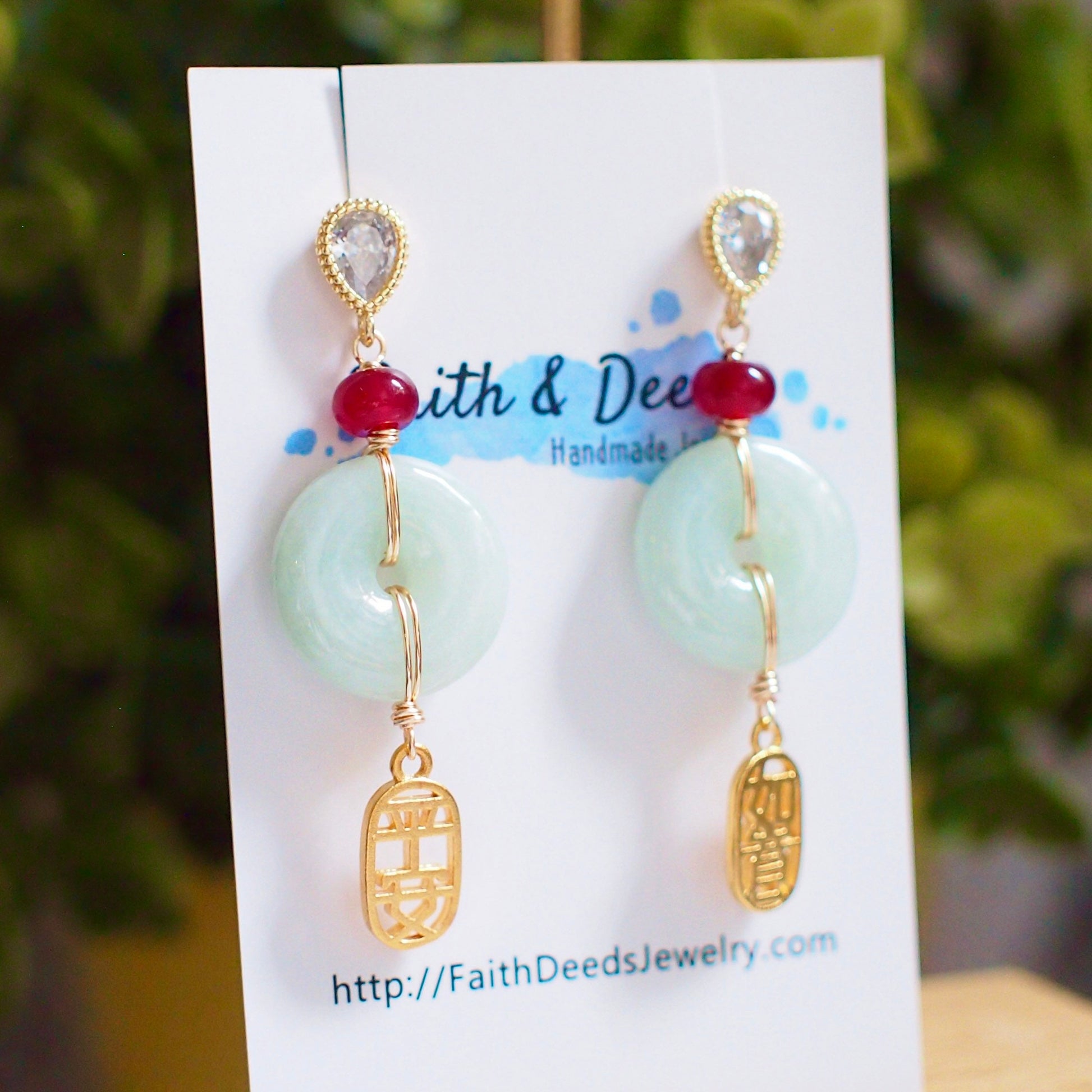 Type A Burmese Jade Donut Earrings // Red Chalcedony // Charms of Blessings // 14K Gold-filled // Oriental Theme