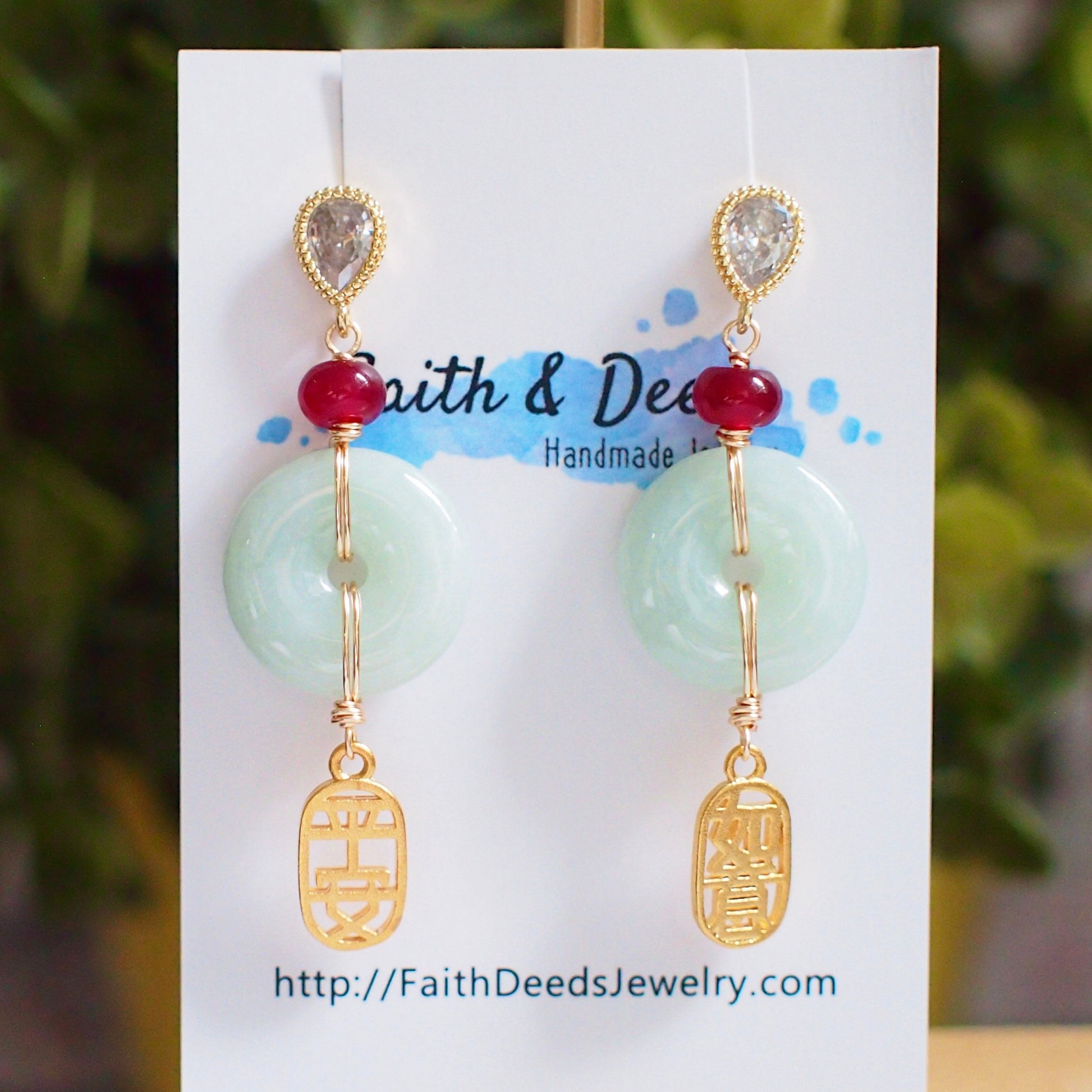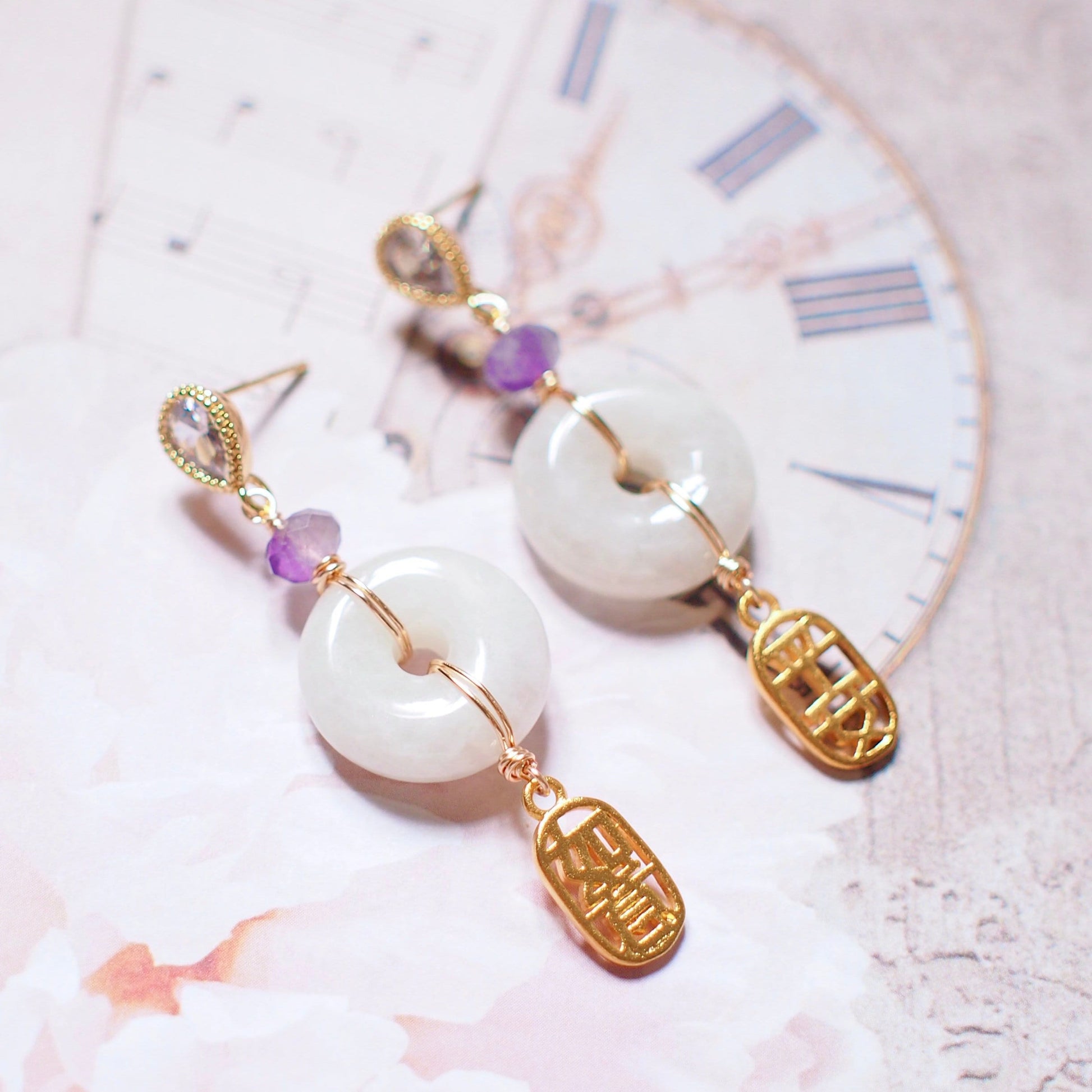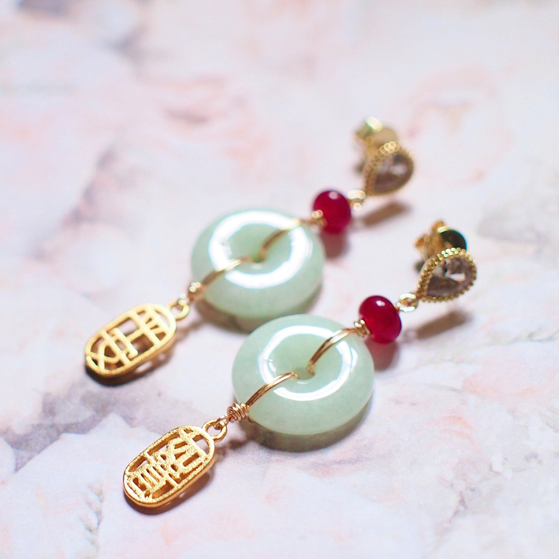 Unique and elegant. These beautiful earrings are made with Type A Burmese jade donuts in light apple green colour and red chalcedony rondelle for an oriental look. Also featuring 2 gold-plated charms with Chinese characters “平安” and “如意” that mean “peace” and “as one wishes” respectively. This design would be great choice for gifts if you want to convey your blessings in a special and delicate way. You may also go for an alternative version that uses white jade donut and amethyst rondelle. (See the last picture)
