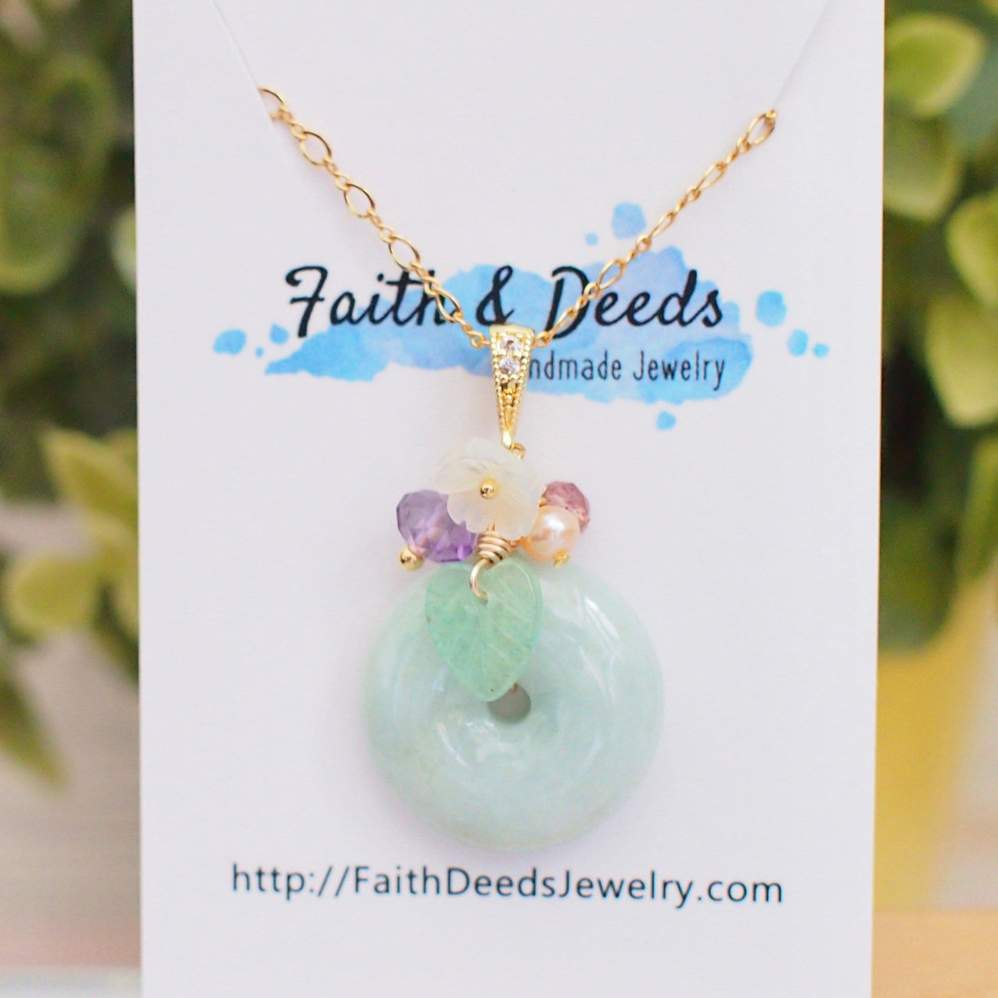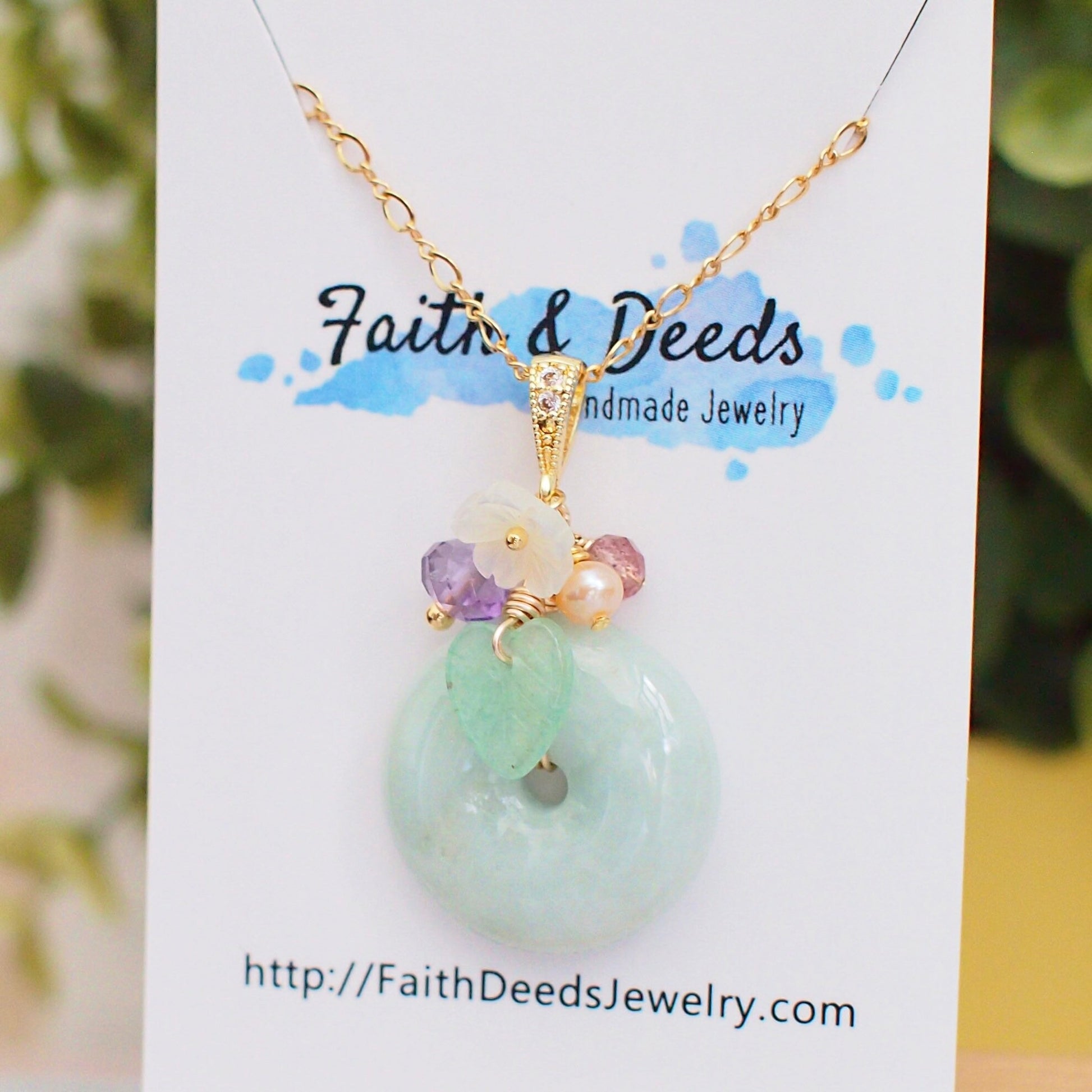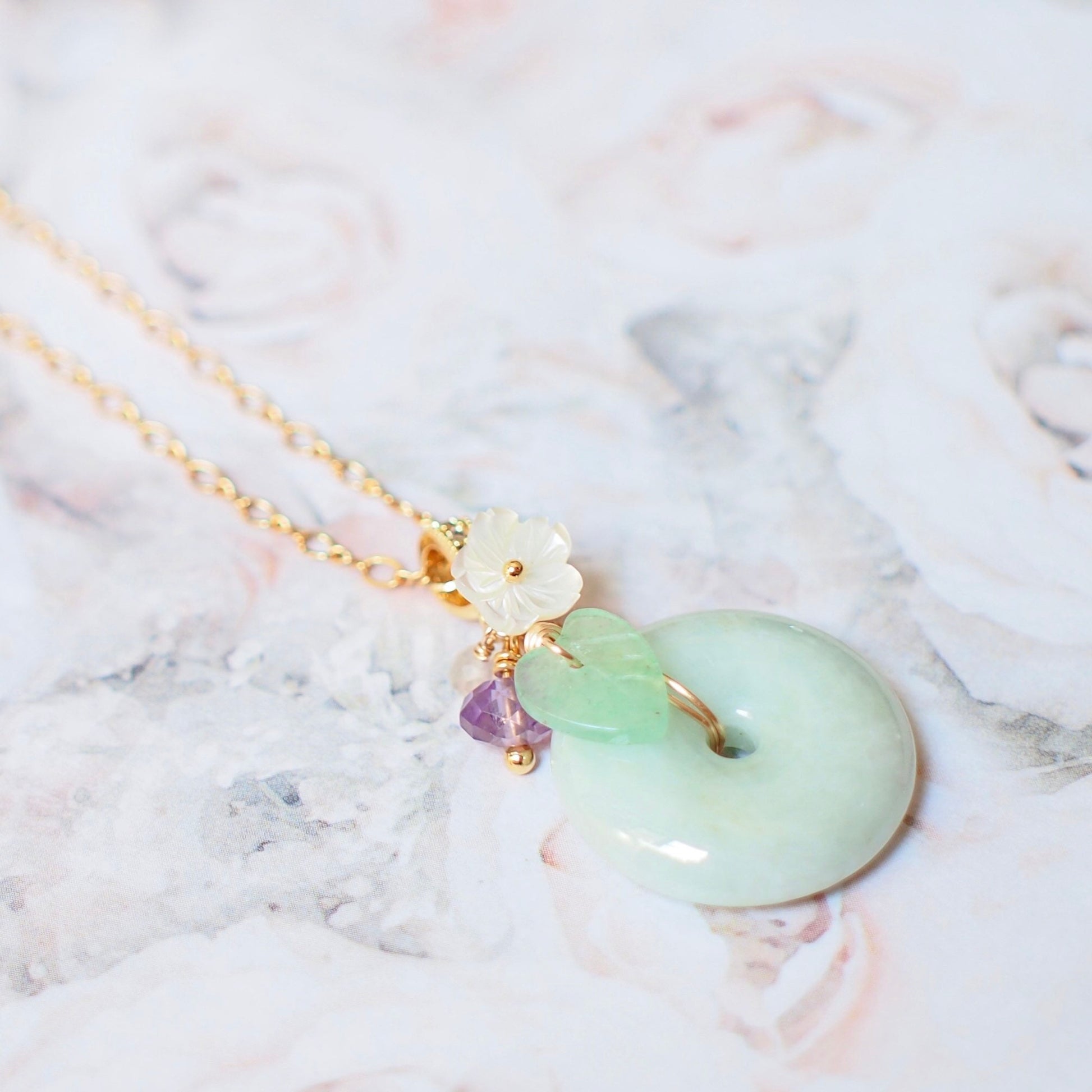 This beautiful long necklace is featuring a type A Burmese jade donut in light apple green colour dressed with a simple gem clusters of aventurine leaf, amethyst, moonstones, strawberry quartz, champagne pearls and mother-of-pearl flower cabochon. A graceful and sweet design that can enhance your daily look instantly.
