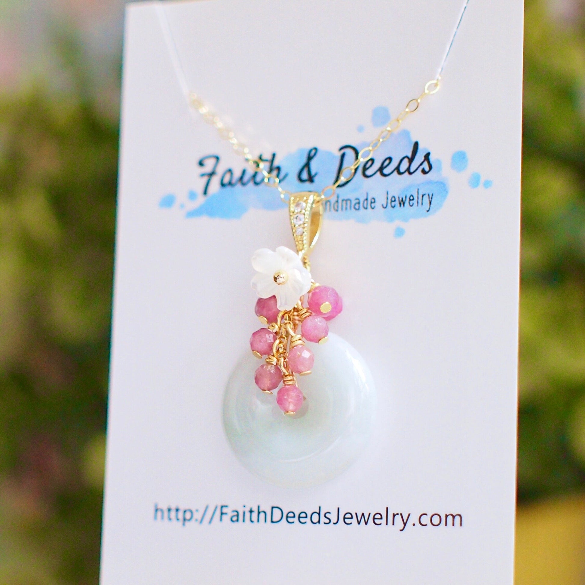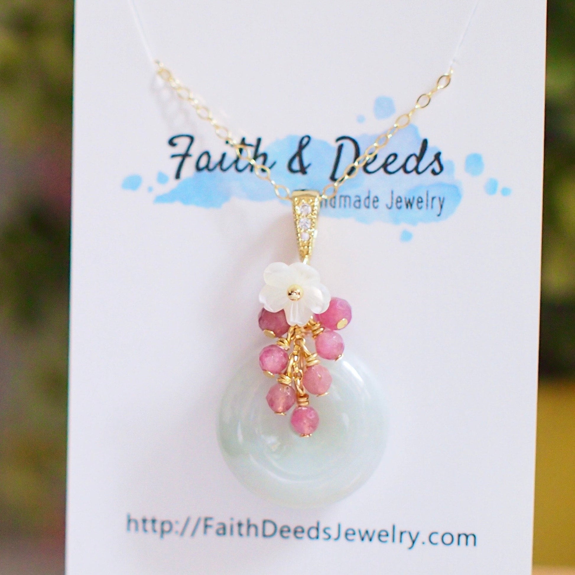 Type A Burmese Jade Donut Pendant // Pink Tourmaline Cluster // 14K Gold-filled
