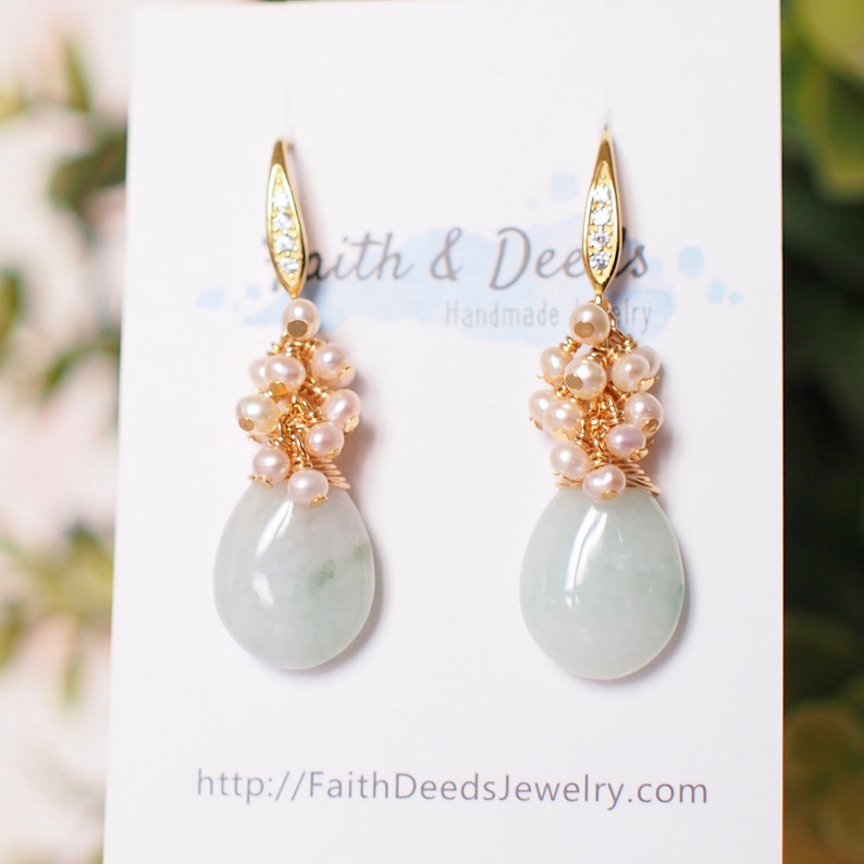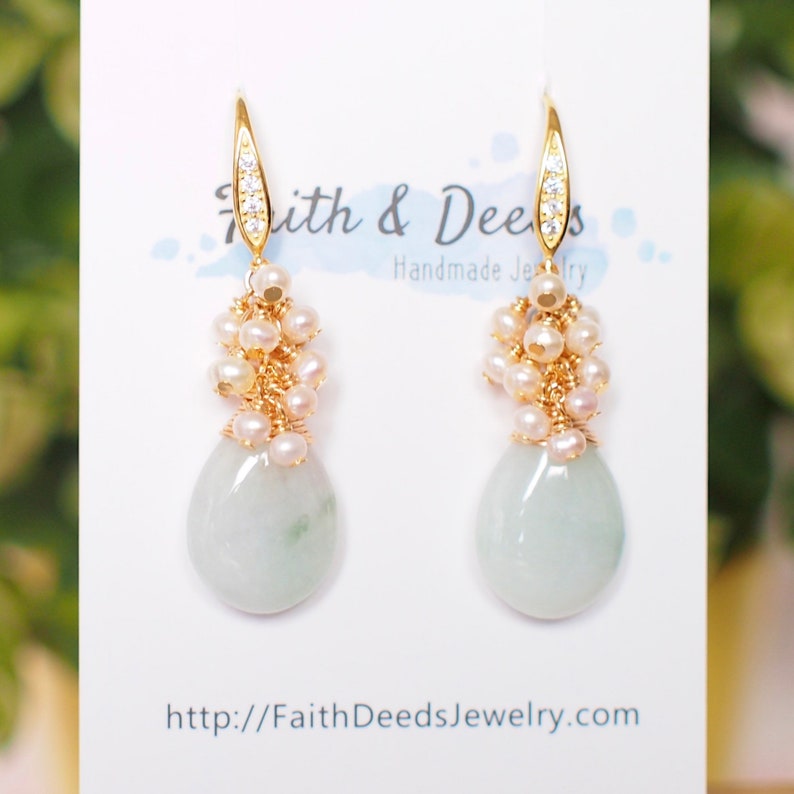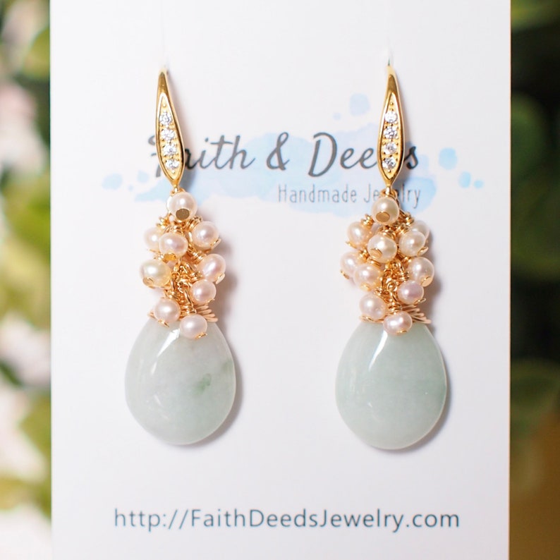 Type A Burmese Jade Drops Earrings // Pearl Cluster // 14K Gold-filled // Elegant & Stunning