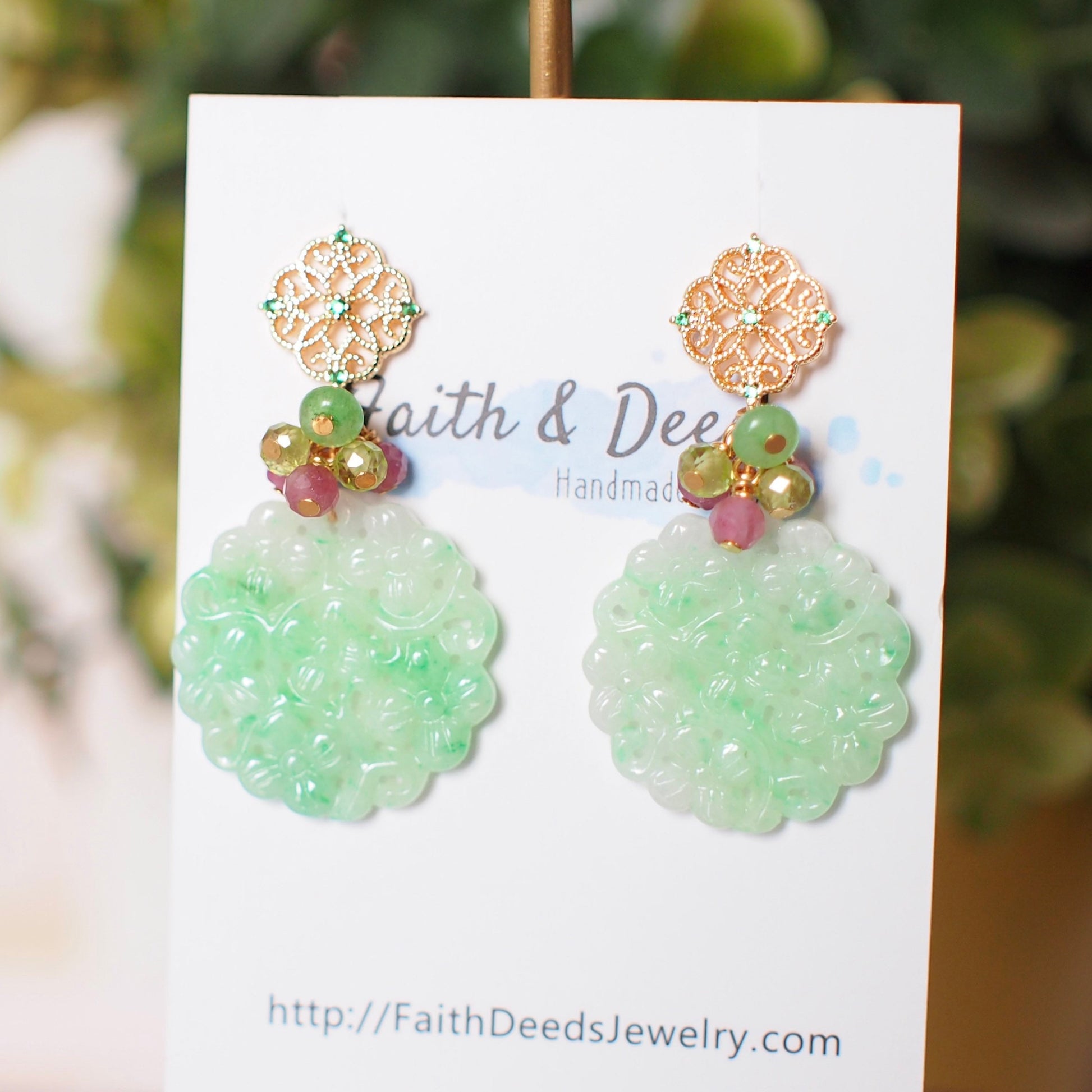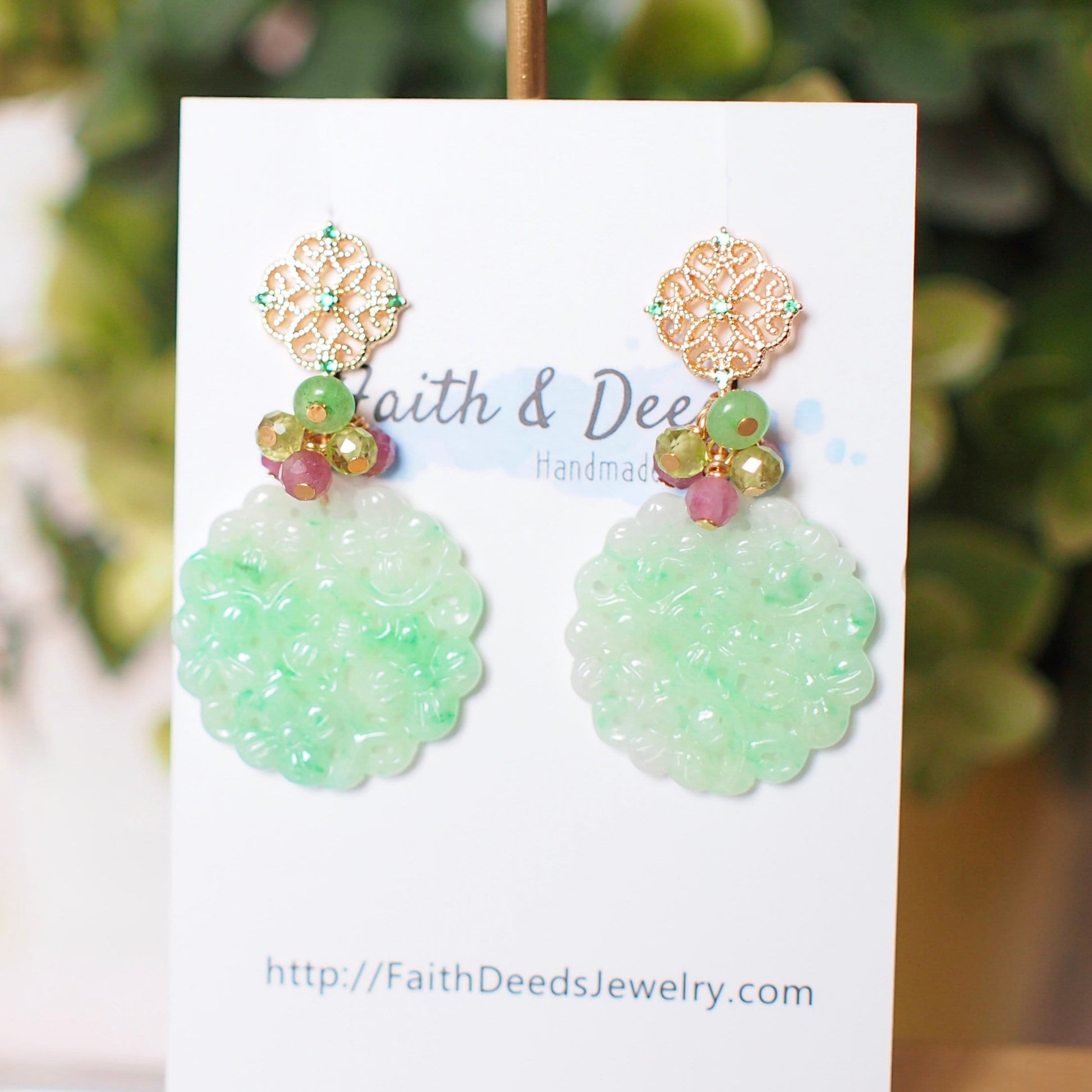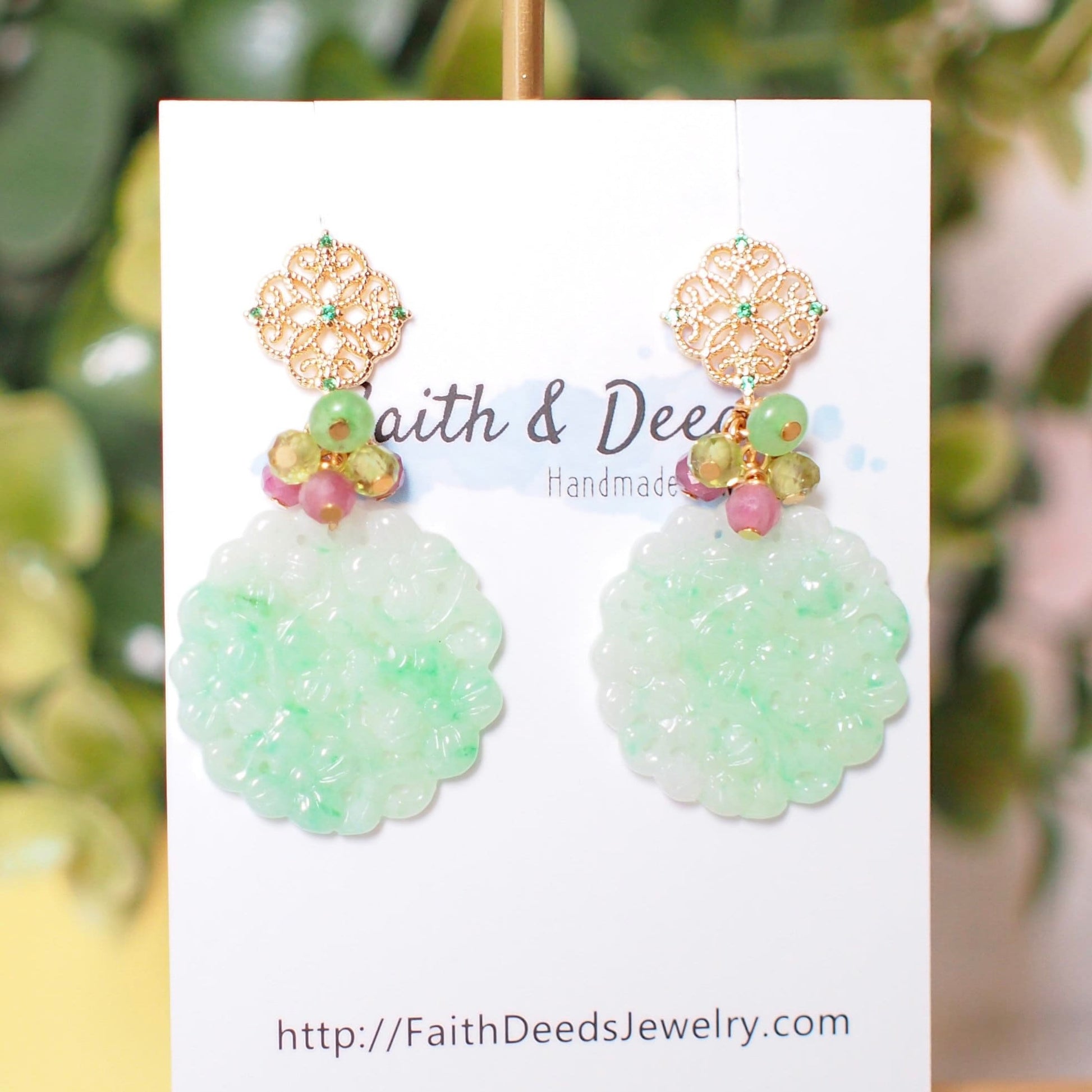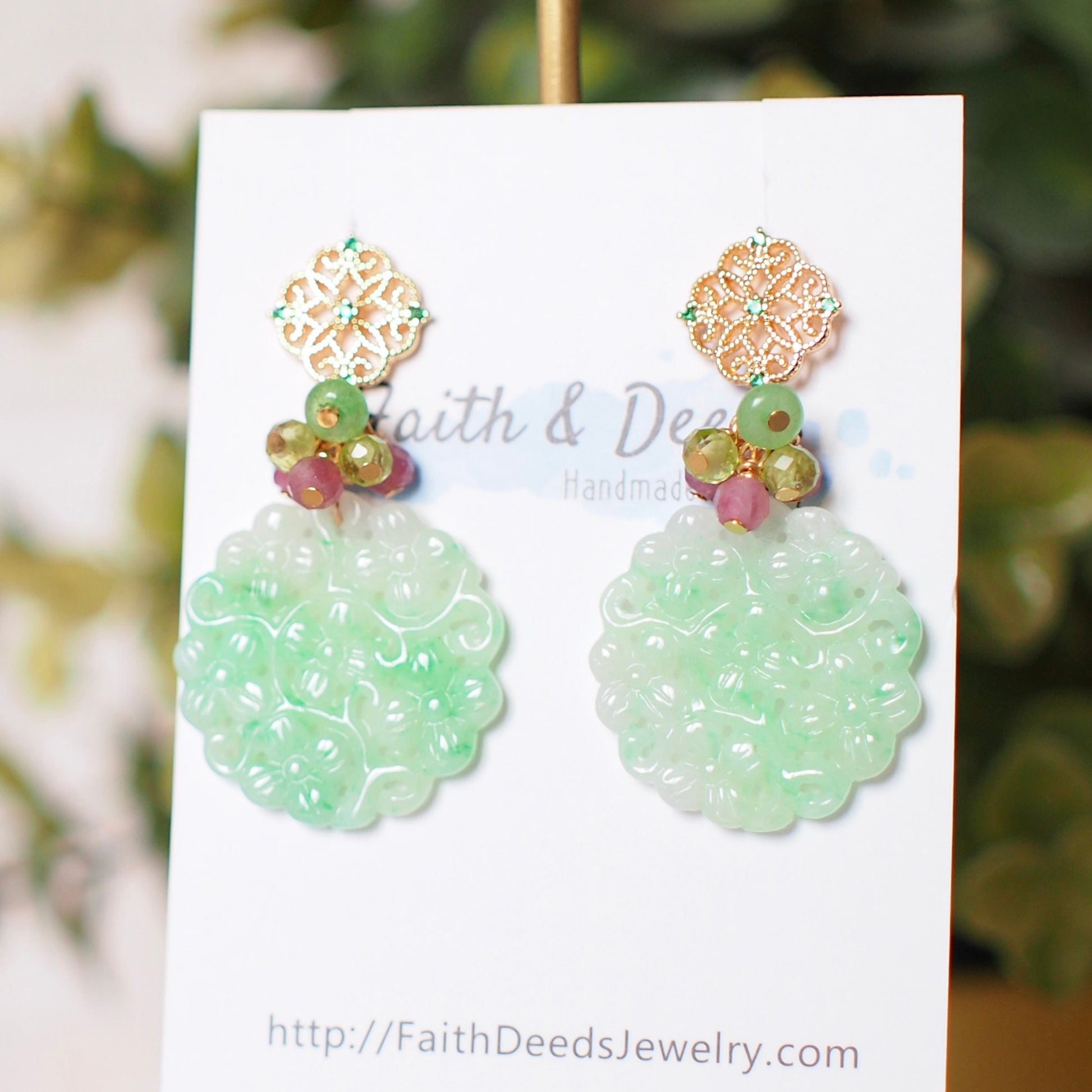 Modern and elegant. These beautiful earrings are made with type A round, carved jadeite with gorgeous and meticulous floral carving in them, dressed with a simple gem clusters of pink tourmaline, peridot and chalcedony. A feminine and classy design that can enhance your daily look instantly.