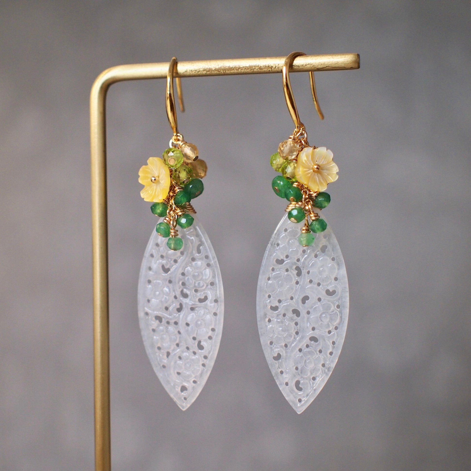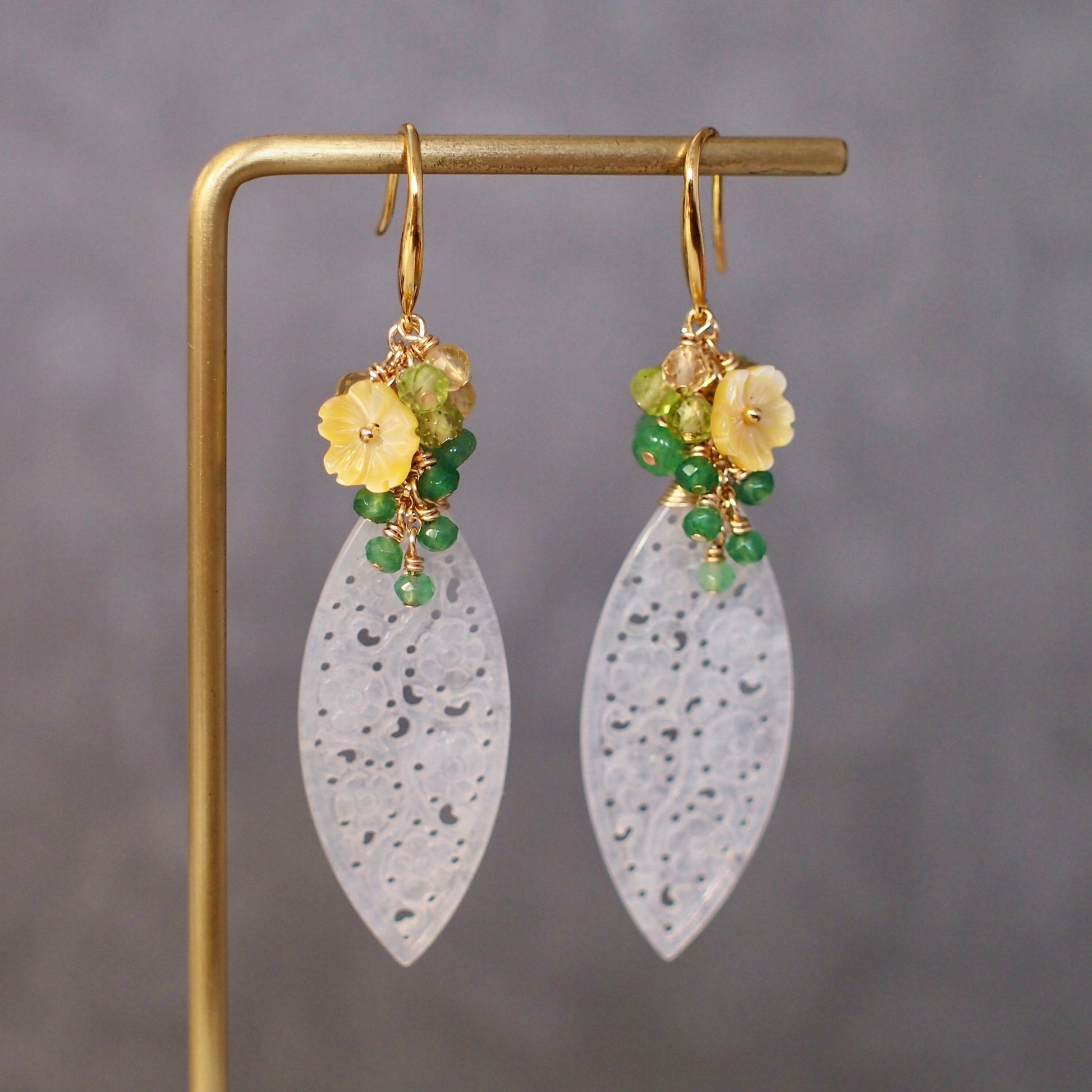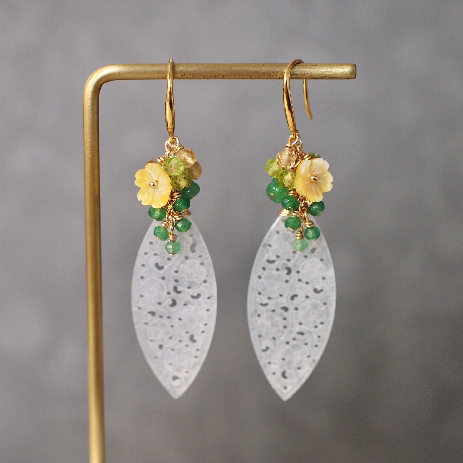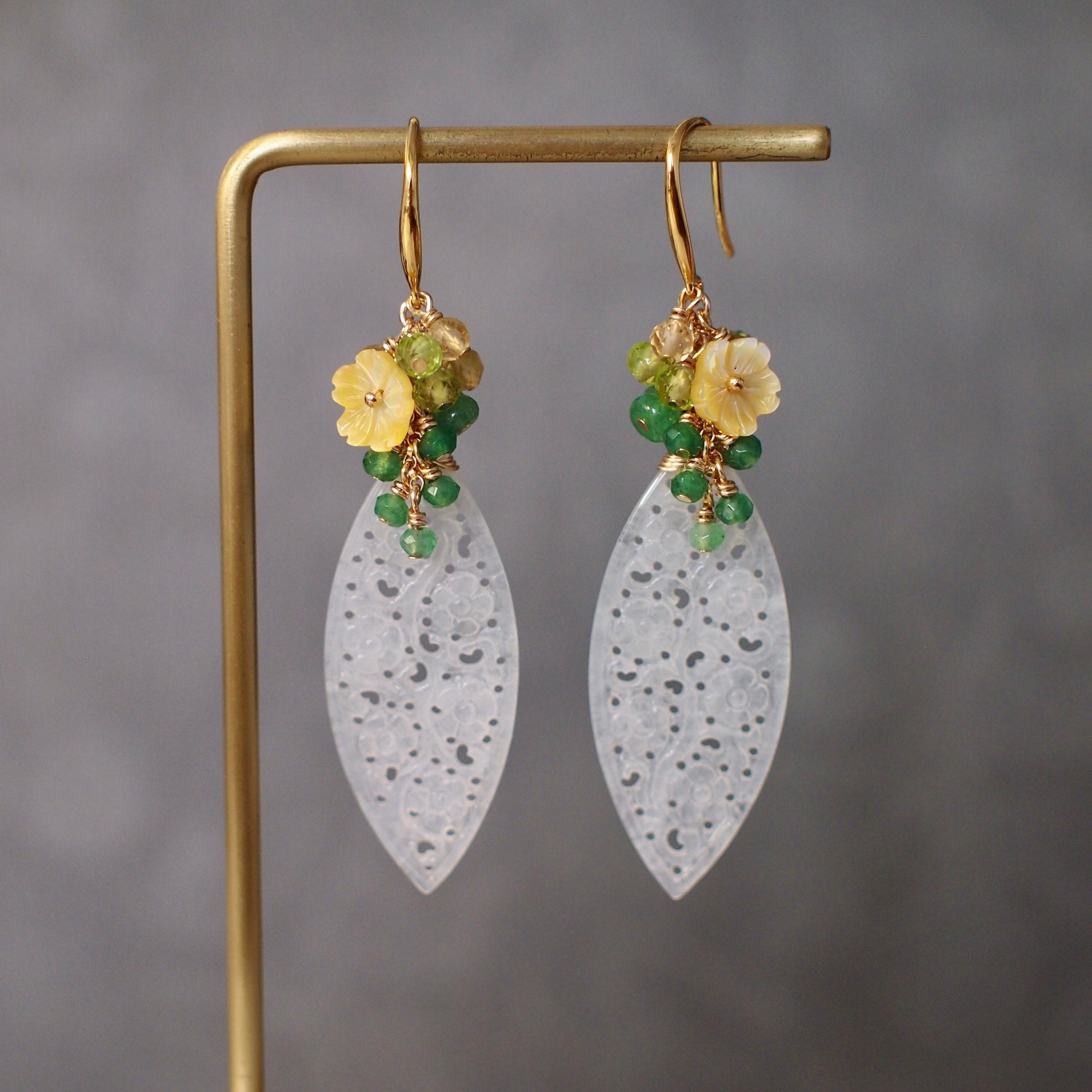 Modern and elegant. These beautiful earrings are made with type A carved jadeite in icy white colour, dressed with a sparkly gem clusters of aventurine, peridot, citrine quartz and yellow flower cabochons made with mother of pearl. A slightly more elaborated and elegant design that can enhance your daily look instantly.