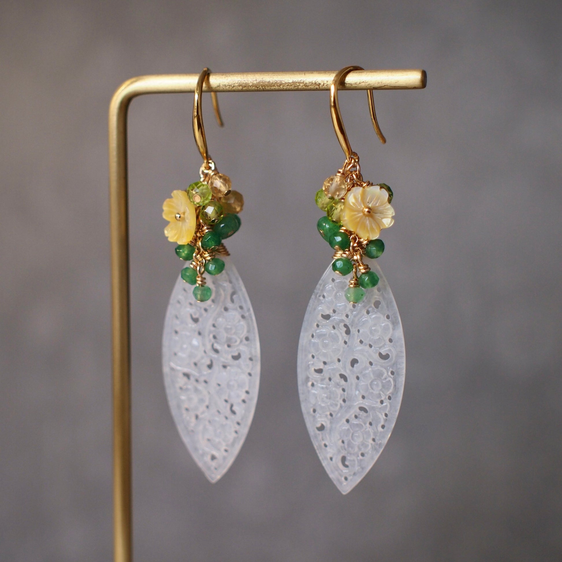 Type A White Carved Jadeite Statement Earrings // Gem Cluster // Aventurine x Peridot x Citrine Quartz // 14K Gold-filled// Modern & Elegant