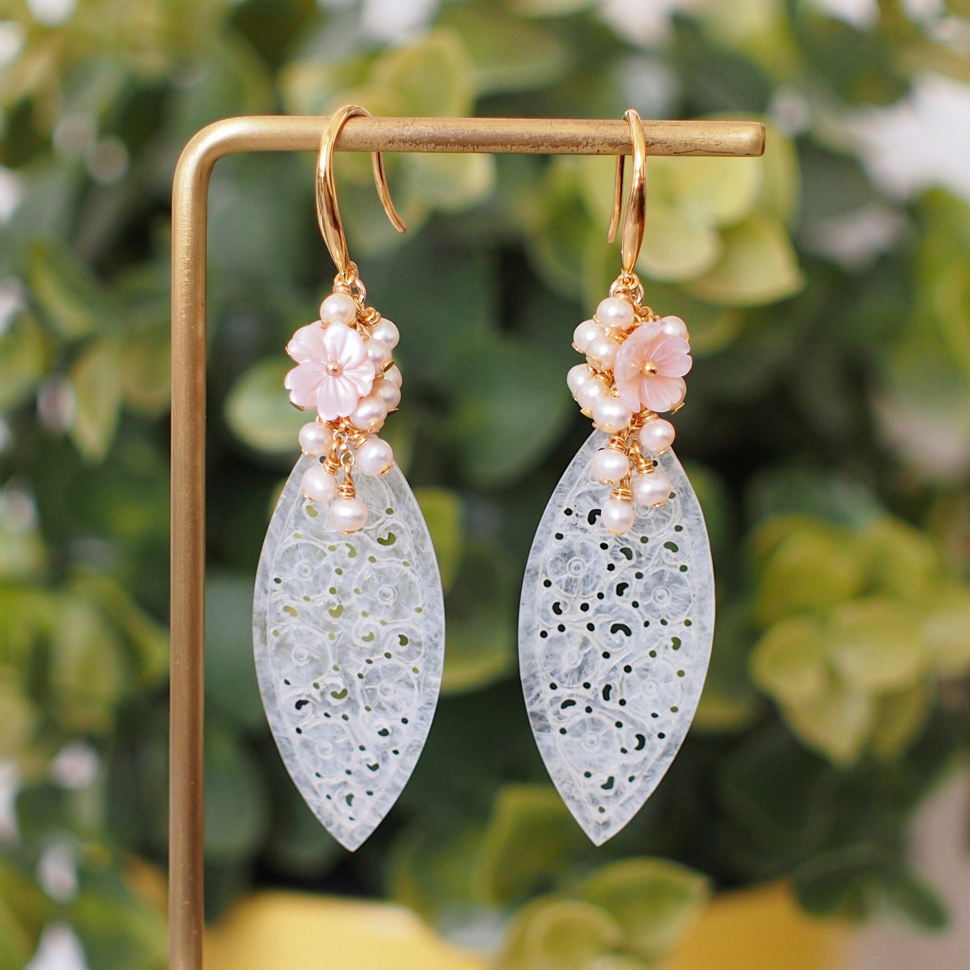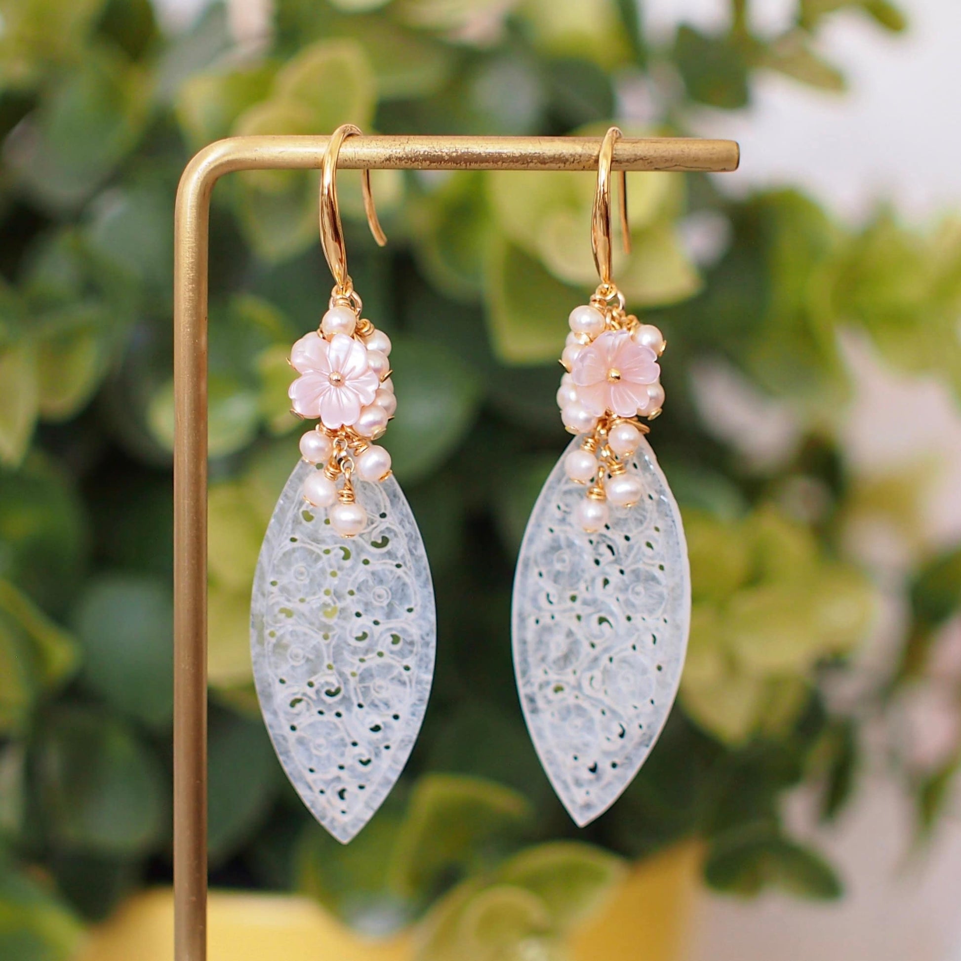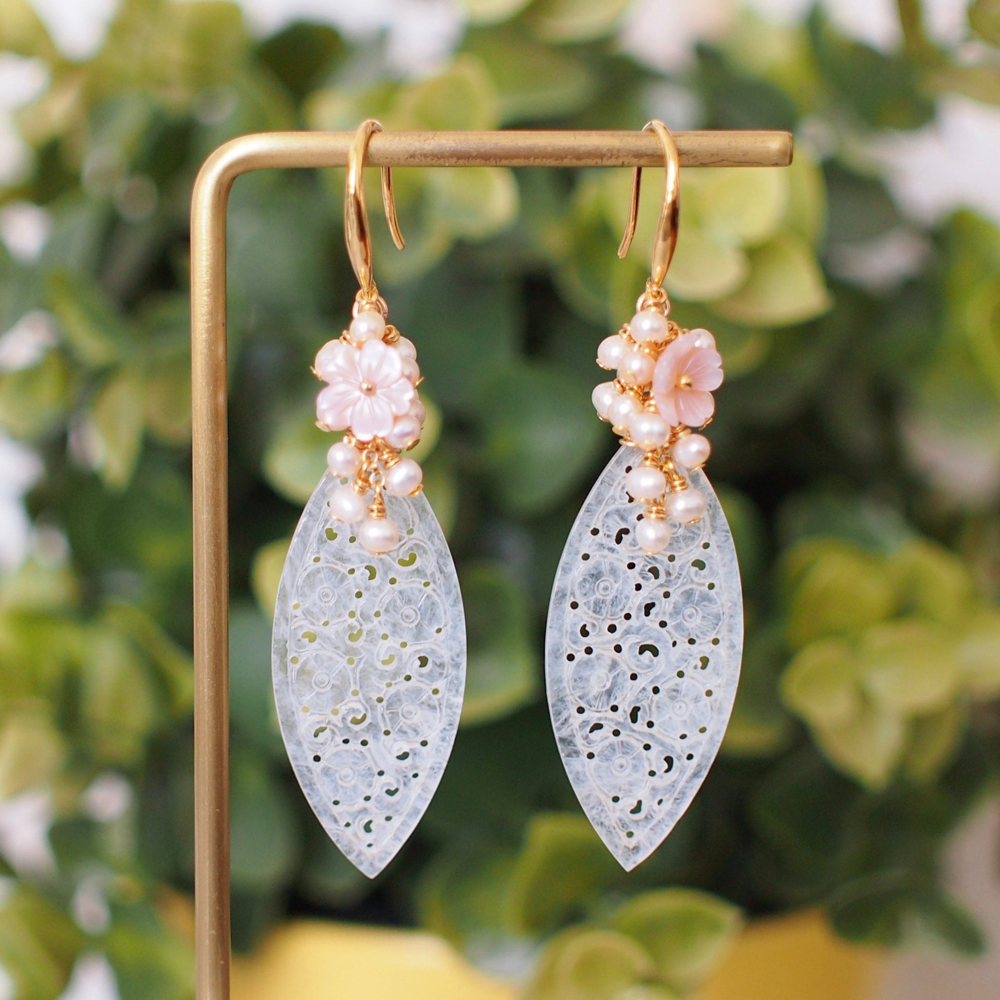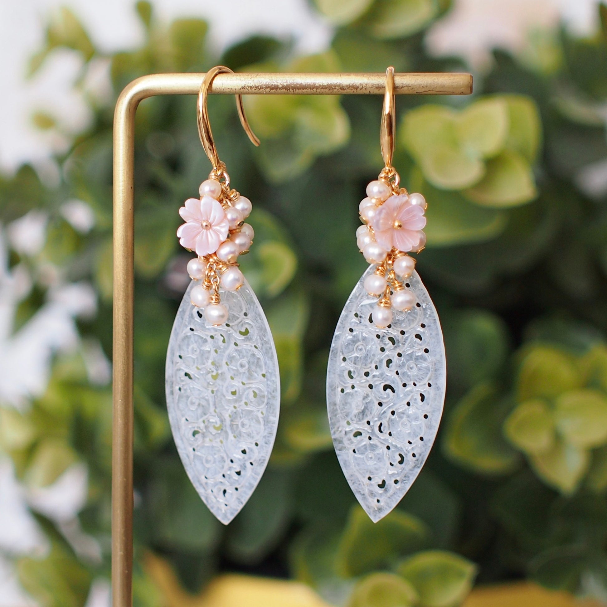 Romantic and sweet. These beautiful earrings are made with type A carved jadeite in icy white colour, dressed with fresh water pearls cluster and pink flower cabochons made with mother of pearl. A slightly more elaborated and elegant design that can enhance your daily look instantly.