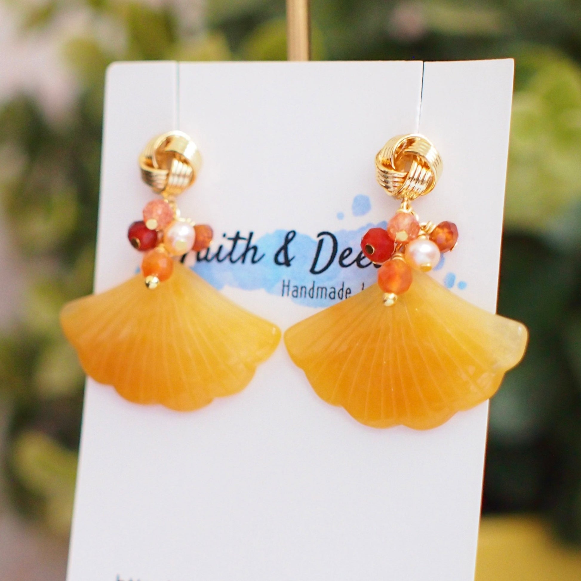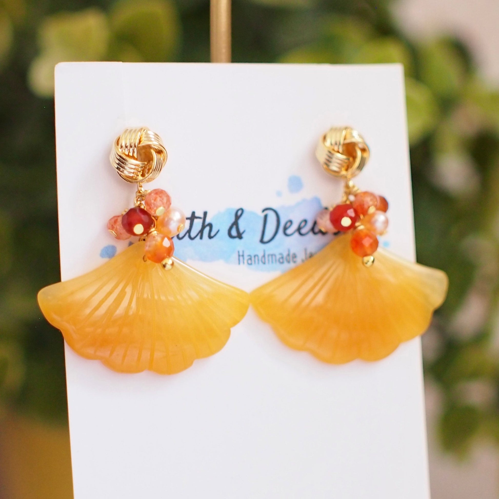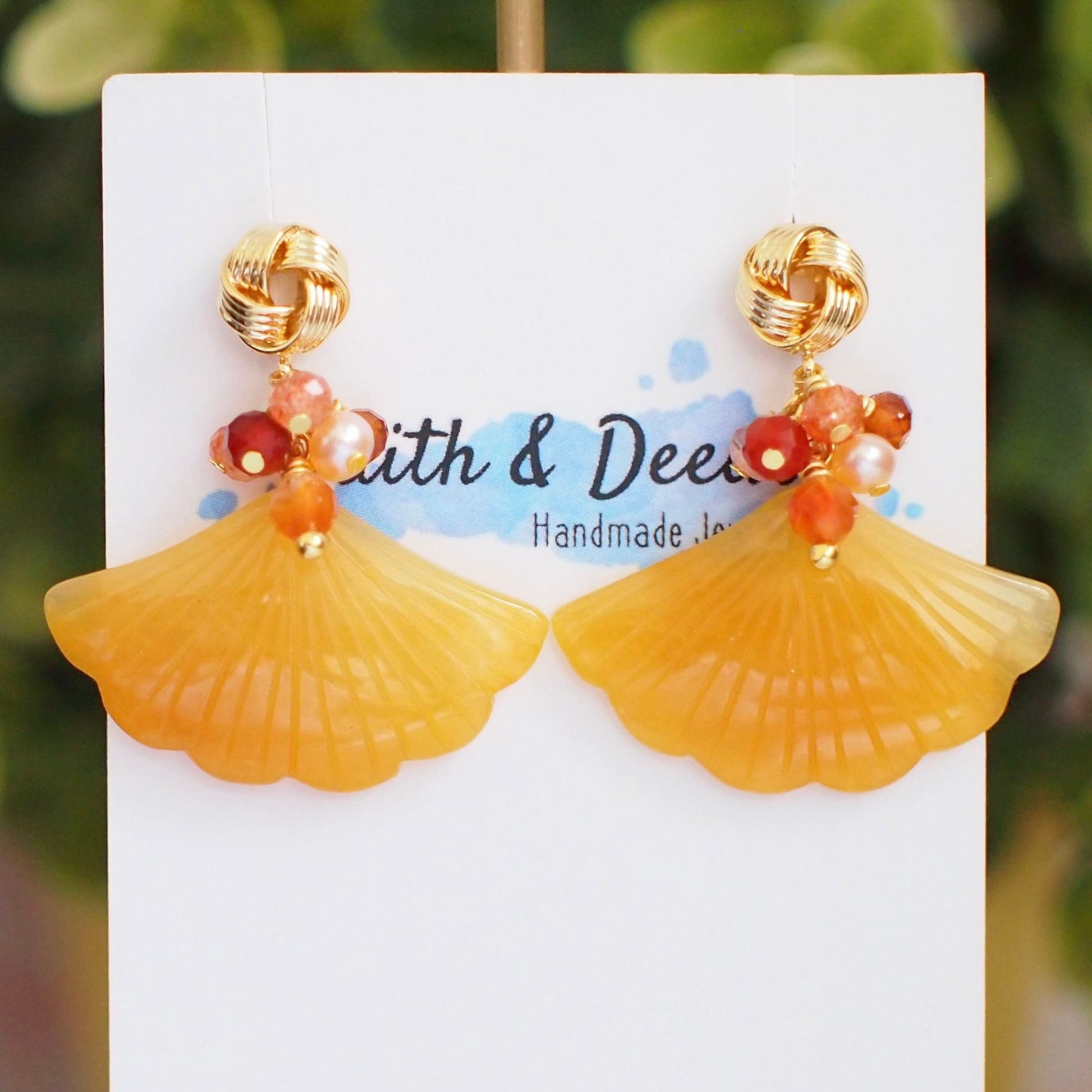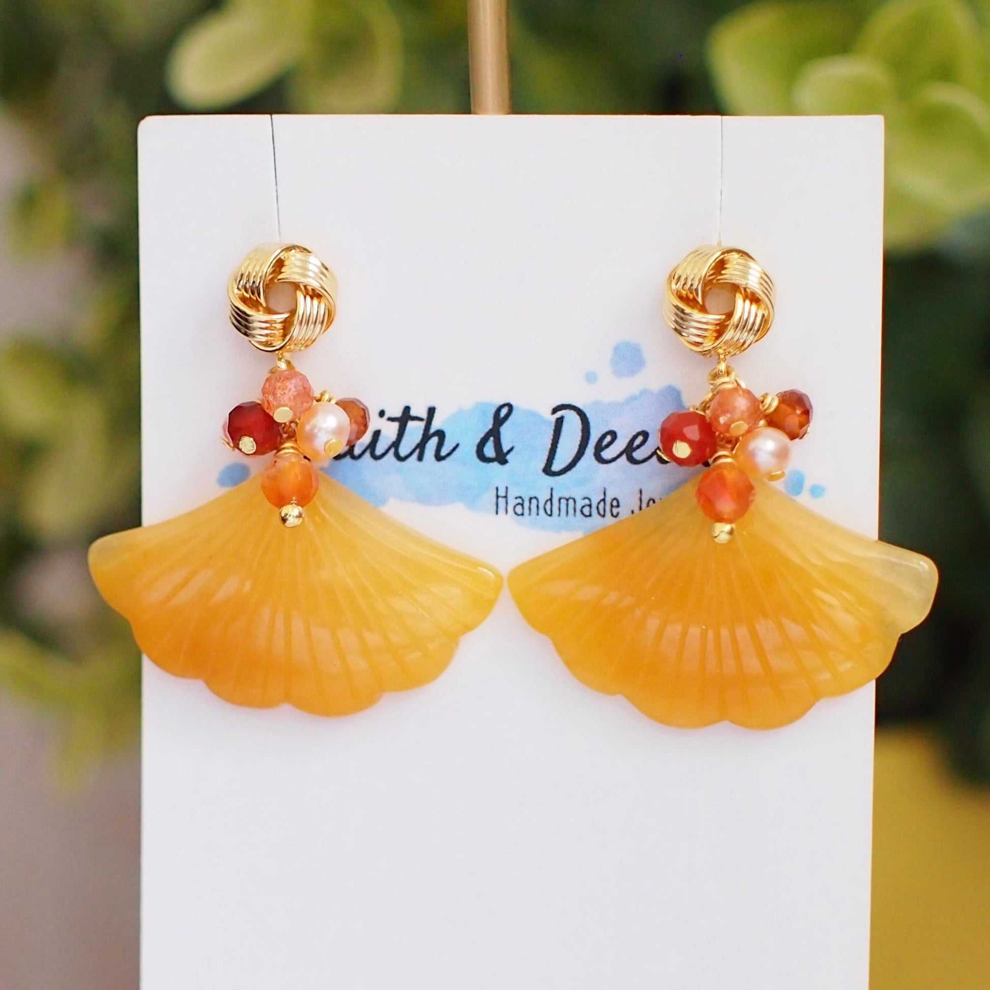 Gorgeous and fun. These beautiful statement earrings are featuring 2 type A yellow jade in ginkgo leaf cut with amazing colour! Dressed with a complimenting gem clusters that are made up of faceted agate, sunstones, garnet and fresh water pearls, these would be an incredibly gorgeous choice for every special occasion.