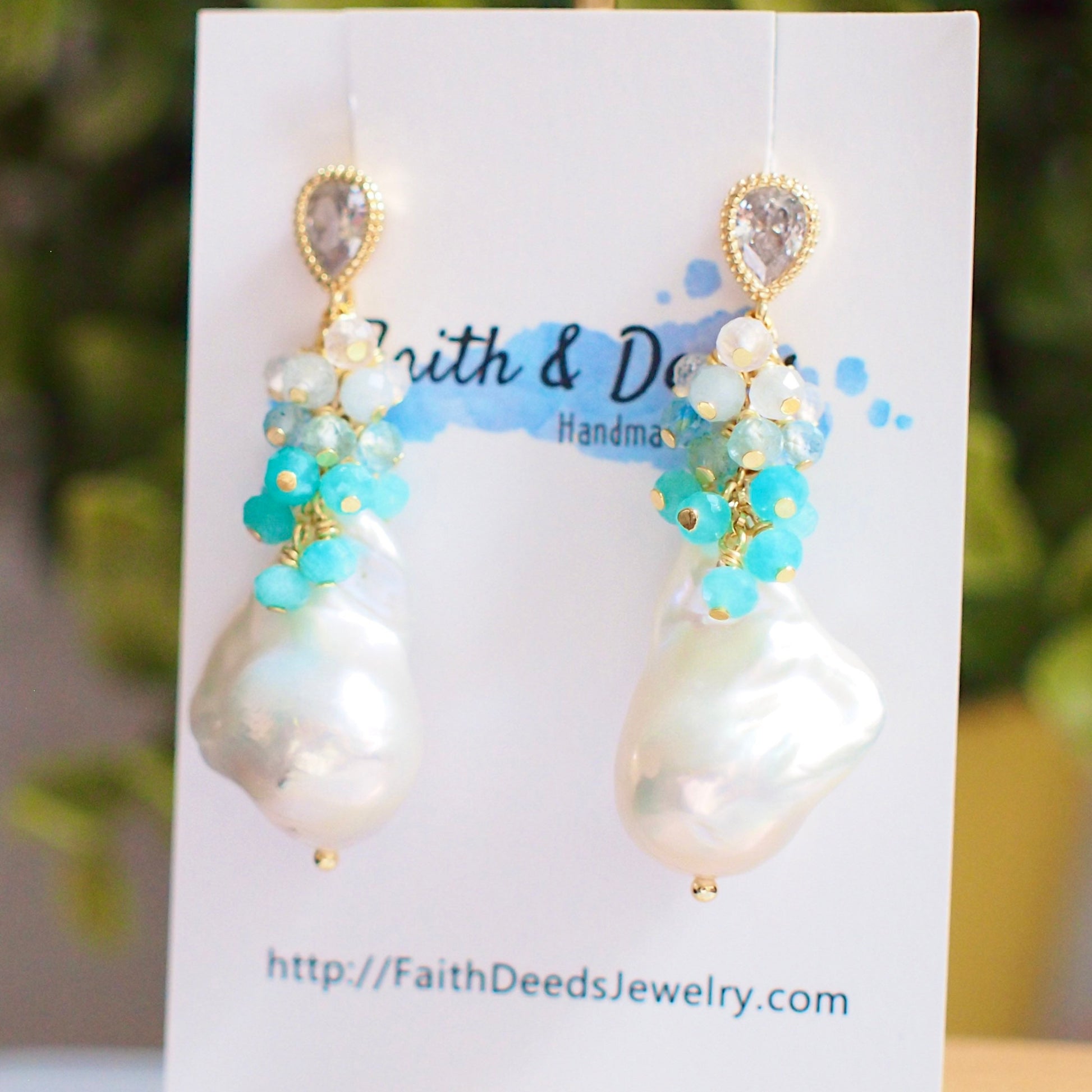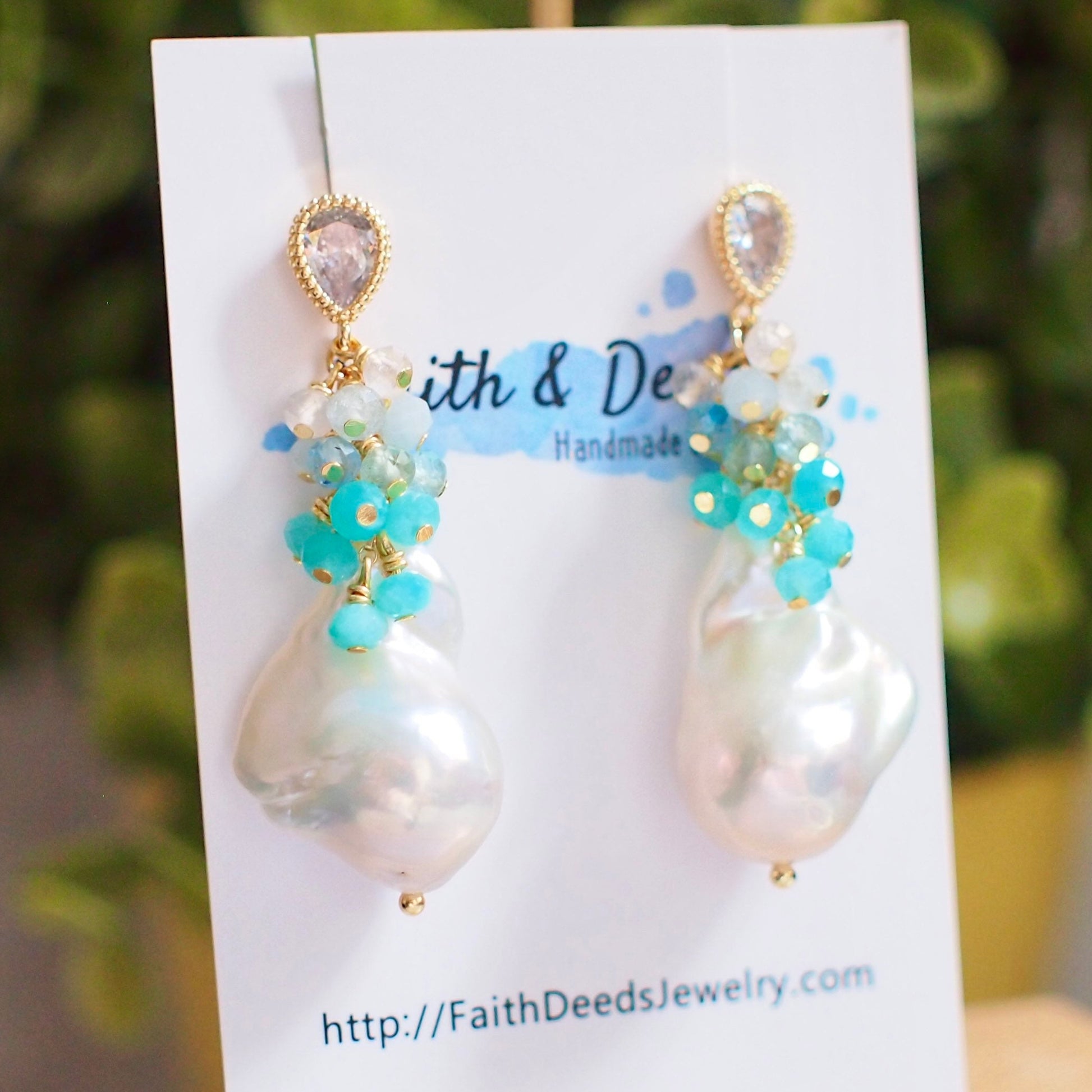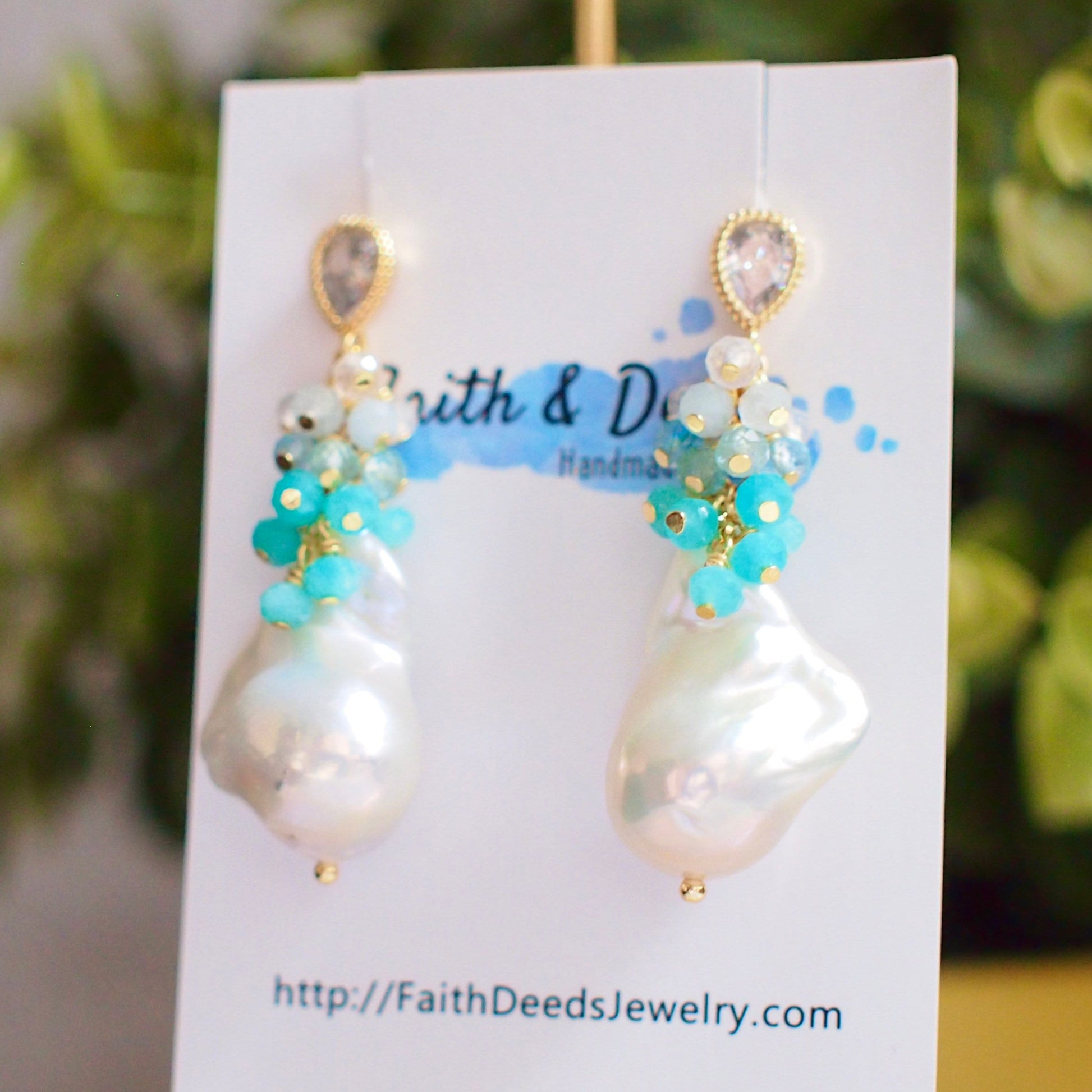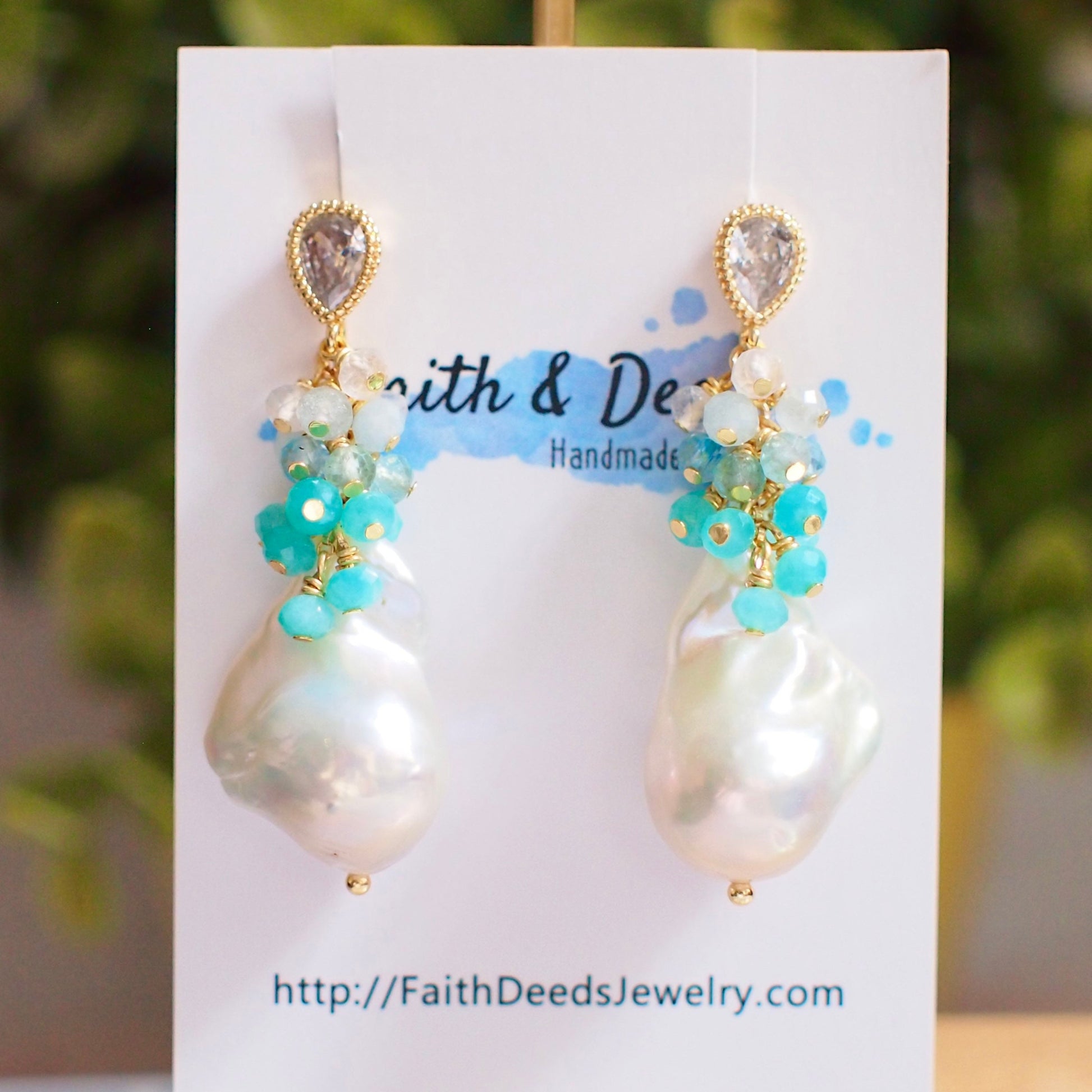 These beautiful earrings are featuring 2 white baroque “flameball” pearls with great lustre. Accented with a blue sparkly gem cluster that’s made with faceted amazonite, apatite, topaz, chalcedony and moonstone, - inspired by the colour of the ocean, these babies will attract a great deal of attention.