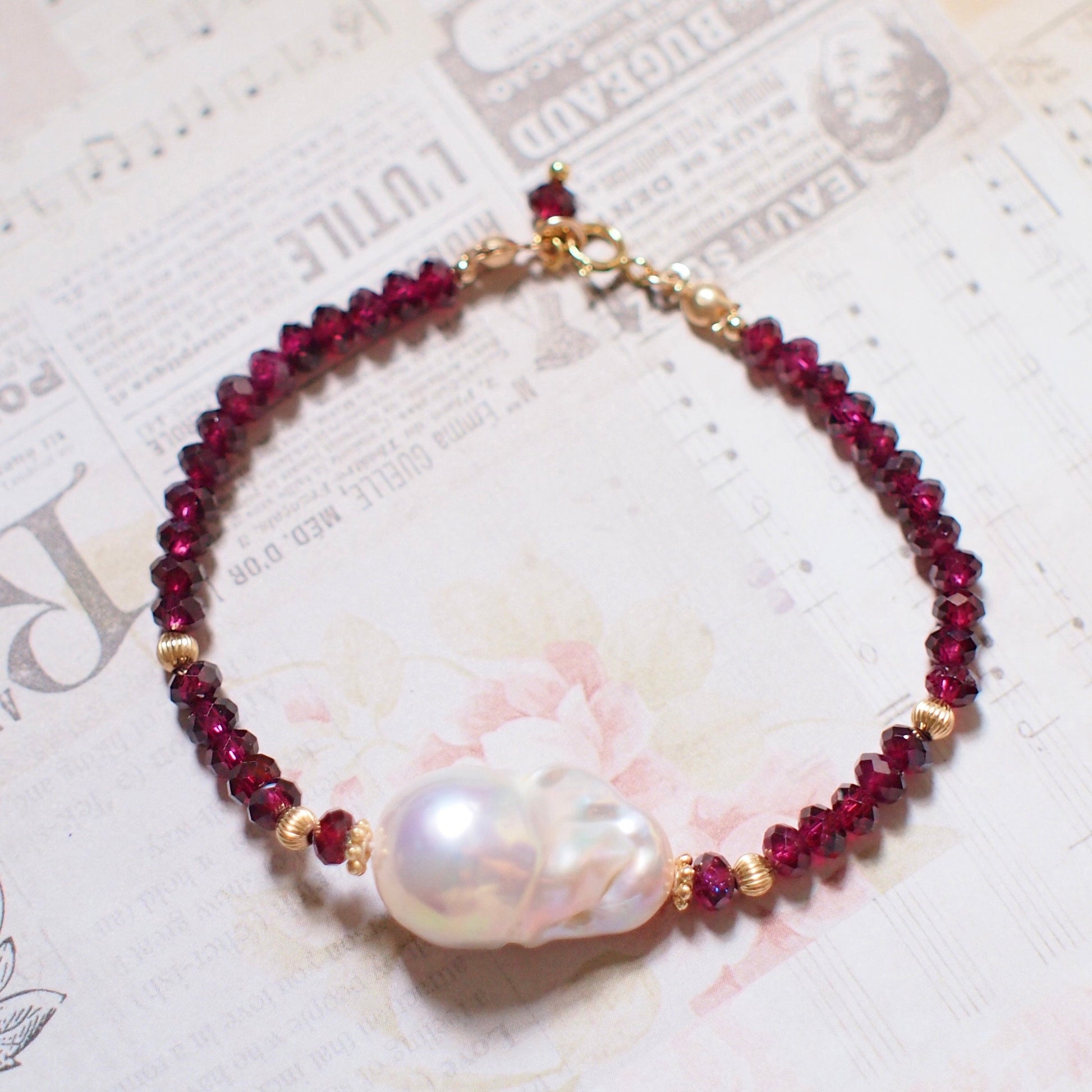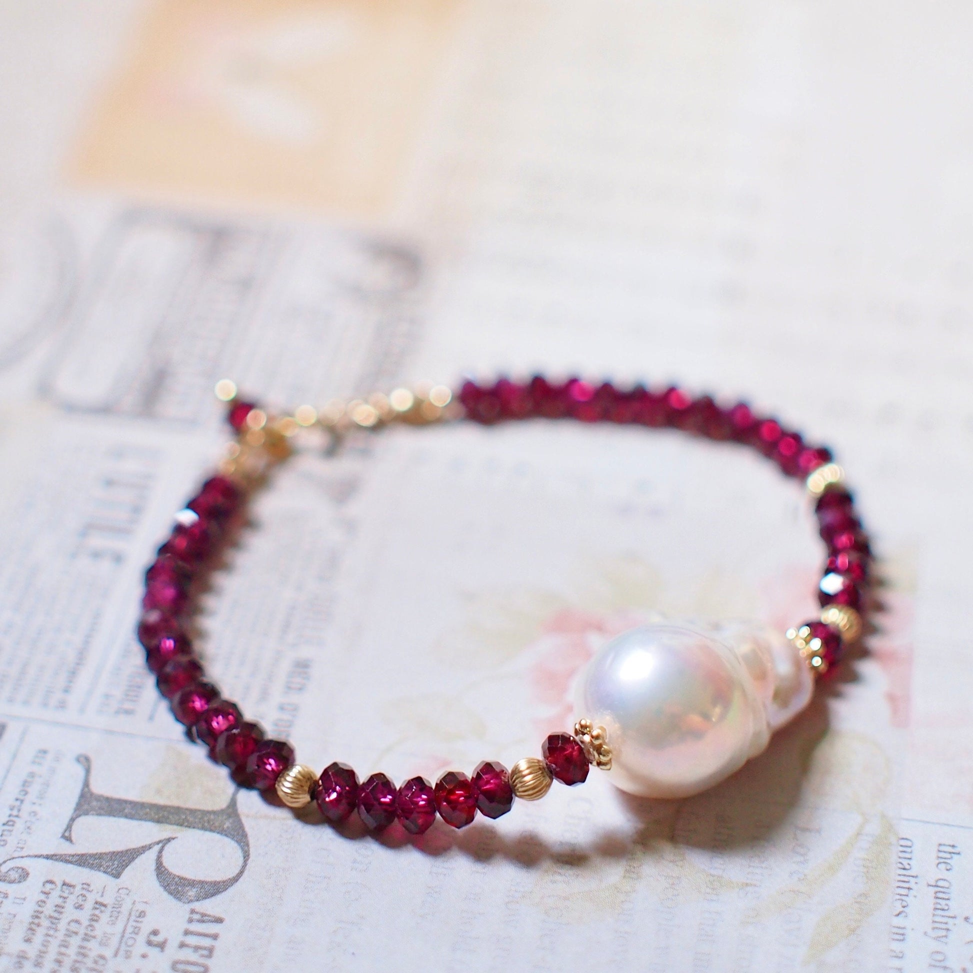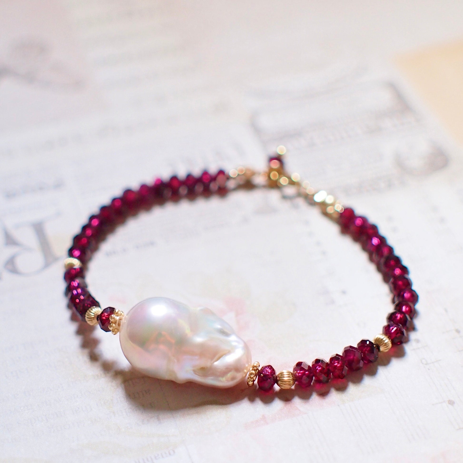 White Baroque Pearl x Garnet Bracelet // Bold & Elegant // 14K Gold-filled